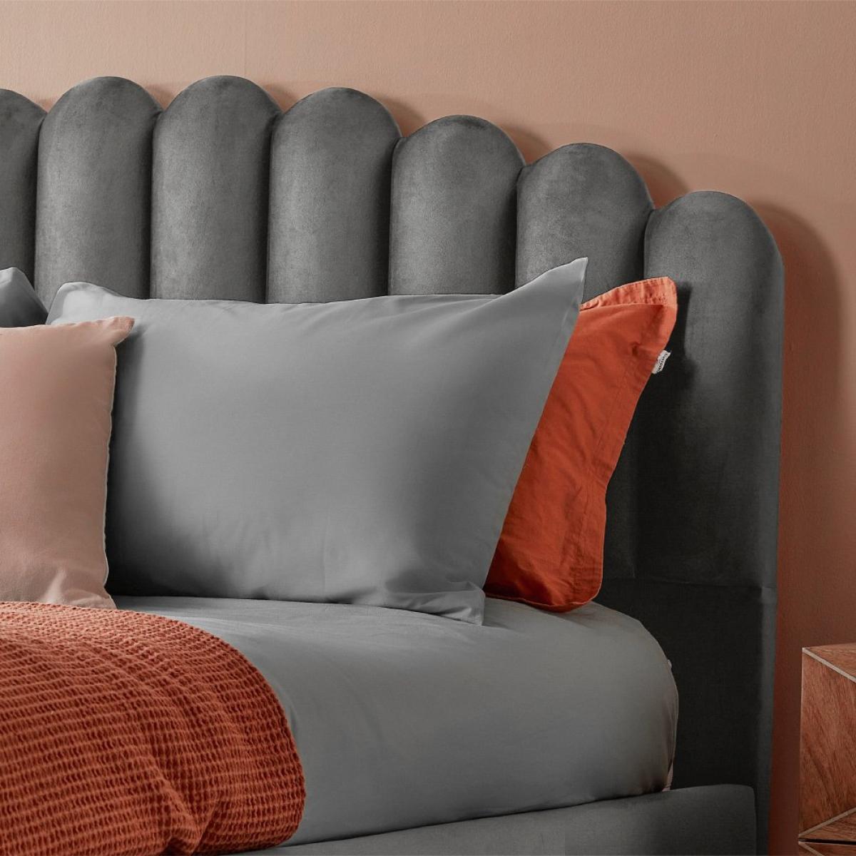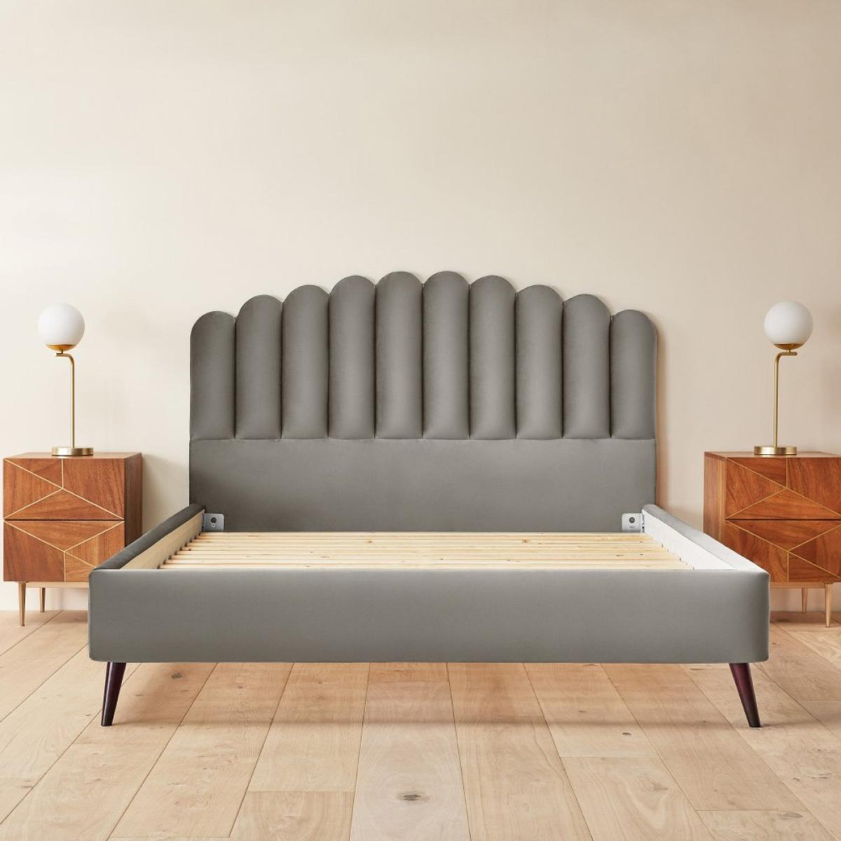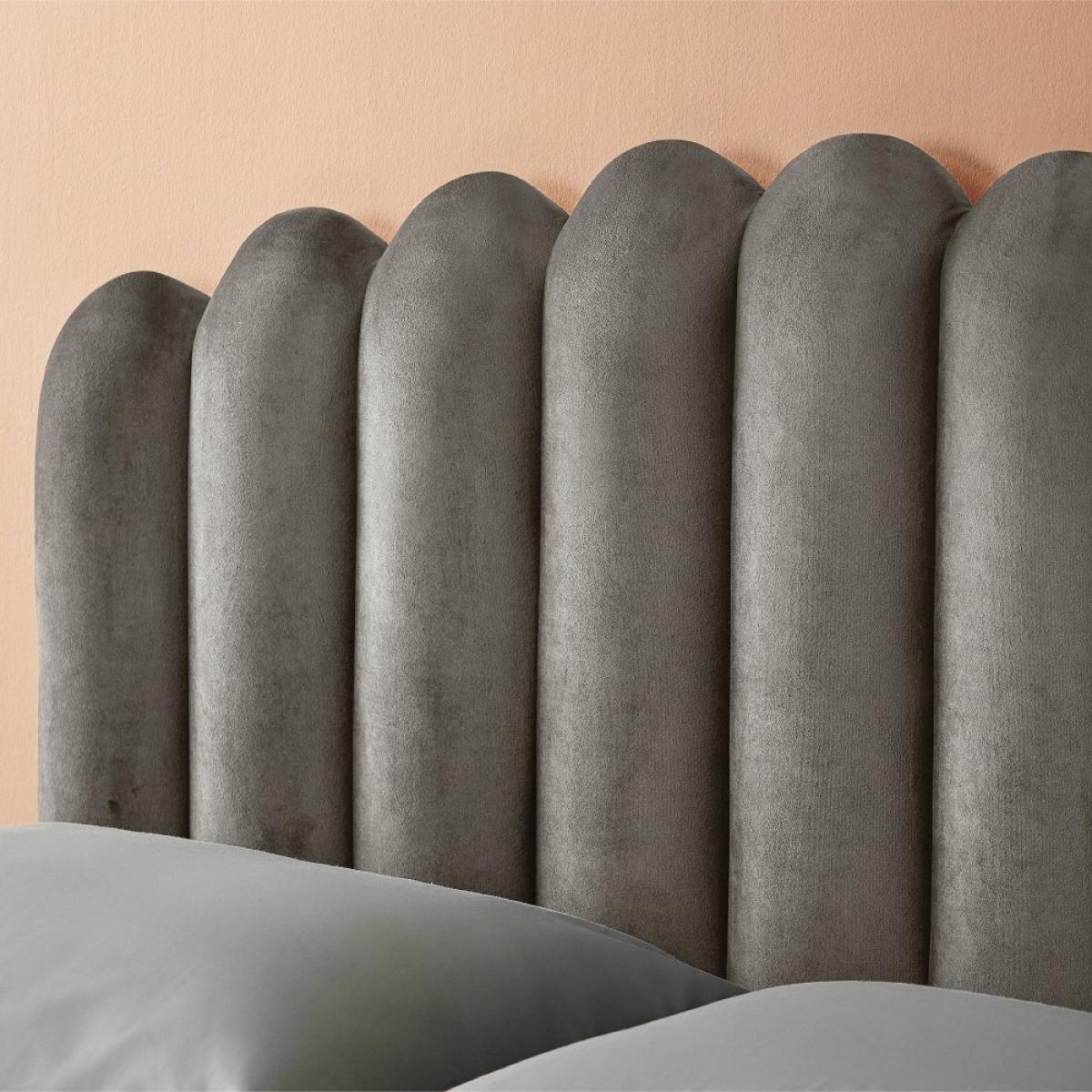 The Oriana Upholstered bed frame is designed to add a touch of glamour to any space, with a fan-shaped headboard & sumptuous finish, this trend-led bedframe will set the tone for the rest of your room. Handcrafted here in the UK, upholstered in a luxury velvet fabric available in a range of colours, so you can find the right style to suit you. For ultimate comfort the headboard is filled with plush soft cushioning, to support you on those lazy mornings. Complete with slanted wooden legs, the Oriana makes its mark in any space. Adjustable side rails can be rotated to accommodate a deep or shallow mattresses. Whilst the wooden slatted base provides excellent mattress support and airflow. Our made to order furniture service means you can choose from different options, such as fabric, size and shape to create a beautiful bespoke piece of furniture. Because this piece is designed just for you, you might notice the delivery time is a little longer than usual. Oriana's trend-led flair sets the tone in your bedroom. Make a statement with a choice of rich velvet colours - known for it's sensual feel and low sheen which makes it a timeless favourite in home interior design. Part of the Oriana collection. Upholstered frame. Velvet fabric - 100% polyester. Wooden feet. Base with wooden slats. No storage. Size W193.5, L215.5, H36.5cm. Total maximum user weight 220kg. Self-assembly - 2 people recommended. Package Dimensions: Package 1 dimensions: H101, W194, D8cm. Package 1 weight: 22.2kg. Package 2 dimensions: H25, W24, D223cm. Package 2 weight: 32kg. Package 3 dimensions: H29, W182, D8.5cm. Package 3 weight: 19kg. General Information: By choosing FSC certified products, you are supporting responsible management of the world's forests. Manufacturer's 5 year parts and labour guarantee.