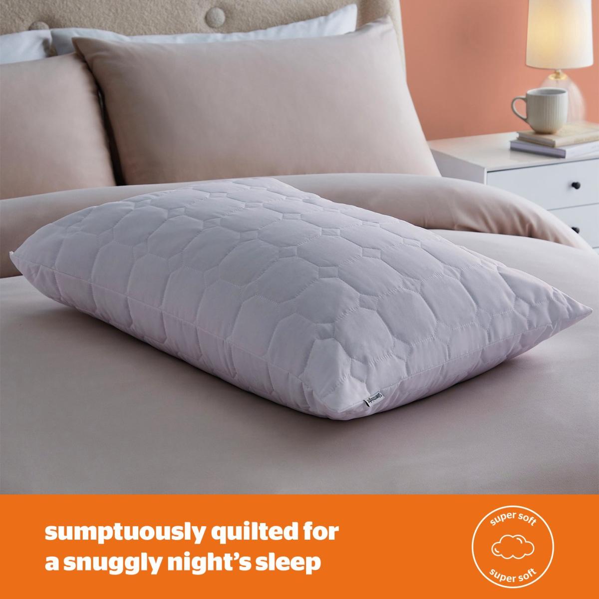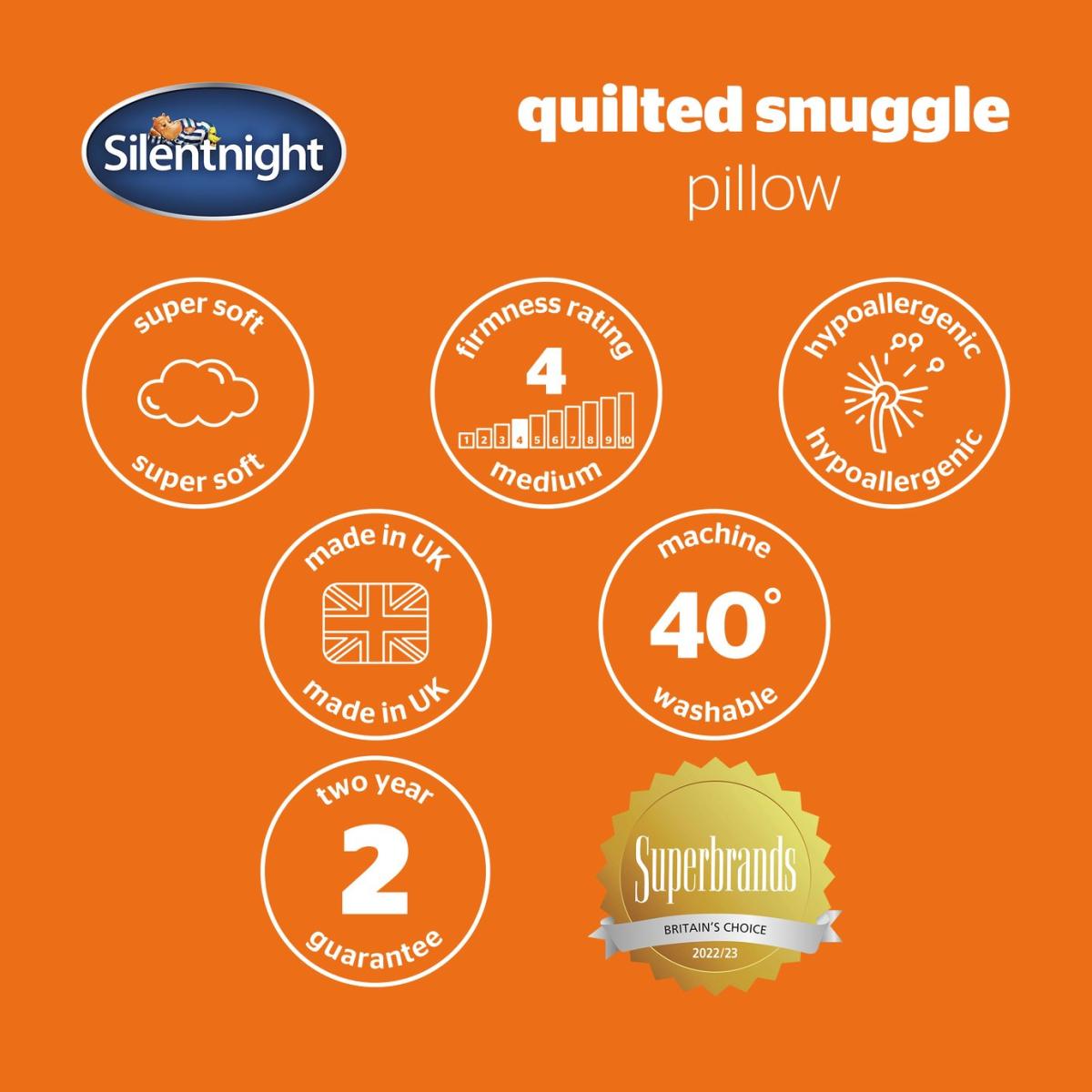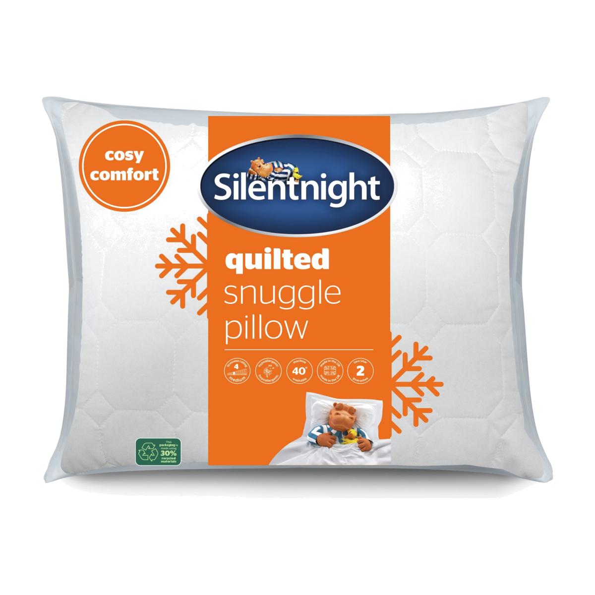Soft quilted cover, filled with snuggly fibres for the ultimate cosy night's sleep. Both the pillow and the quilted cover are generously filled with bouncy fibres to provide ultimate bedtime snuggles whilst being suitable for all sleeping positions. The Silentnight Quilted Snuggle Pillow is made in the UK and comes with a 2 year manufacturer's guarantee. The pillow is hypoallergenic and machine washable so you can keep your pillow feeling fresh and hygienic for longer. Both the pillow and the quilted cover are generously filled with bouncy fibres to provide ultimate bedtime snuggles for the cosiest of sleeps. Pack quantity: 1. Cover made from 100% polyester. Filling made from 100% polyester. Soft pillow. Suitable for front sleepers. Size L76, W48cm. 0.7kg. Machine washable at 40 C. Suitable for tumble drying. Manufacturer's 2 year guarantee.