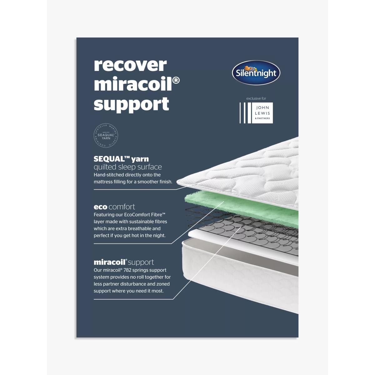This divan set includes Silentnight's extra firm tension Recover Miracoil Support mattress and their non-sprung, upholstered divan base. The mattress is well-suited for sleepers that get hot during the night as it has a comfort layer made from Eco Comfort breathable fibres that aid airflow for a cooler night's sleep. It also has a Miracoil® support system that provides zoned pressure relief where you need it most, especially to your spine and hips for improved posture and alignment. Its unique, no-roll spring design means that you can move without disturbing your partner, and it has a soft, smooth cover that contains SEAQUAL™ technology. SEAQUAL™ works with NGOs, fishermen, authorities and local communities to help clean our oceans. Marine waste from beaches, oceans, rivers and estuaries is collected by clean-up programs. It’s then sorted into different material types and the plastic portion is transformed into Upcycled Marine Plastic, which has been used to produce the high-quality cover found on this mattress. Try before you buy This is an important purchase and it’s worth trying your new mattress in one of our shops to make sure it's right for you. Our Partners can tell you more about its benefits, and recommend options based on your needs.