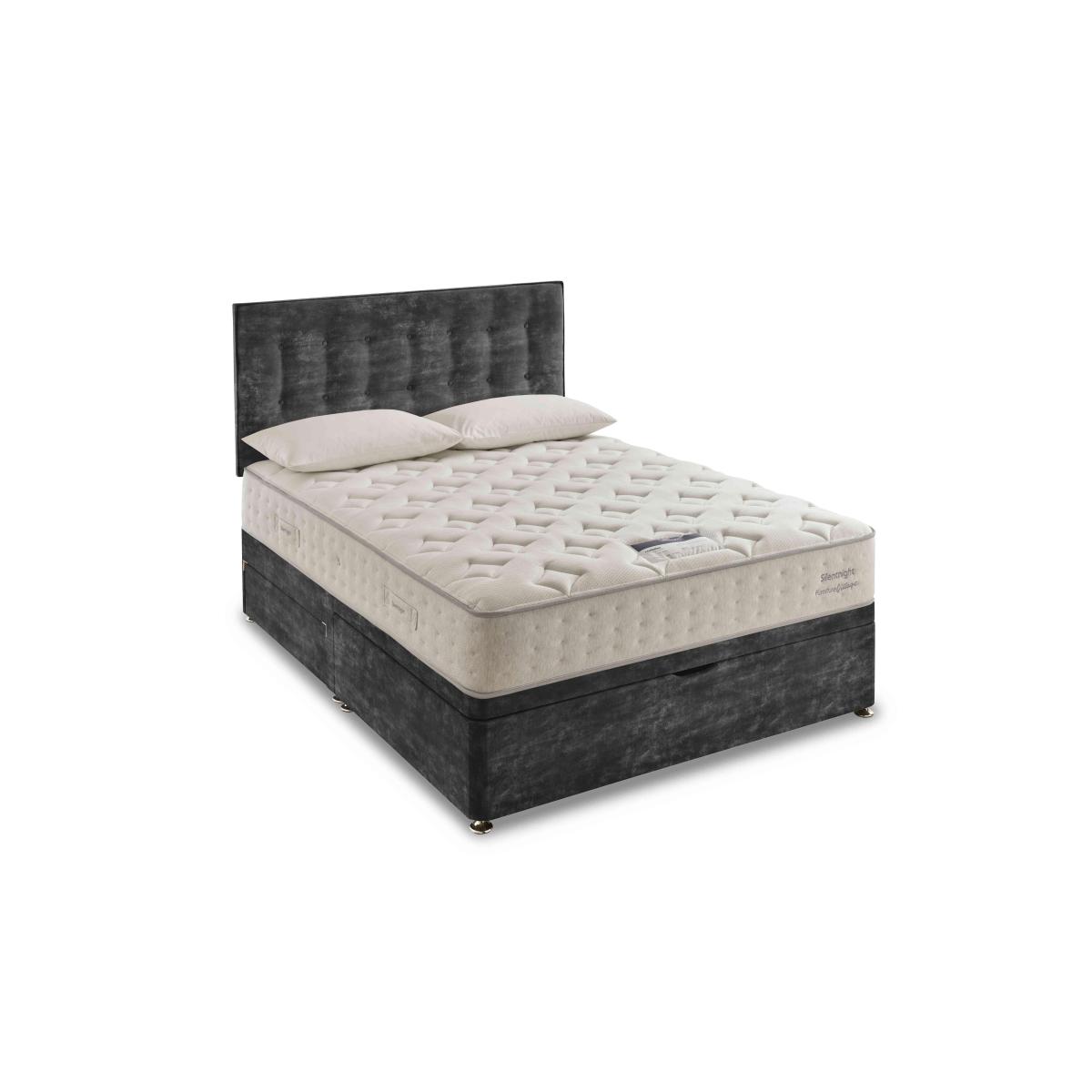 Revitalising sleep is yours with the mattresses and divan sets in our Silentnight Revitalise range. Mattresses feature Active. Breathe, a real alternative to memory foam that’s ten times more breathable and just as comfy and cushioning. Active Breathe helps regulate body temperature and offers incredible pressure relief along with a foam-like feel that allows for ease of movement as you sleep. The result? You wake feeling revitalised and raring to go. And because everyone’s different, the Silentnight Revitalise collection comprises four different mattresses: Revitalise Refresh 800, Revitalise Ortho 1400, Revitalise Restore 1600 and Revitalise Breathe 3000 Pi. Illowtop. The collection also includes beautifully upholstered divan sets with optional drawer, ottoman and half ottoman storage. Only at Furniture Village. You’ll love the extra storage that this half ottoman divan set gives you. And the firm-feel mattress with breathable comfort layer is a winner too. Why you'll love it Half ottoman divan set with high-performance firm-feel mattress promises truly refreshing sleep. ActiveBreathe layer feels like memory foam but is ten times more breathable. This innovative layer ensures ease of movement, temperature regulation and pressure relief. Features Silentnight’s Mirapocket® spring system with 800 pocket springs in king size. Zoned support for even weight distribution, improved spinal alignment and fewer aches and pains. Eternity layer gives this mattress extra stability and long lasting resilience. Built to ensure that when you move at night you don’t disturb the person next to you. Superb eco-credentials – it’s made with 60% recycled materials and is 100% recyclable. Divan base with half ottoman storage in a choice of upholstery fabrics. Handmade in England by Silentnight for Furniture Village. Silentnight is a carbon-neutral company and is committed to achieving net zero by 2040. This half ottoman divan set is part of our exclusive Silentnight Revitalise collection. What you need to know Mattress type: Pocket spring. Depth: 27.5 cm. Weight:Double 32 kg, king 37.5 kg and super king 45 kg. Firmness: Firm. Springs: 800 in king size. Fillings: Polyester, Active Breathe fibre. Cover: Polyester. Requires turning: No. Base type: Platform top with half ottoman storage. Sizes: Double, king, super king. Mattress care:Air for 4 hours before using to remove any odour. Indentations caused by settlement of fillings or body weight are normal and are not considered defects. If used on a slatted bed frame, the space between slats must be no wider than 7.5 cm. Spaces wider than this may cause excess dipping of the mattress and invalidate the guarantee. Always use a mattress protector. Rotate regularly. Divan base care: Clean upholstery weekly using a soft brush or vacuum with the curtain attachment. Professional cleaning advised for oil- and grease-based stains. Some fabrics can show wear on areas of more use or in direct sunlight.