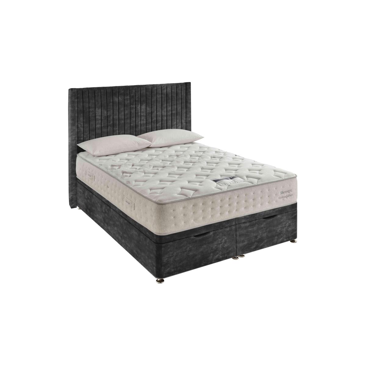 Revitalising sleep is yours with the mattresses and divan sets in our Silentnight Revitalise range. Mattresses feature Active. Breathe, a real alternative to memory foam that’s ten times more breathable and just as comfy and cushioning. Active Breathe helps regulate body temperature and offers incredible pressure relief along with a foam-like feel that allows for ease of movement as you sleep. The result? You wake feeling revitalised and raring to go. And because everyone’s different, the Silentnight Revitalise collection comprises four different mattresses: Revitalise Refresh 800, Revitalise Ortho 1400, Revitalise Restore 1600 and Revitalise Breathe 3000 Pi. Illowtop. The collection also includes beautifully upholstered divan sets with optional drawer, ottoman and half ottoman storage. Only at Furniture Village. Look forward to a great night’s sleep with this Silentnight ottoman storage divan set. The medium-feel mattresses has pocket springs, mini springs and an innovative breathable comfort layer. Why you'll love it Ottoman divan set with high-performance medium-feel mattress promises truly restorative sleep. ActiveBreathe layer feels like memory foam but is ten times more breathable. This innovative layer ensures ease of movement, temperature regulation and pressure relief. Features Silentnight’s Mirapocket® spring system with 600 pocket springs and 1000 mini springs in king size. Zoned support for even weight distribution, improved spinal alignment and fewer aches and pains. Eternity layer gives this mattress extra stability and long lasting resilience. Built to ensure that when you move at night you don’t disturb the person next to you. Superb eco-credentials – it’s made with 60% recycled materials and is 100% recyclable. Divan base with ottoman storage in a choice of upholstery fabrics. Handmade in England by Silentnight for Furniture Village. Silentnight is a carbon-neutral company and is committed to achieving net zero by 2040. This ottoman divan set is part of our exclusive Silentnight Revitalise Collection. What you need to know Mattress type: Pocket spring. Depth: 27 cm. Weight:Double 32 kg, king 37.5 kg and super king 45 kg. Firmness: Medium. Springs: 600 pocket springs plus 1000 mini springs in king size. Fillings: Polyester, Active Breathe fibre. Cover: Polyester. Requires turning: No. Base type: Platform top with ottoman storage. Sizes: Double, king, super king. Mattress care:Air for 4 hours before using to remove any odour. Indentations caused by settlement of fillings or body weight are normal and are not considered defects. If used on a slatted bed frame, the space between slats must be no wider than 7.5 cm. Spaces wider than this may cause excess dipping of the mattress and invalidate the guarantee. Always use a mattress protector. Rotate regularly. Divan base care: Clean upholstery weekly using a soft brush or vacuum with the curtain attachment. Professional cleaning advised for oil- and grease-based stains. Some fabrics can show wear on areas of more use or in direct sunlight.