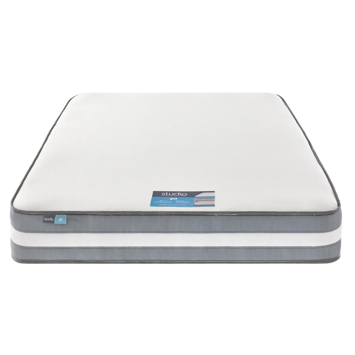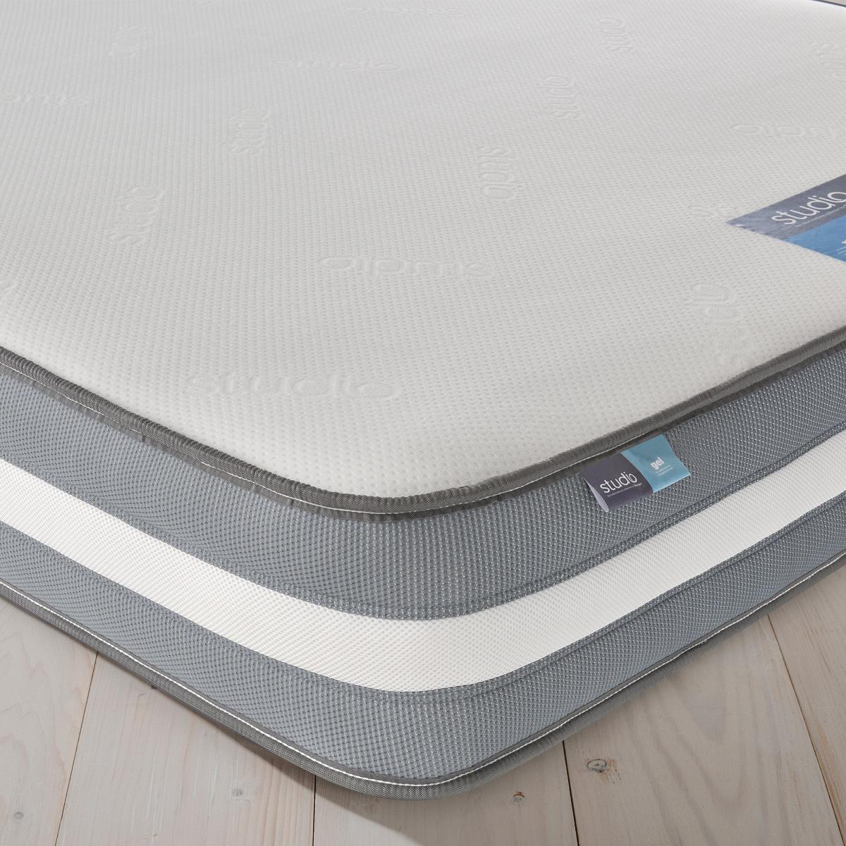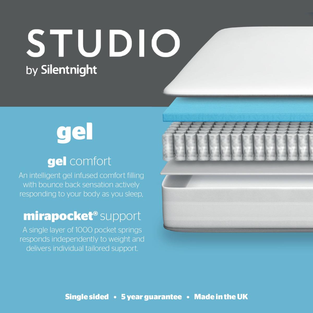 The comfort you want, the support you need. Ideal for twisters & turners - Studio Gel mattress offers a bounceback sensation that actively responds to your body as you sleep. The intelligent gel infused comfort layer provides soothing pressure relief and is far more breathable than memory foam, ensuring a fresher night's sleep. The mirapocket layer inside uses 1000 pocket springs to individually respond to movement and deliver individual tailored support. The mattress contains 1000 individually responsive pocket springs that are held under tension in their own fabric pockets, providing targeted zoning across the surface, scientifically proven to provide superior spinal alignment and body support for tailored comfort where you need it most. Single sided, easy care mattress. Simply rotate head to toe for longevity. For the best comfort, once you have removed it from its packaging, leave your mattress to settle for 24 hours before you sleep on it. Need to throw out your old mattress first? View our information on mattress recycling and collections. * For health and hygiene reasons, we are unable to offer refunds or exchanges on Mattresses unless they are returned unused and in their original packaging. For more information please see our Easy Returns section.