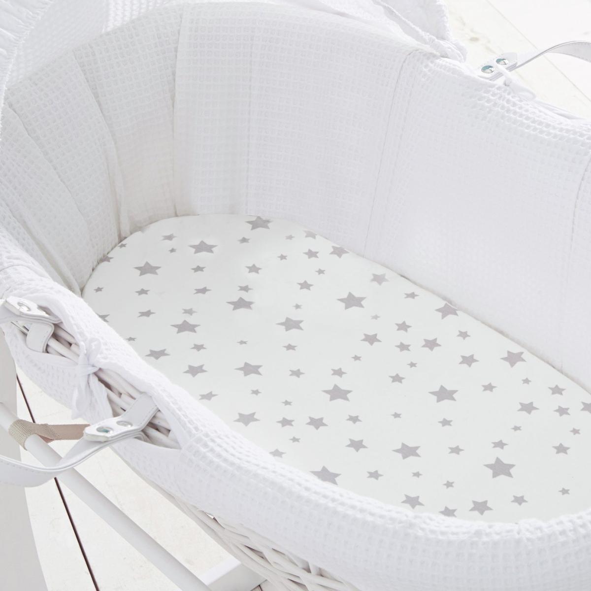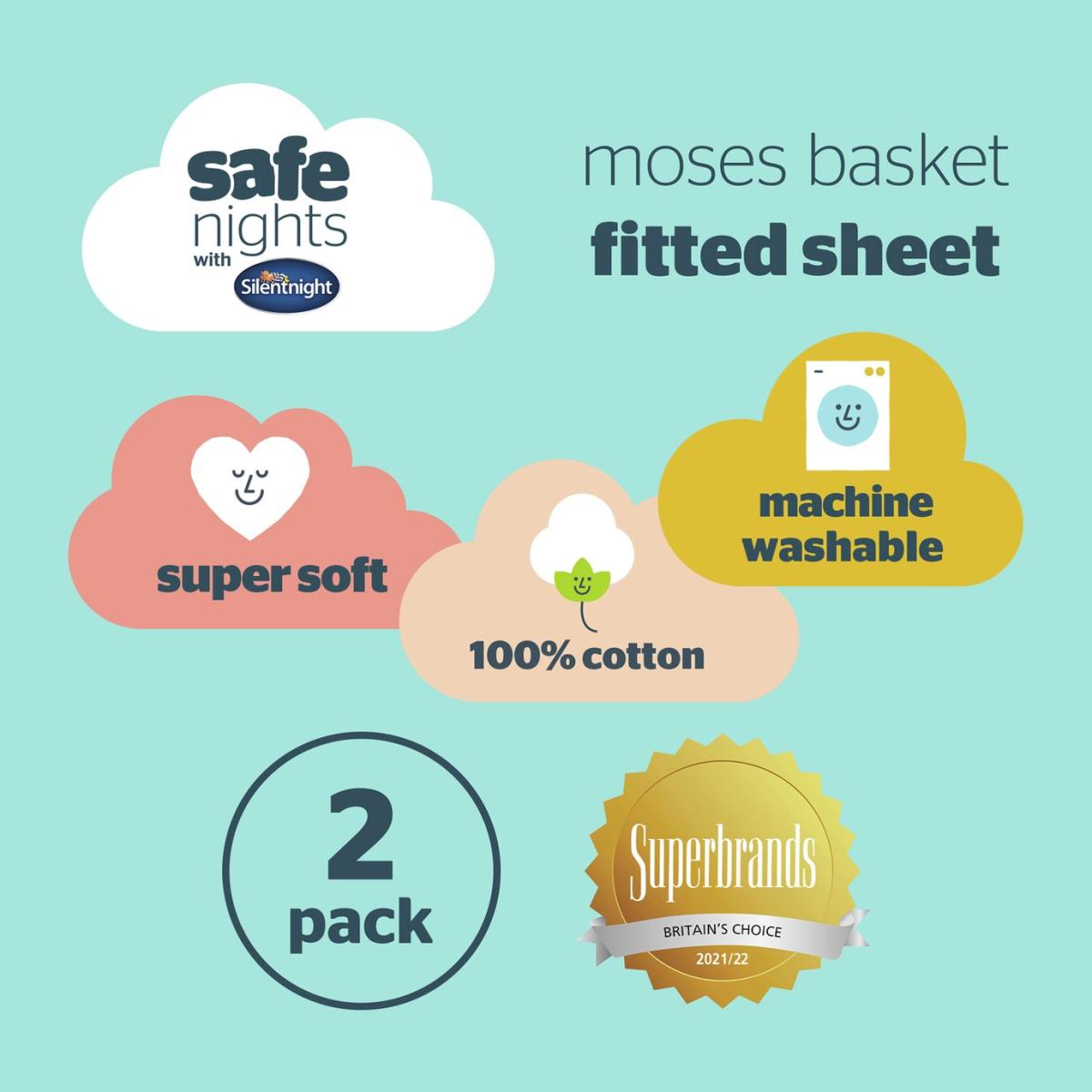 An essential for every nursery. Made from 100% cotton which is soft and breathable with your babies' comfort in mind, always. The handy packs of 2 mean you will always have a spare. The sheets feature elasticated edges to provide a snug fit to your moses basket mattress. Produced in OEKO-TEX® certified factories, this range has the ultimate seal of approval for safety standards. Machine washable, the sheets are durable and designed to stand the test of time. Finish: woven. 100% cotton,. 144 thread count. 100% breathable cotton jersey which feels super soft and gentle on the skin. Each pack Includes 2 moses basket sheets. Produced in Oeko-Tex certified factories, this product has the ultimate seal of approval for safety standards. Machine washable at 40 C. Suitable for moses baskets. Size L75, W28cm. Suitable for a mattress depth of 8cm. Elasticated edges. Suitable from birth.