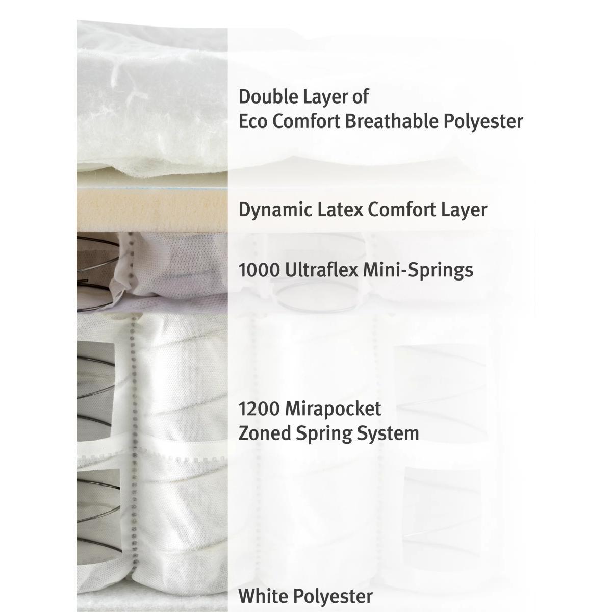 Made in the UK Latex comfort Silentnight’s latex comfort layer is responsive and flexible, and adapts to your body as you move through the night. This helps you to move easily and enjoy an undisturbed night’s sleep. The supportive and press-relieving properties of latex makes this mattress well-suited for anyone who suffers from back and joint pain. Ultra-flex Designed with an additional comfort layer featuring 1000 mini springs, to bring you enhanced comfort and increased breathability while you sleep. Zoned Mirapocket® support A layer of individual pocket springs conform and adjust to your body weight providing truly tailored support. Each spring responds and reacts to your movement and acts independently, so when you move throughout the night your partner won’t feel a thing, meaning you'll both enjoy a more restful night’s sleep. Say goodbye to niggling aches and pains Silentnight’s pressure-relieving zoned support system has been scientifically proven to improve your spinal alignment and posture. Medium/Firm firmness level A little bit of give, but with an extra level of support makes this mattress well-suited for both back and side sleepers. Allergy UK Approved Made with a Purotex cover which works to reduce moisture and dust-mite allergens to create a drier, fresher and all-round healthier sleeping environment, approved by Allergy UK. Single sided Rotate from head-to-toe regularly to get the most out of your mattress. Try before you buy This is an important purchase and it’s worthwhile to try your choice of mattress in store to make sure it's right for you. Our store Partners will be able to tell you more about its benefits, and recommend options based on your needs. Extend the life of your new mattress with a durable and breathable.