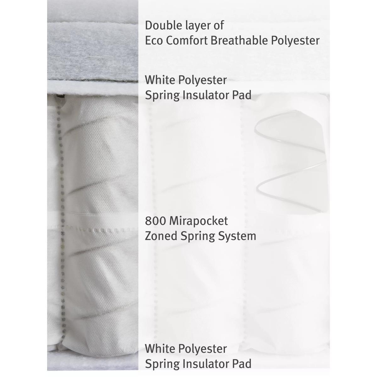 Made in the UK Eco Comfort Fibre™ Layer Silentnight's Eco range features eco-friendly mattresses made with sustainable fibres that enhance a cool and refreshing night's sleep. The eco comfort filling is highly breathable, so these mattresses are ideal for sleepers who get hot during the night. Made from recycled plastic bottles Keeping the environment in mind, the Eco Comfort Fibre™ is fully recylable at end of life. This clever comfort layer allows you to move freely throughout the night and provides responsive support. Zoned Mirapocket® support A layer of individual pocket springs conform and adjust to your body weight providing truly tailored support. Each spring responds and reacts to your movement and acts independently, so when you move throughout the night your partner won’t feel a thing, meaning you'll both enjoy a more restful night’s sleep. Say goodbye to niggling aches and pains Silentnight’s pressure-relieving zoned support system has been scientifically proven to improve your spinal alignment and posture. Tufted pillowtop sleep surface The luxurious pillowtop provides an extra level of comfort. It's hand-tufted and ideal for sleepers who prefer a firmer sleep surface. Firm Enjoy extra support from head-to-toe. This mattress gives support to the whole body. Single sided Rotate from head-to-toe regularly to get the most out of your mattress. Try before you buy This is an important purchase and it’s worthwhile to try your choice of mattress in store to make sure it's right for you. Our store Partners will be able to tell you more about its benefits, and recommend options based on your needs. Extend the life of your new mattress with a durable and breathable.