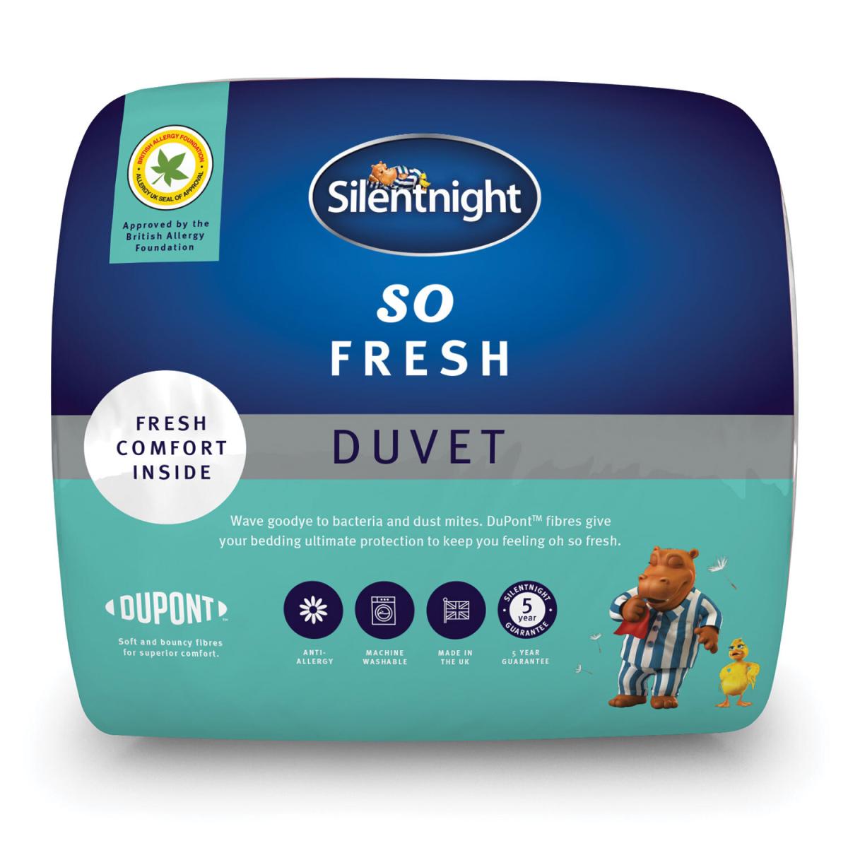 Feel fresh throughout the night with the Silentnight So Fresh 10.5 Tog Duvet. Filled with soft and bouncy anti-allergy DuPont fibres for superior comfort and protection. Wave goodbye to bacteria and dust mites, the DuPont fibres give your bedding ultimate protection to keep you fresh. Our anti-allergy fibres are approved by the British Allergy Foundation, which means they have the ultimate seal of approval and are ideal for keeping your duvet free from bacteria.