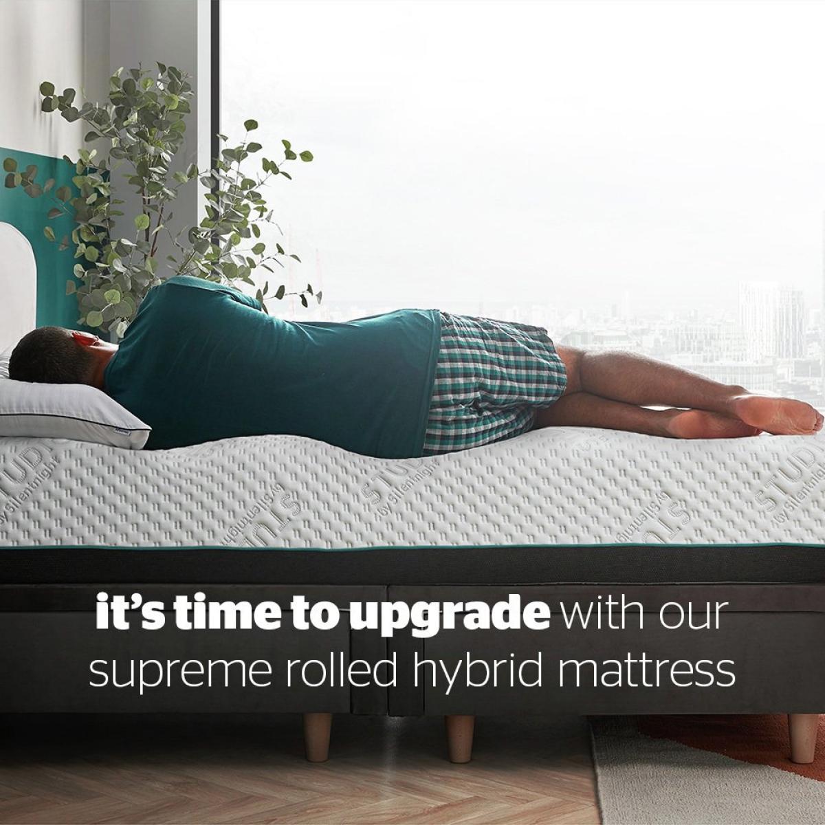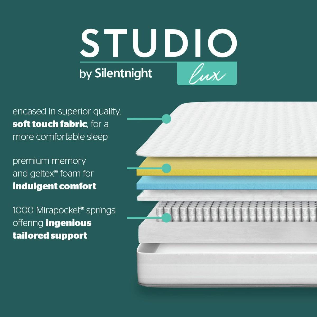 This ultimate hybrid mattress is rolled and wrapped so that it's conveniently easy to manoeuvre whilst offering the most indulgent comfort. With superior quality, soft touch fabric and protection against allergens and body temperature, this is Studio by Silentnight's most advanced and luxurious mattress yet. Featuring memory and geltex foam combination for advanced pressure relief and body-hugging comfort. The Lux boasts 1000 Mirapocket springs, which provides ingenious tailored support for advanced spinal alignment and posture improvement. Part of the Studio by Silentnight collection. Medium feel. Pocket sprung with memory foam layer mattress with 1000 springs. Knit cover with flat top finish. No roll together. Anti allergy. Mattress size W150, L200, D27cm. No-turn mattress. Rotate mattress regularly. Made in the UK. Package Dimensions: Package 1 dimensions: H31, W155, D31cm. Package 1 weight: 36.3kg. General information: Manufacturer's 5 year guarantee.