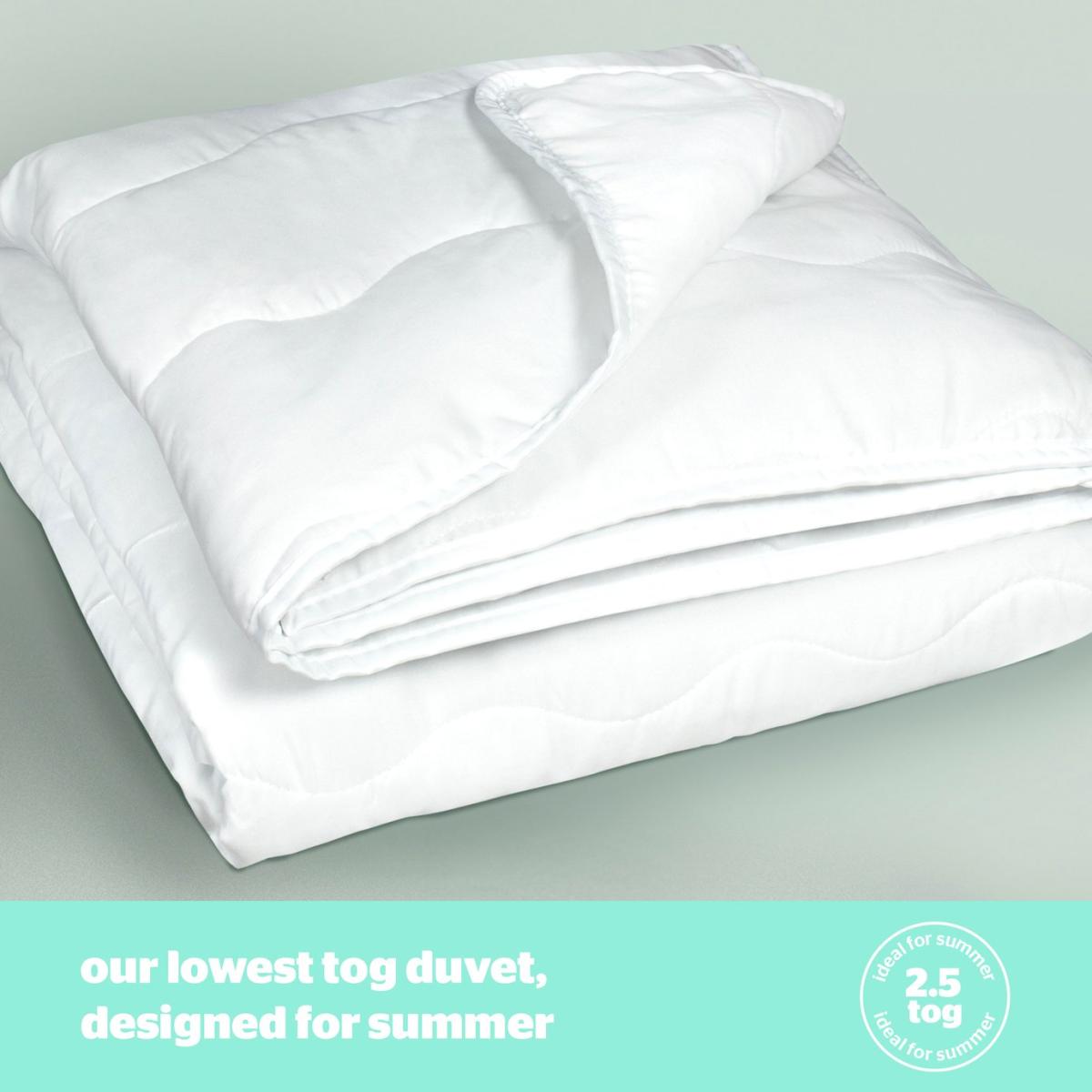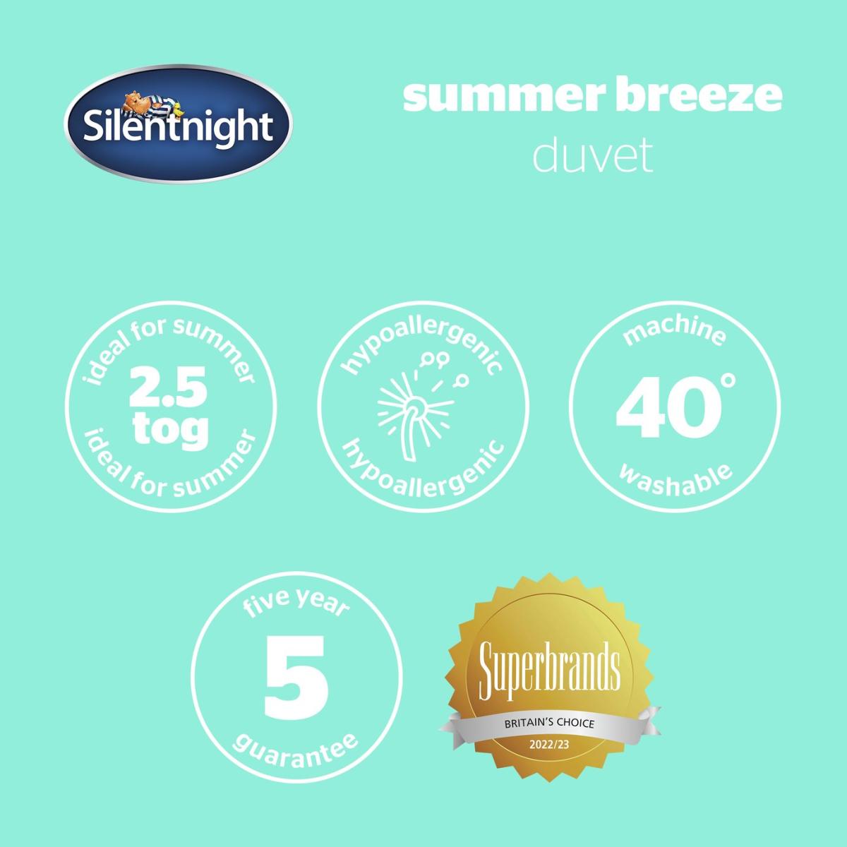 Sleep breezy on summer nights with the Silentnight Summer Breeze 2.5 Tog Duvet. Soft and light, perfect for over-heater, 2.5 tog is our lowest tog duvet, specially designed for summer. The light breathable fibres mean your duvet won't feel heavy or restrictive, whilst also allowing heat and humidity to escape. The Silentnight Summer Breeze Duvet is hypoallergenic, machine washable and fast drying. Silentnight are the UK's most trusted sleep brand with over 75 years' experience in creating products that offer solutions for every sleeper. Single duvet. 2.5 tog duvet. Cover made from 100% polyester. Filling made from 100% hollowfibre polyester. Size L200, W135cm. 1.21kg. Machine washable at 40 C. Suitable for washing in a standard size washing machine. Non-allergenic. Manufacturer's 5 year guarantee.