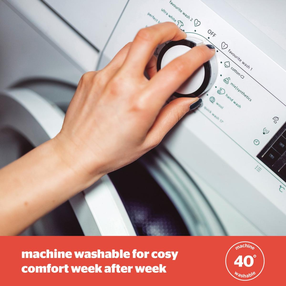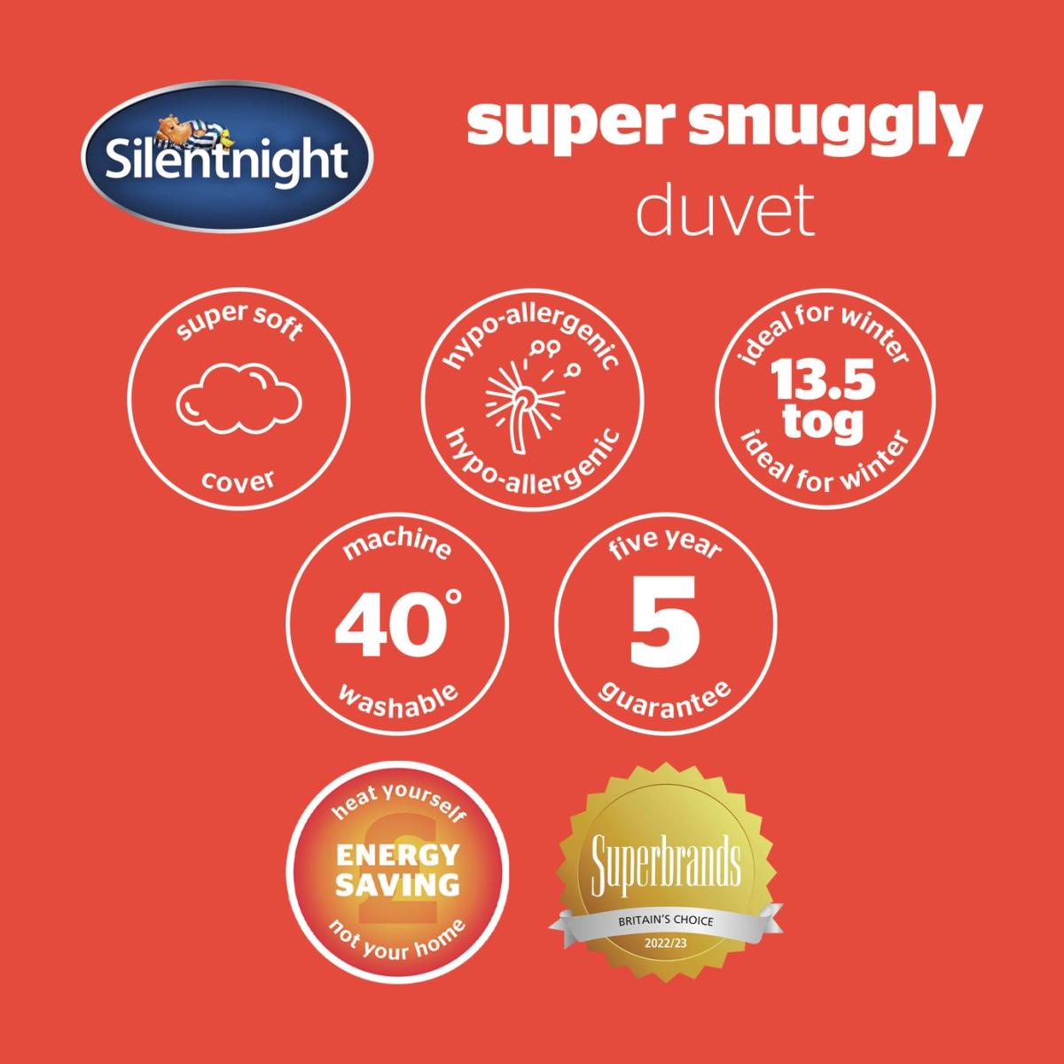 The Silentnight Super Snuggly duvet will help to keep you warm and oh so snug! The duvet is generously filled with hollowfibre which results in a soft, snuggly and comforting duvet that cocoons around you. The 13.5 tog Warm & Cosy duvet is ideal for cooler months and will prevent you from becoming cold in bed. The duvet is covered in microfibre that is soft to the touch to offer exceptional comfort throughout the night. Super king duvet. 13.5 tog duvet. Cover made from 100% microfibre. Filling made from 100% hollowfibre polyester. Size L260, W220cm. 3.9kg. Machine washable. Suitable for washing in a standard size washing machine. Suitable for tumble drying. Manufacturer's 5 year guarantee.