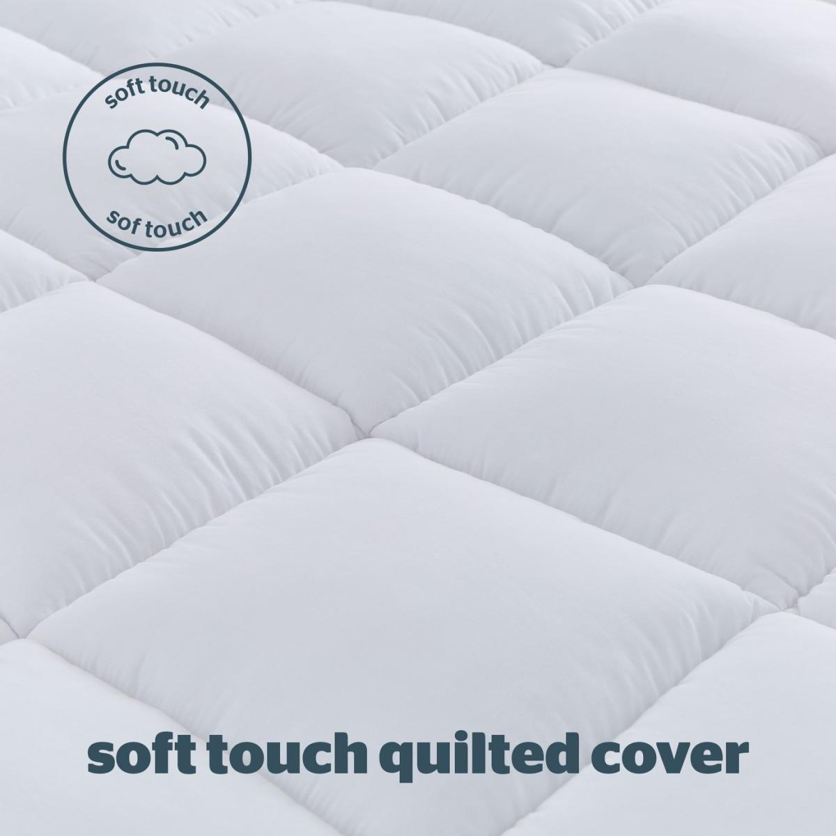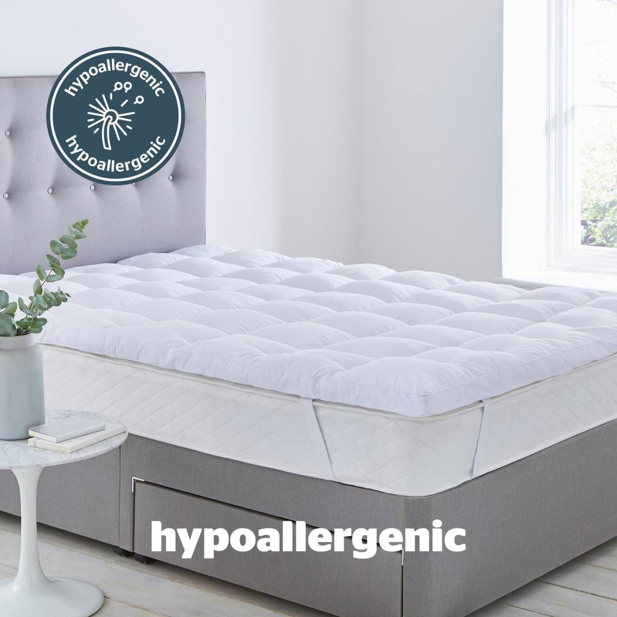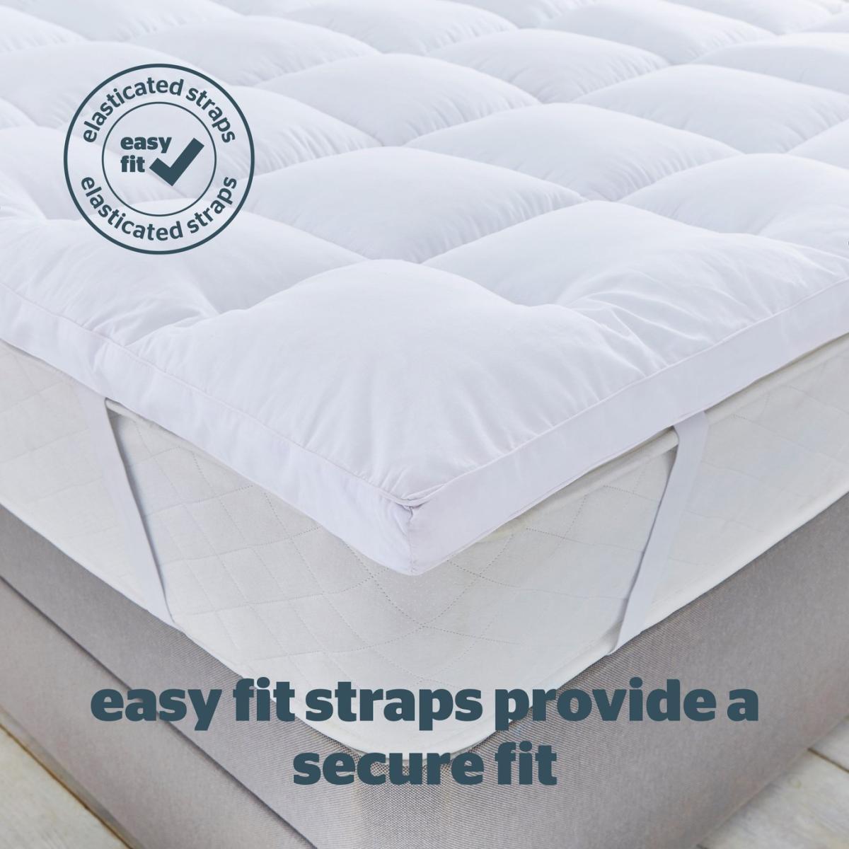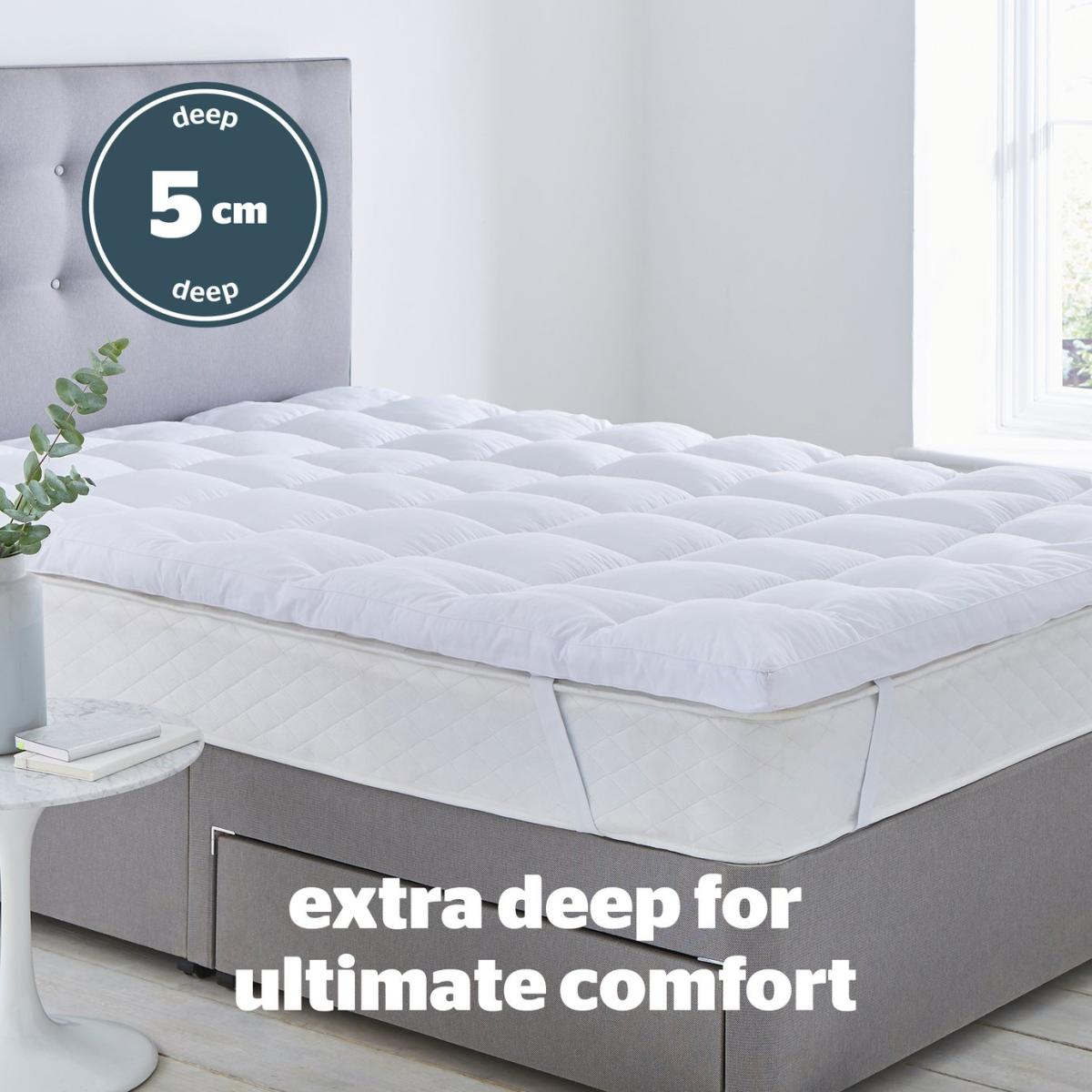 Extra depth provides ultimate comfort, the quilted cover features internal walls to ensure the gently supportive filling stays in great shape and is always plump. The Silentnight Deep Sleep Ultimate Mattress Topper is covered in a luxuriously soft quilted fabric for superior comfort. The topper provides gentle support and adds another layer of comfort to your existing mattress as well as helping to refresh and rejuvenate it. The Silentnight Ultimate Deep Sleep Mattress Topper comes with a 2 year manufacturer's guarantee. Silentnight are the UK's most trusted bed brand with over 75 years' experience in creating products that offer solutions for every sleeper. Set includes:1 x Mattress Topper. Suitable for king size beds. Size L200, W150, D7cm. Cover made from Cotton. Polyester reverse. Polyester filling. Fitted. Secured by elasticated corner straps. Cover is machine washable and suitable for tumble drying.