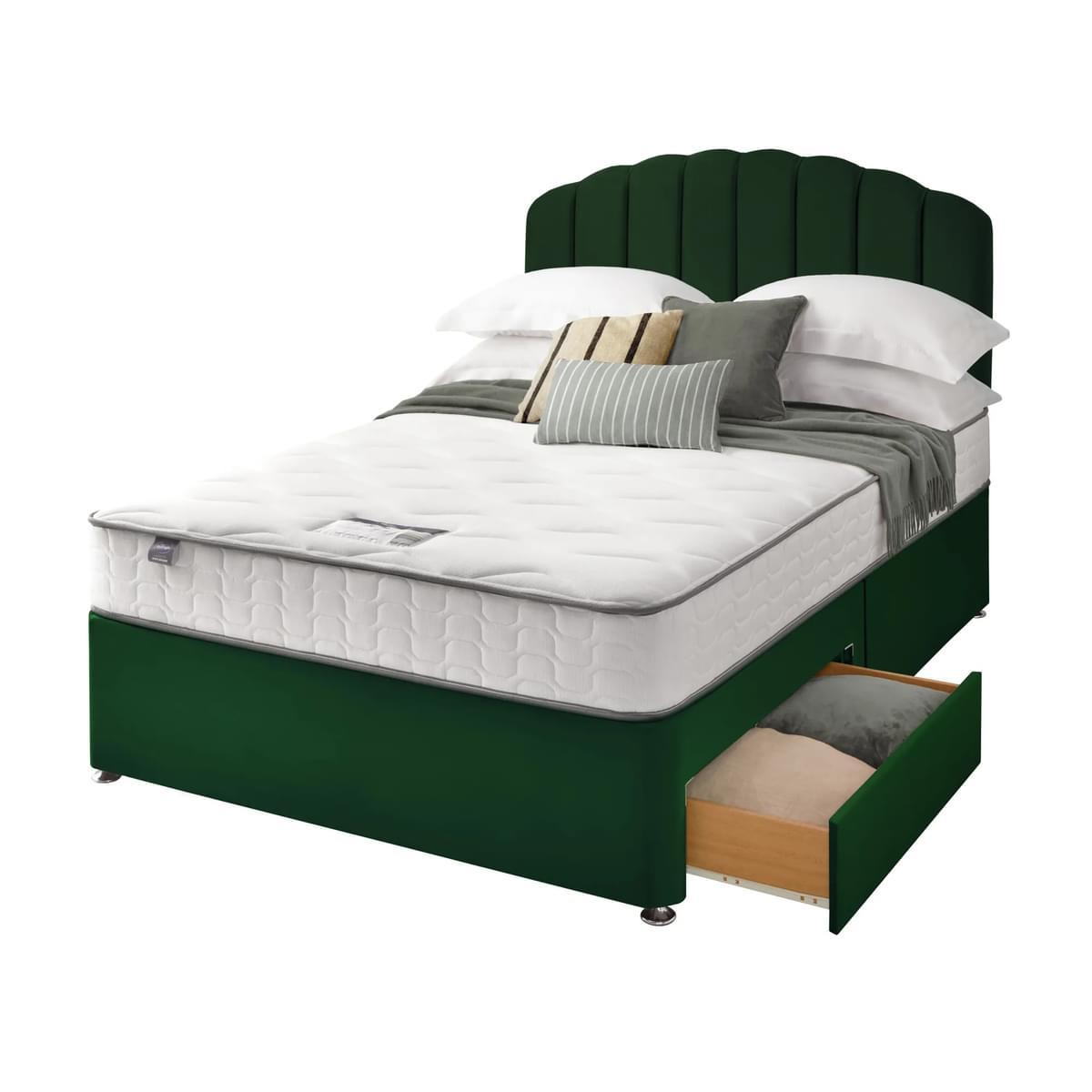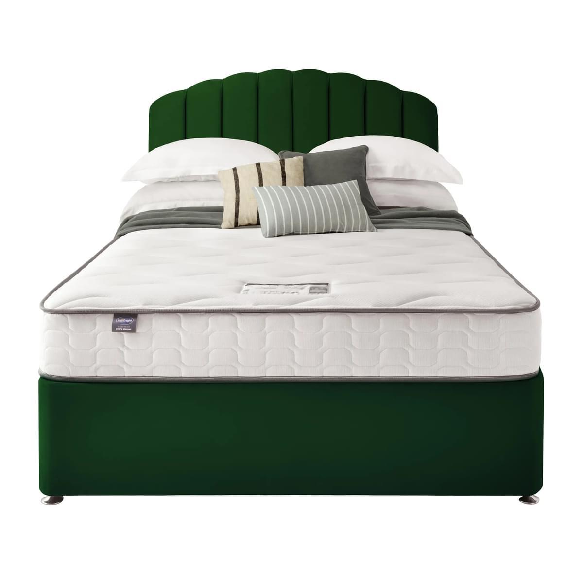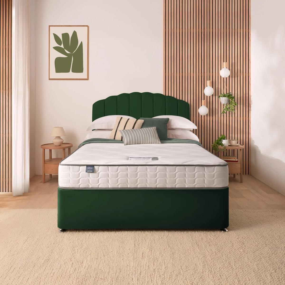 * Divan Bed* Bed Mounted Headboard* Includes Mattress* Trendy and Soft Velvet Upholstery This all-inclusive divan set seamlessly marries functionality and elegance, featuring a refined headboard, and an extraordinary 800 pocket mattress. Silentnight's cutting-edge Mirapocket technology takes centre stage, providing 800 individual pocket springs for unparalleled comfort, support, and pressure relief. The zoned Mirapocket support system ensures even weight distribution, promoting effortless movement and enhancing spinal alignment, while the edge-to-edge support creates a haven for an undisturbed night's sleep. The mattress's responsive pocket springs adapt to your body weight, delivering a luxurious blend of comfort and personalised support. Plump filling layers and a sumptuously soft knitted mattress cover add to the lavishness, with a hypoallergenic finish for peace of mind. The medium-firm comfort rating caters to those who transition between back and side sleeping positions. Please note, the mattress binding colour may differ slightly from image. This does not affect the quality or use of the final product.