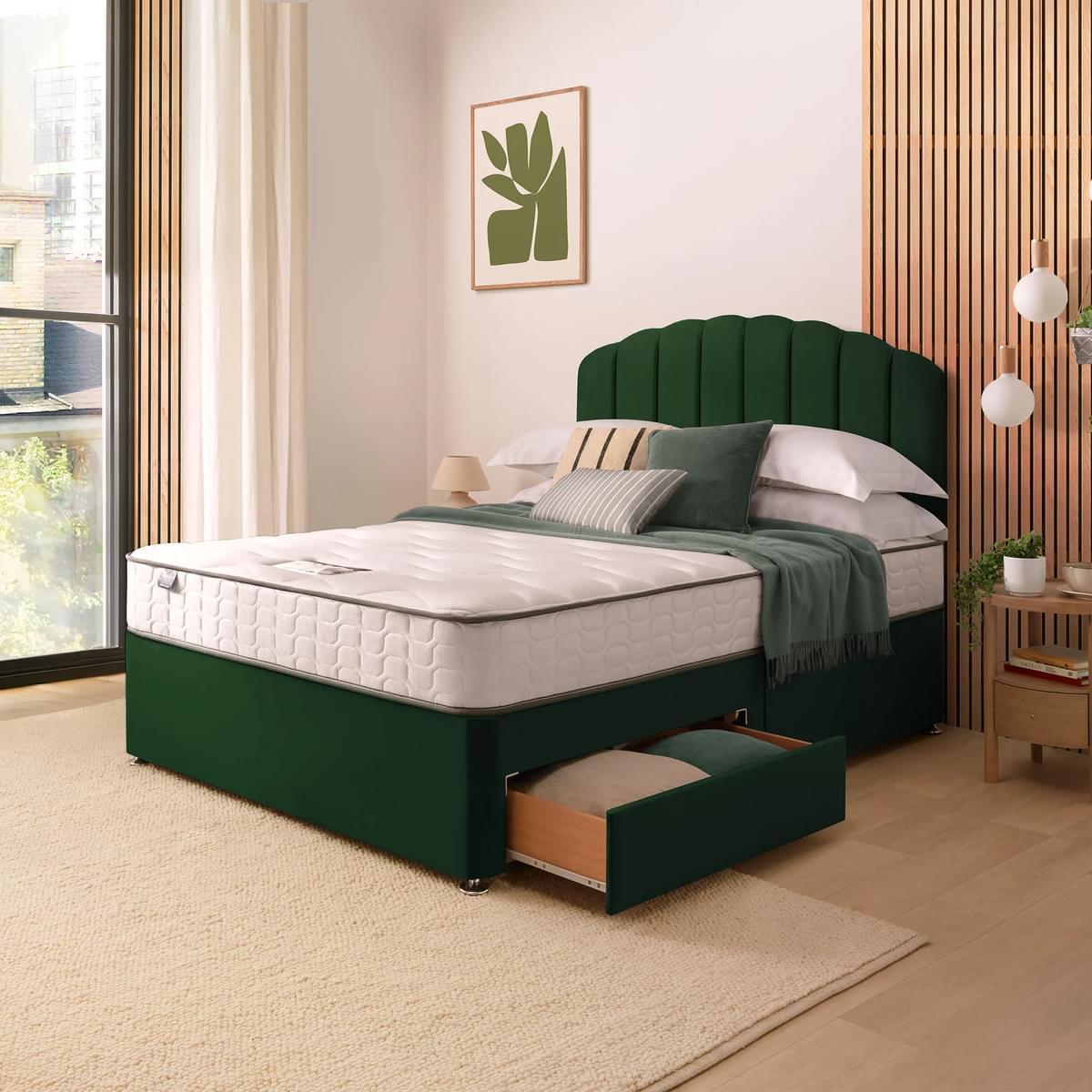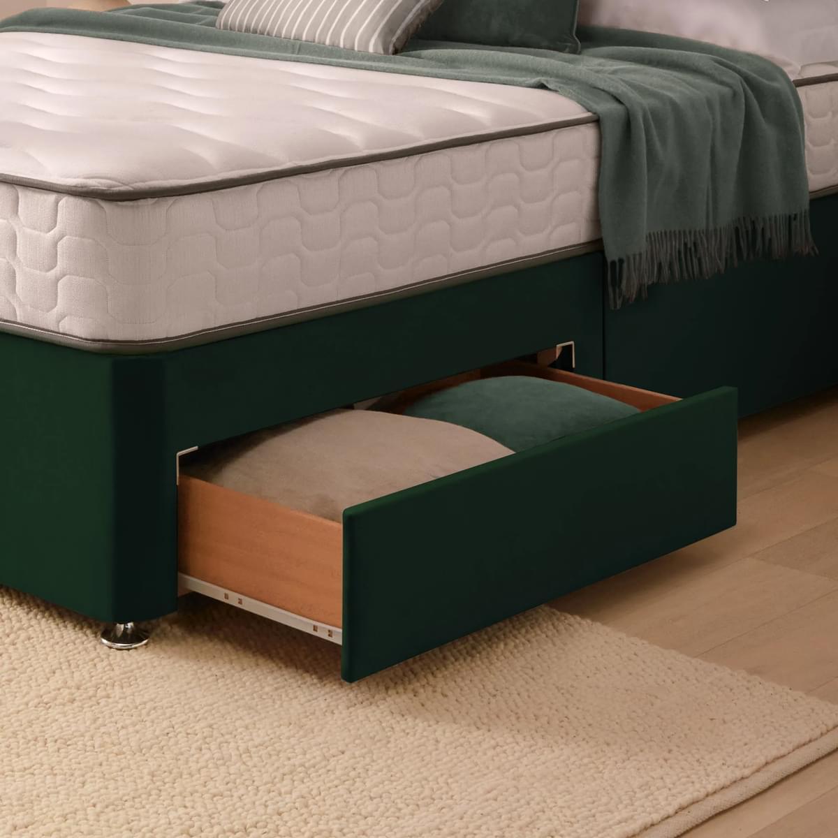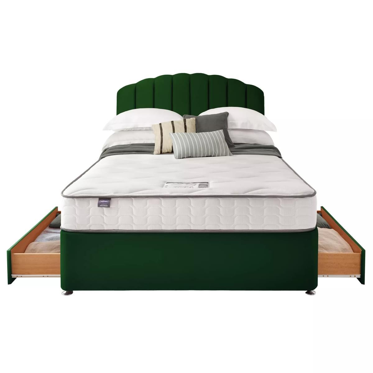 * Divan Bed* Bed Mounted Headboard* Includes Mattress* Trendy and Soft Velvet Upholstery This all-inclusive divan set seamlessly marries functionality and elegance, featuring a refined headboard, and an extraordinary 800 pocket mattress. Silentnight's cutting-edge Mirapocket technology takes centre stage, providing 800 individual pocket springs for unparalleled comfort, support, and pressure relief. The zoned Mirapocket support system ensures even weight distribution, promoting effortless movement and enhancing spinal alignment, while the edge-to-edge support creates a haven for an undisturbed night's sleep. The mattress's responsive pocket springs adapt to your body weight, delivering a luxurious blend of comfort and personalised support. Plump filling layers and a sumptuously soft knitted mattress cover add to the lavishness, with a hypoallergenic finish for peace of mind. The medium-firm comfort rating caters to those who transition between back and side sleeping positions. Please note, the mattress binding colour may differ slightly from image. This does not affect the quality or use of the final product.