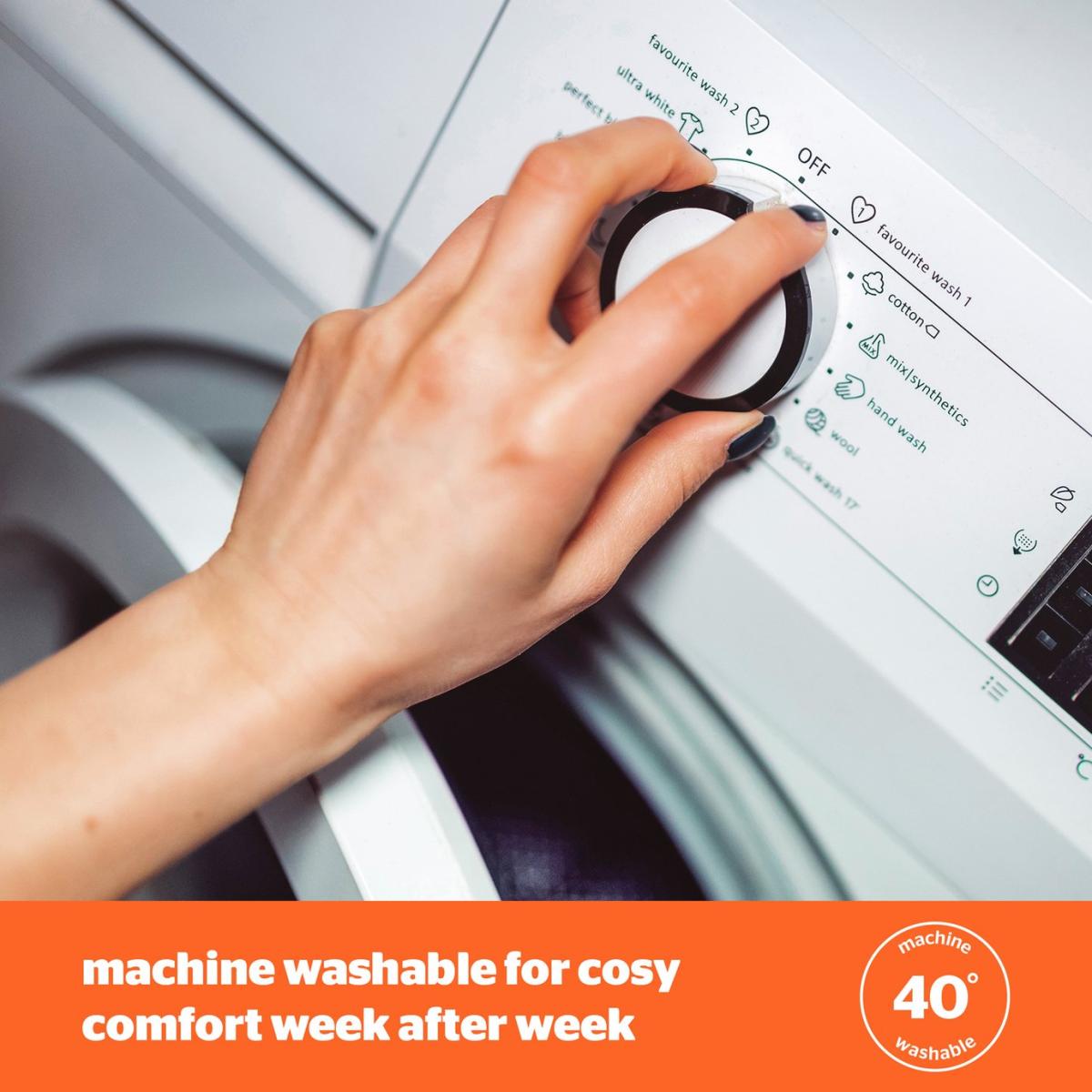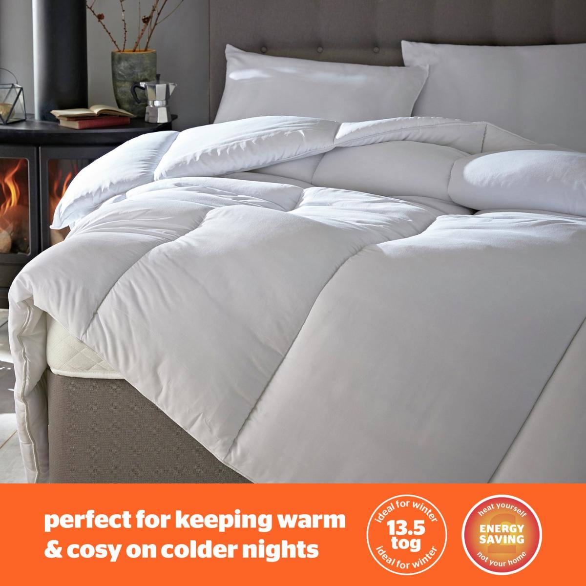The Silentnight Warm & Cosy duvet will help to keep you warm and comfortable for a relaxing and restful night's sleep. The duvet is generously filled with hollowfibre which results in a soft, snuggly and comforting duvet that cocoons around you. The 13.5 tog Warm & Cosy duvet is ideal for cooler months and will prevent you from becoming cold in bed. The duvet is covered in microfibre that is soft to the touch to offer exceptional comfort throughout the night. Snuggle up into supremely cosy comfort for a great night's sleep on colder nights. Super king duvet. 13.5 tog duvet. Cover made from 100% polyester. Filling made from 100% polyester. Size L260, W220cm. 3.9kg. Machine washable at 40 C. Suitable for washing in a standard size washing machine. Suitable for tumble drying.