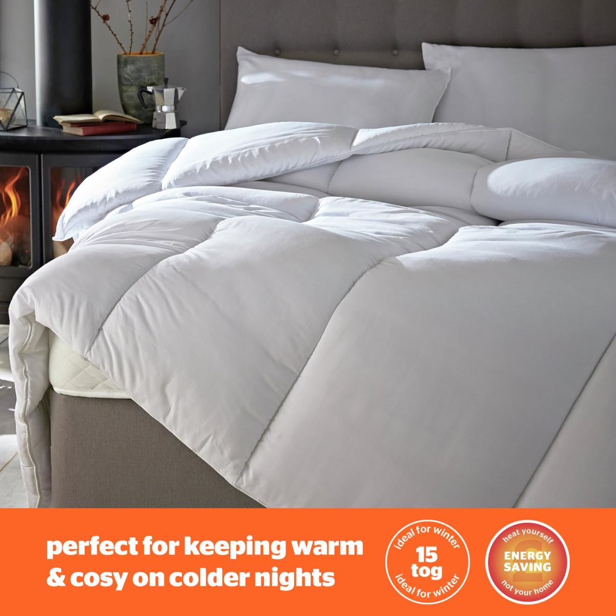 The Silentnight Warm & Cosy duvet will help to keep you warm and comfortable for a relaxing and restful night's sleep. The duvet is generously filled with hollowfibre which results in a soft, snuggly and comforting duvet that cocoons around you. The 15 tog Warm & Cosy duvet is ideal for cooler months and will prevent you from becoming cold in bed. The duvet is covered in microfibre that is soft to the touch to offer exceptional comfort throughout the night. Snuggle up into supremely cosy comfort for a great night's sleep on colder nights. King size duvet. 15 tog duvet. Cover made from 100% polyesterhollowfibre polyester. Filling made from 100% polyester. Size L225, W220cm. 3.8kg. Machine washable at 40 C. Suitable for washing in a standard size washing machine. Suitable for tumble drying.