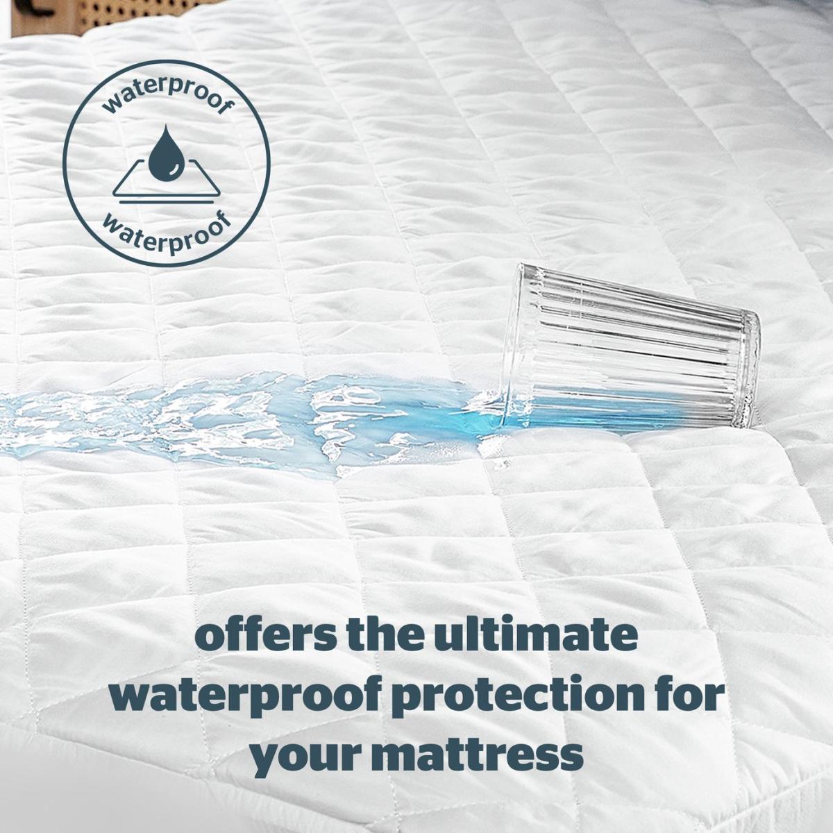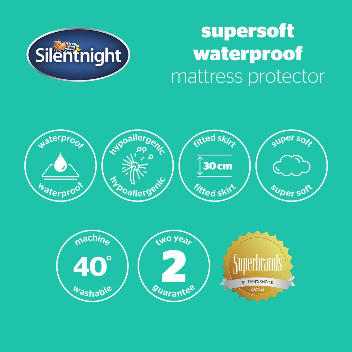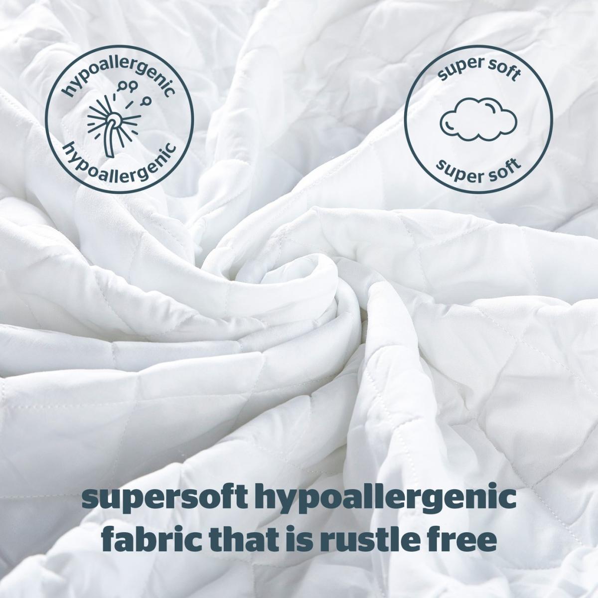This Waterproof Mattress Protector will prolong the life of your mattress. The double-sided polypropylene waterproof layer lies at the bottom of the protector and provides ultimate protection, whilst the hollowfibre filling and quilted microfibre cover will provide luxurious comfort. Unlike other waterproof mattress protectors, the protector is rustle free, meaning you won't hear any noises when you turn during the night. Deep fitted skirt, extra filling. Suitable for single beds. Non-allergenic. Polyester microfibre cover. Polyester hollowfibre filling. Secured by elasticated skirt. Size L193, W90cm. Machine washable. Line dry. Suitable for tumble drying.