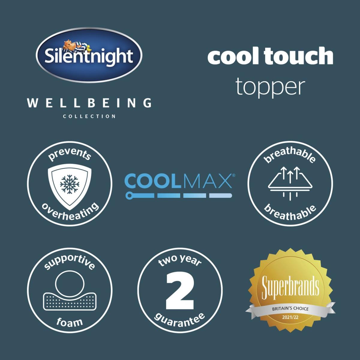 The Silentnight Cool Touch Topper has been designed to prevent overheating as you sleep which is a common cause of sleep disturbance. Crafted with Coolmax outer fabric which offers exceptional breathability, allowing air to circulate in and out of the topper for ultimate cool comfort. The signature moisture wicking properties of Coolmax fabric help to move moisture away from the body for a cool night's sleep. The innovative memory foam core which absorbs body heat as you sleep, expelling away from the body via the carefully crafted channels. The 8cm deep topper rejuvenates your mattress whilst offering full body support. Set includes: Topper. Suitable for super king beds. Size L180, W200,. Cover made from 100%Polyester with Cool Max Technology. 100% Polypropylene reverse. Polyester filling. Cover is machine washable at 40. C and suitable for tumble drying.