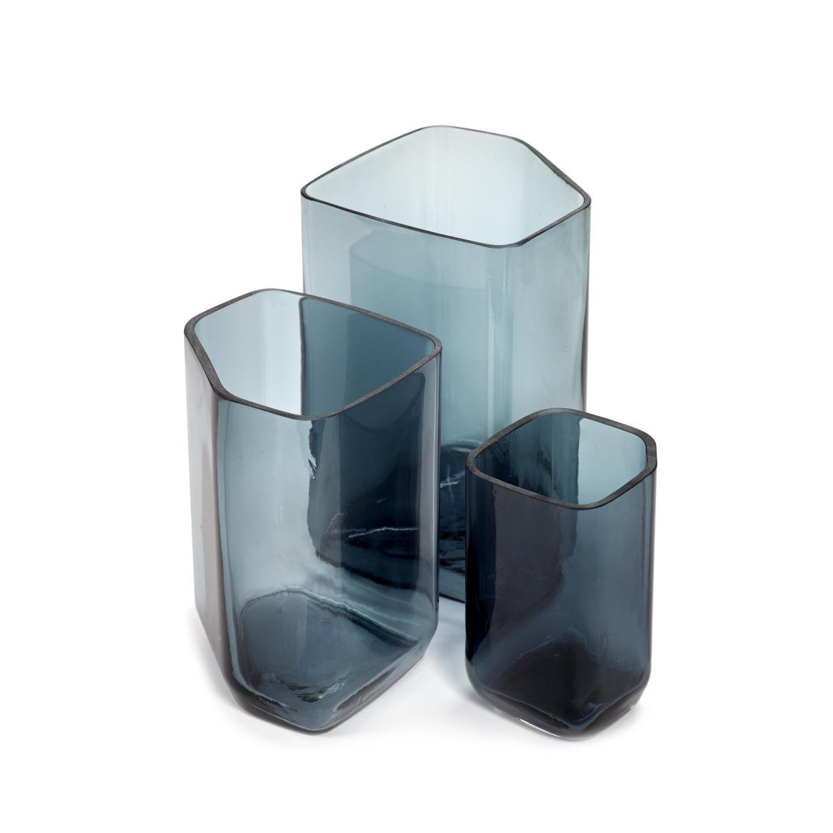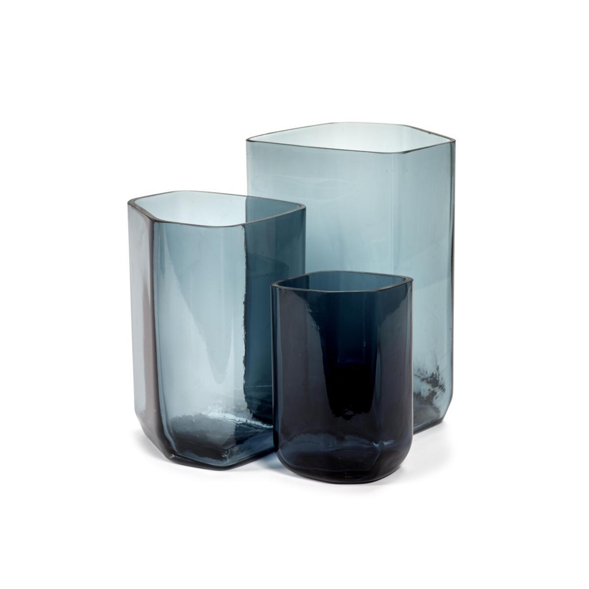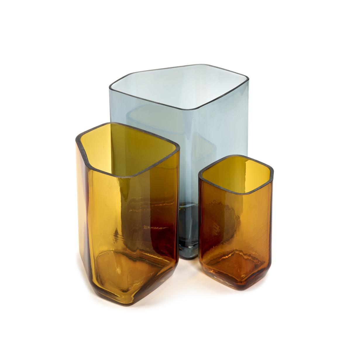 The design of Silex vases required Belgian designer Sylvain Willenz to carry out a lot of research work on shapes. Viewed from above, the vases are neither actual cylinders nor squares. The faceted angles contrast deftly with the rounded glass. "A shape that’s difficult to produce", comments Sylvain Willenz. The Silex vase is indeed the result of an exceptional piece of work in hand-blown glass. "Managing to blow enough glass against these faceted angles requires a lot of lung capacity. It’s a problem we don’t necessarily encounter with round forms. " Another big challenge is that the weight of Silex vases requires a lot of force from the glass blowers. Experienced and specialised, they can then produce vases in the proper form. The two colours (amber and smoked blue) complement each other perfectly. The refracted light gives each vase a different appearance depending on the angle of vision.