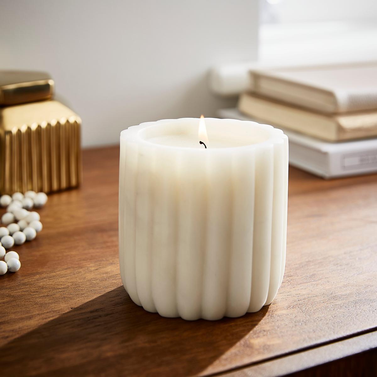 I love this candle for its sleek, marble-look ribbed design which adds a touch of sophistication to any room. It works particularly well in modern, minimal, or contemporary interiors thanks to its clean lines and neutral tones. For styling, consider pairing it with metallic accents, like gold or brass, to elevate its elegance, or place it on a wooden or stone tray for a layered, curated look. It’s versatile enough to work on coffee tables, mantelpieces, or sideboards, and its understated aesthetic makes it suitable for both everyday use and special occasions. Practical tip: group it with smaller candles or vintage accessories to create a balanced, inviting vignette.