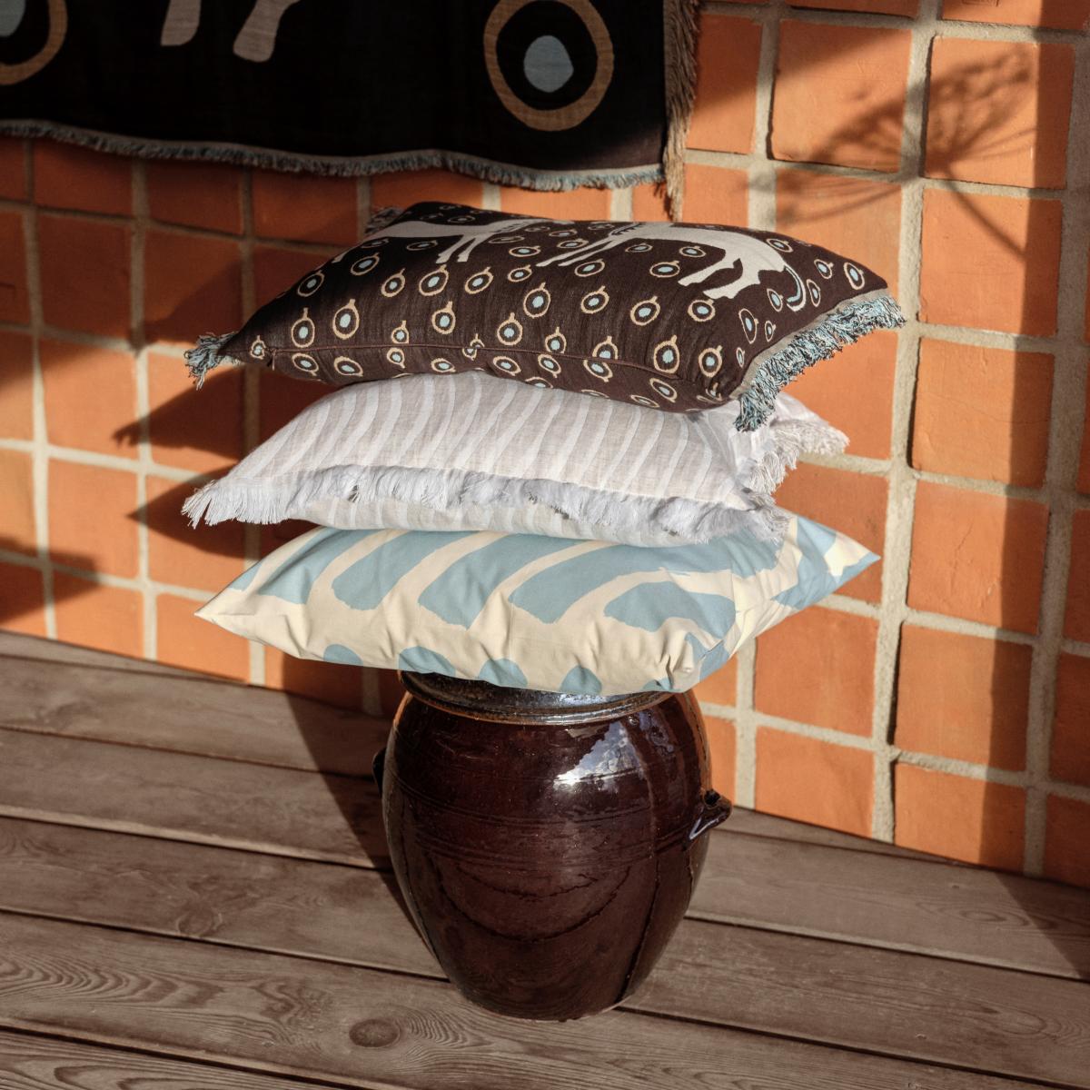 Silkkikuikka cushion cover with fringe 50x50 cm, from Finnish brand Marimekko, is a naturally coloured cushion cover with jacquard weave. The Silkkikuikka pattern has been weaved into this cushion cover, which is made from a cotton and linen blend. The cushion cover's fringes run along all sides, and the cover has a hidden zip on one side. The Silkkikuikka pattern was created by designer Maija Isola after she had spent many evenings and nights painting to music in Marimekko's printing factory.