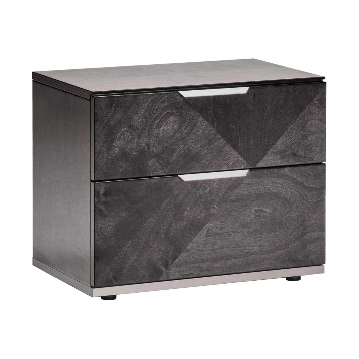 Design. The Silva Bedside table is crafted from dark solid birch wood, showcasing stunning texture and design. The subtle geometric shapes and wood grains turn this into an interesting piece which is sure to stand out in your bedroom. The elegant silver metal handles compliment the dark wood perfectly, adding to the modern design it presents. You will have plenty of space to hide away your books, accessories and more with the Silva Bedside, and plenty of space for a photo frame or lamp to sit atop, completing the setting for a space to relax before heading for a restful sleep.