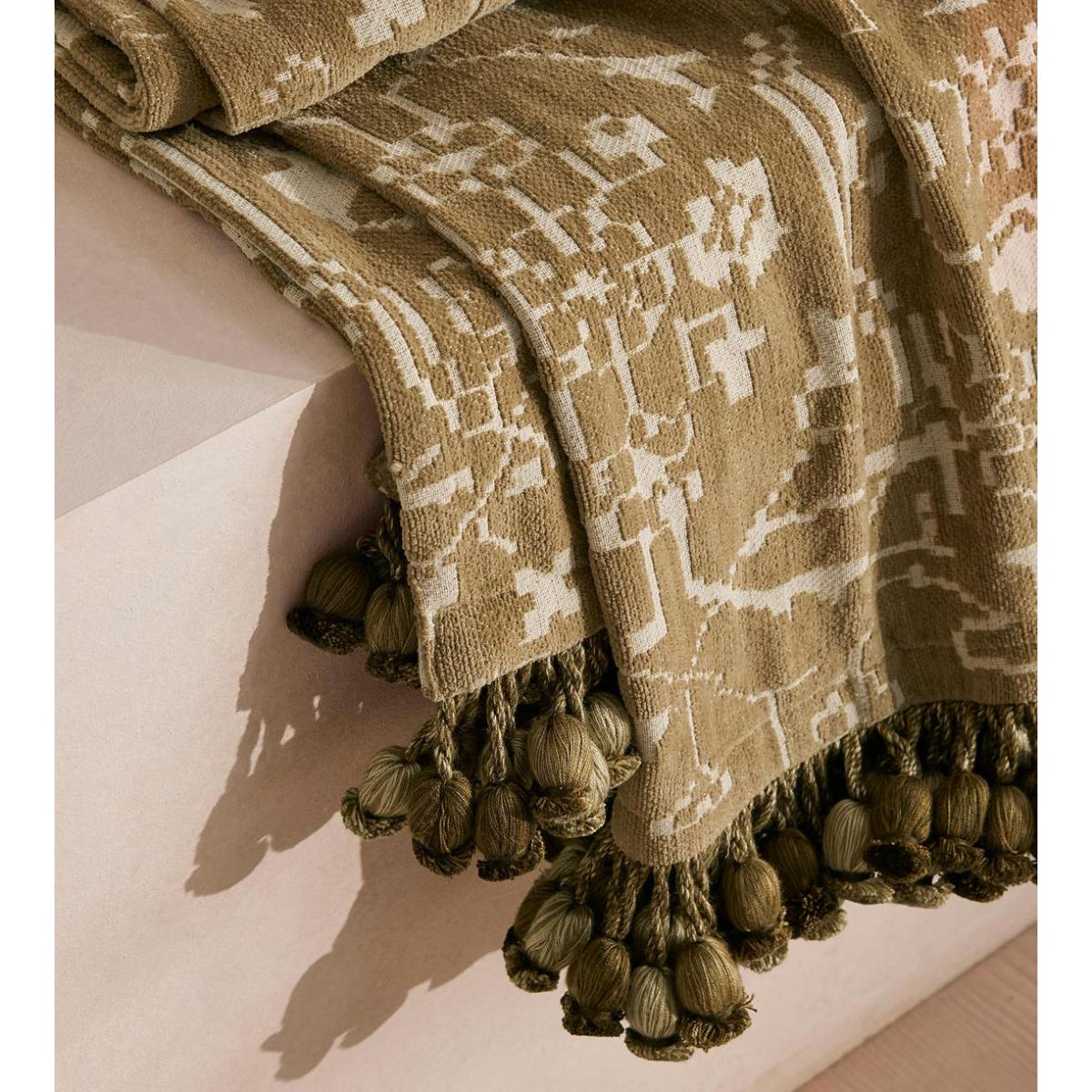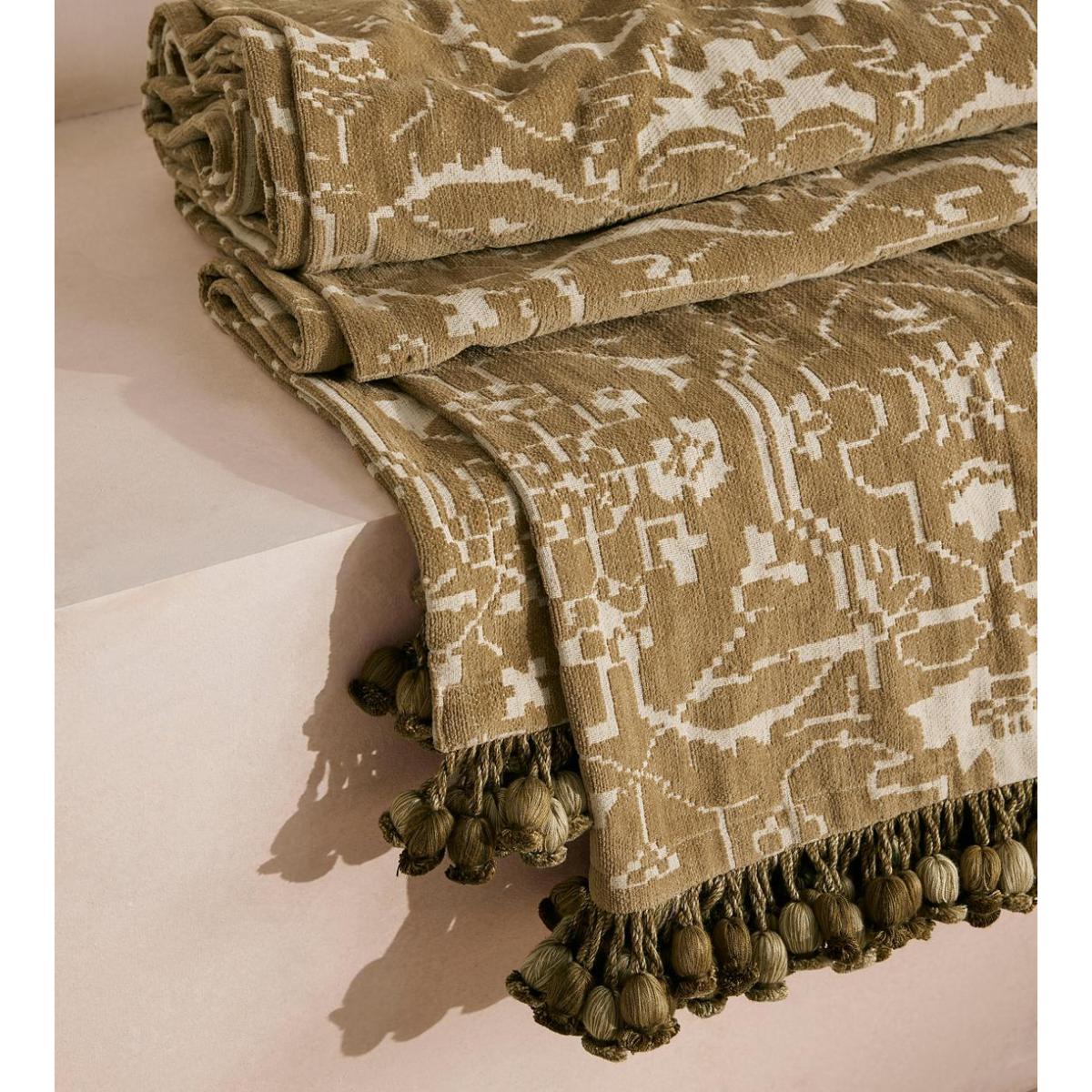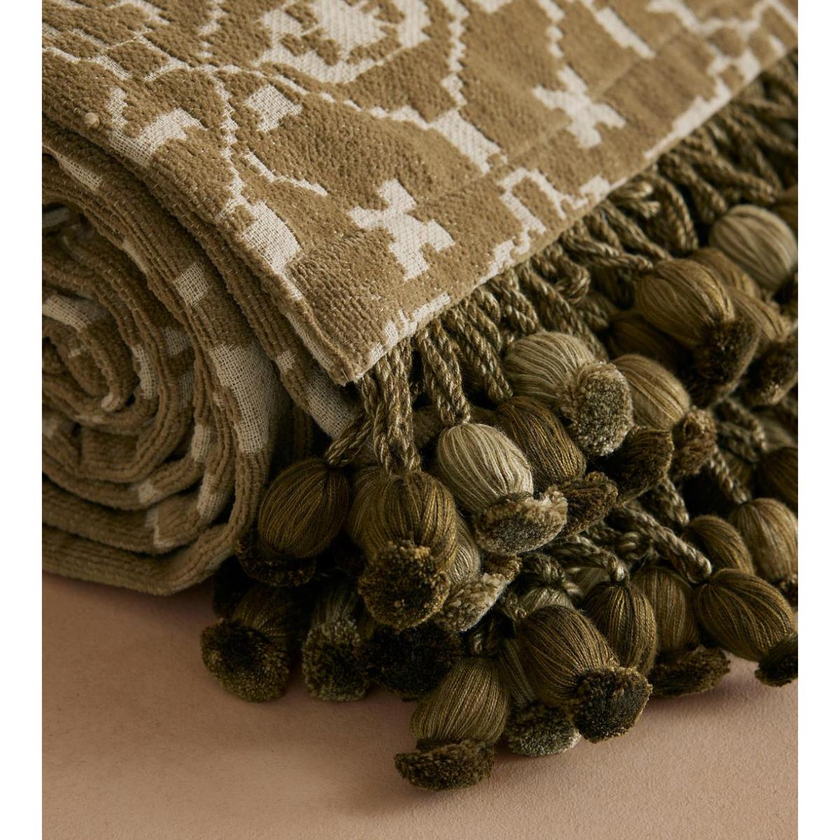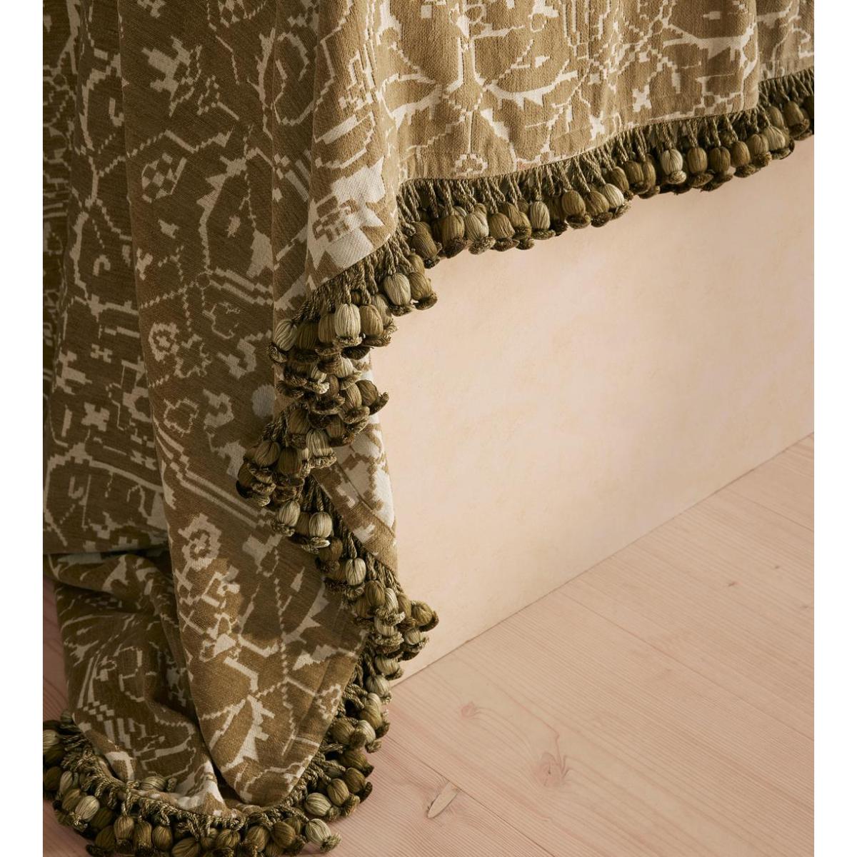 Our luxurious Silvanus bedspread is inspired by a damask motif found in Babington House in a olive green jacquard fabric that's designed in-house and handwoven in India. Decorated with clustered pom-pom trims, this is our signature classic style to instantly update your living or bedroom space. Woven jacquard bedspread Designed in-house Crafted in India Cotton blend Clustered pom-pom trim detail Olive tones Inspired by a damask motif found in Babington House