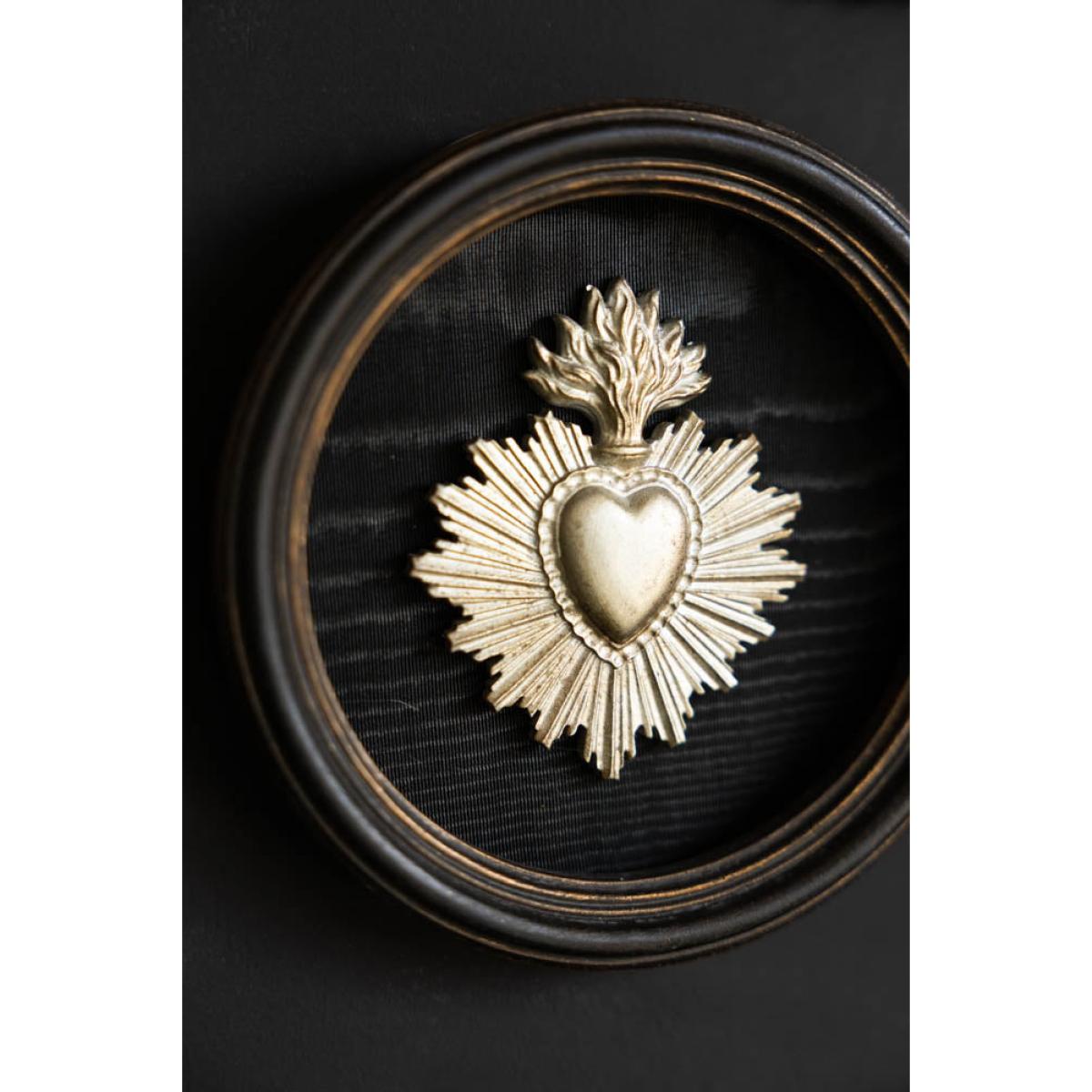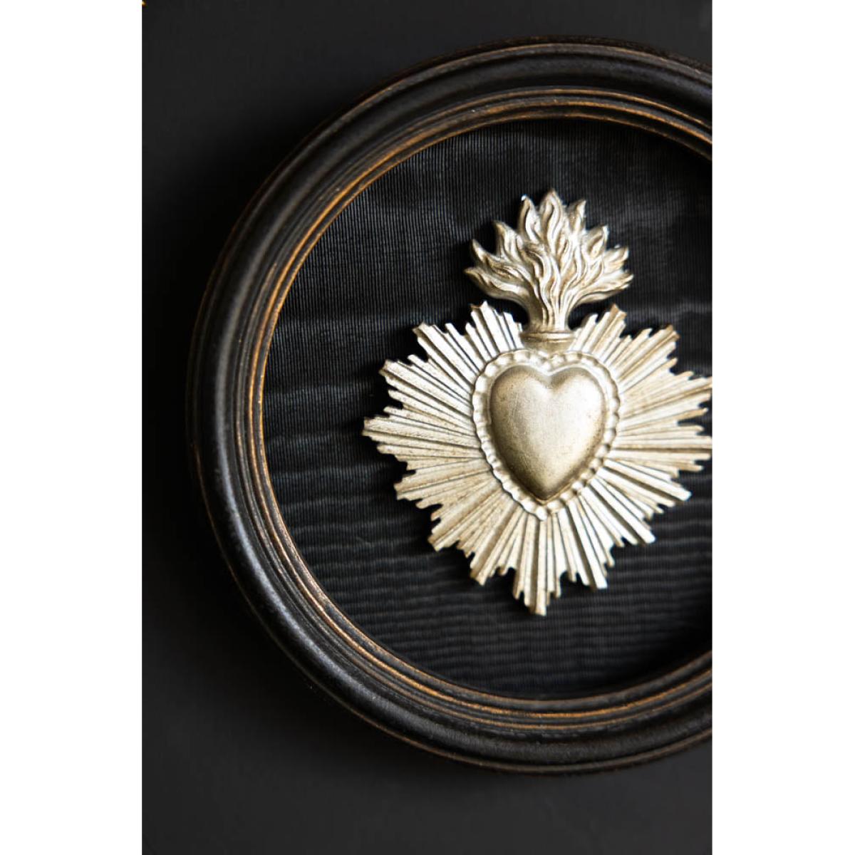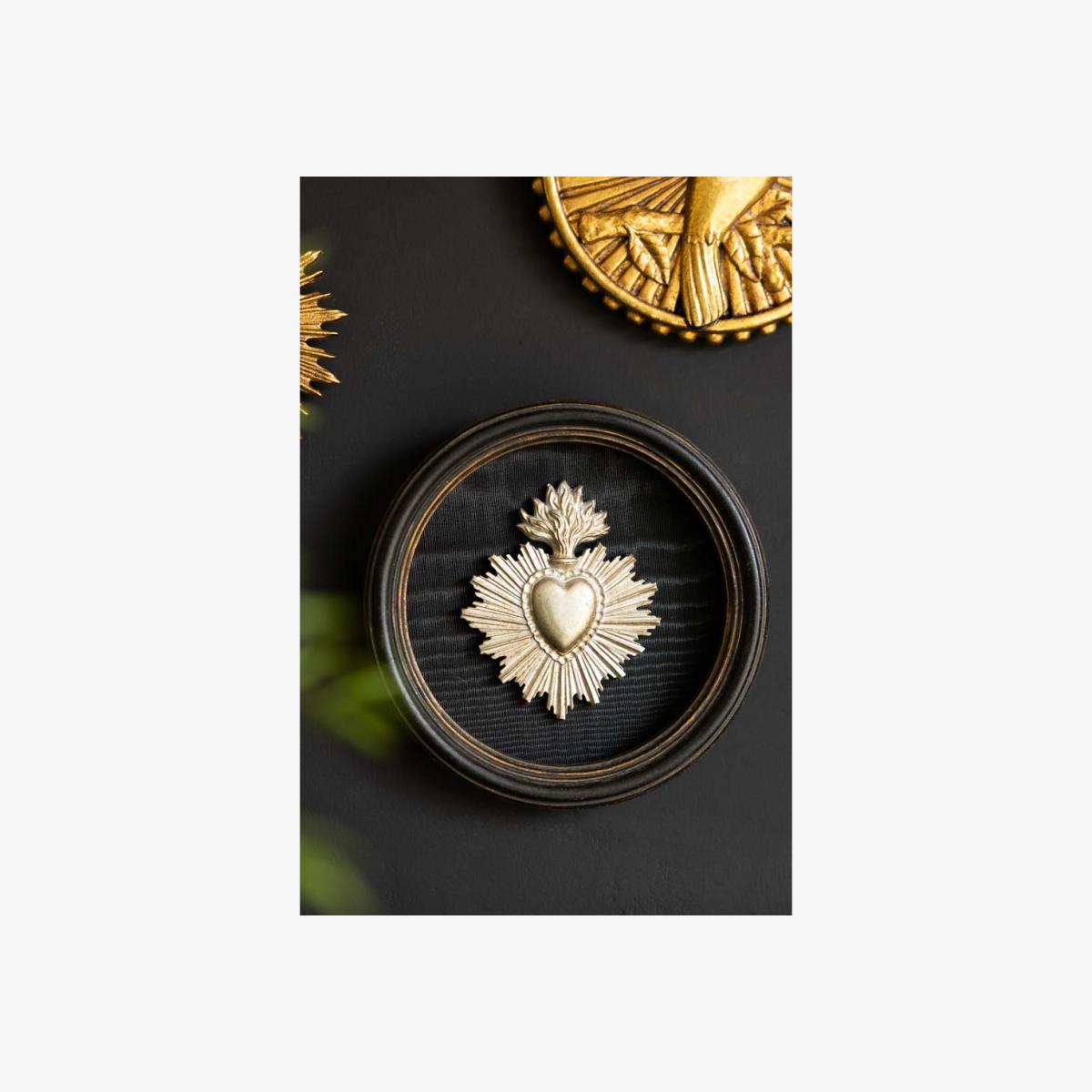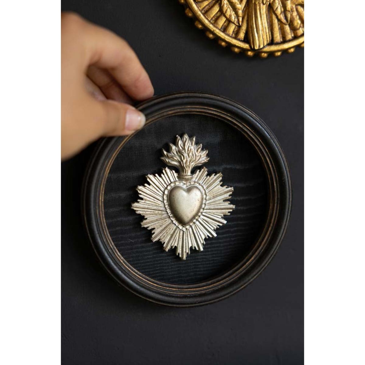 Celebrate love, devotion, and soulful interiors with the Silver Antiqued Style Milagro Heart Wall Decor. Inspired by traditional Mexican milagros; small religious charms used for healing and protection, this piece features a radiant heart with a flaming crown, set against a dark oval backdrop for maximum contrast and impact. Crafted with an antique silver finish and beautifully displayed in a rounded black frame, this sacred heart makes a striking addition to gallery walls, bedside nooks, or meaningful corners of your home. Whether you're drawn to its spiritual symbolism or its artful aesthetic, it’s a beautiful token of love and light. - Dimensions: Diameter 13.5cm - Material: Metal & Framed Wall Plaque