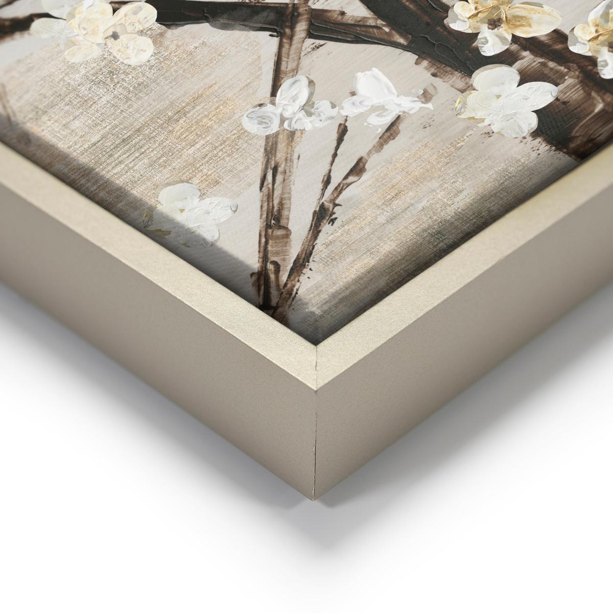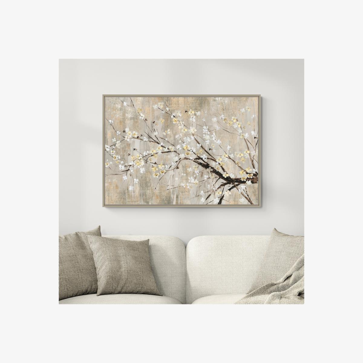 * Neutral, timeless aesthetic * Calming artwork * Framed and ready to display This stunning artwork by Asia Jensen features delicate blooming branches with white and golden flowers, set against a soft, textured background. The large-scale floral design, framed in a champagne-coloured float frame, complements the neutral and metallic tones of the piece, creating a serene, timeless feel. With shades of champagne, soft white, muted gold, earthy browns, and beige, it adds a refined elegance to any room. Perfect for modern, transitional, classic, or Japandi interiors, this canvas brings natural beauty and a minimalist aesthetic to your space. Ready to hang, it’s ideal for creating a calming atmosphere, bringing a beautiful blend of sophistication and tranquility to your home.
