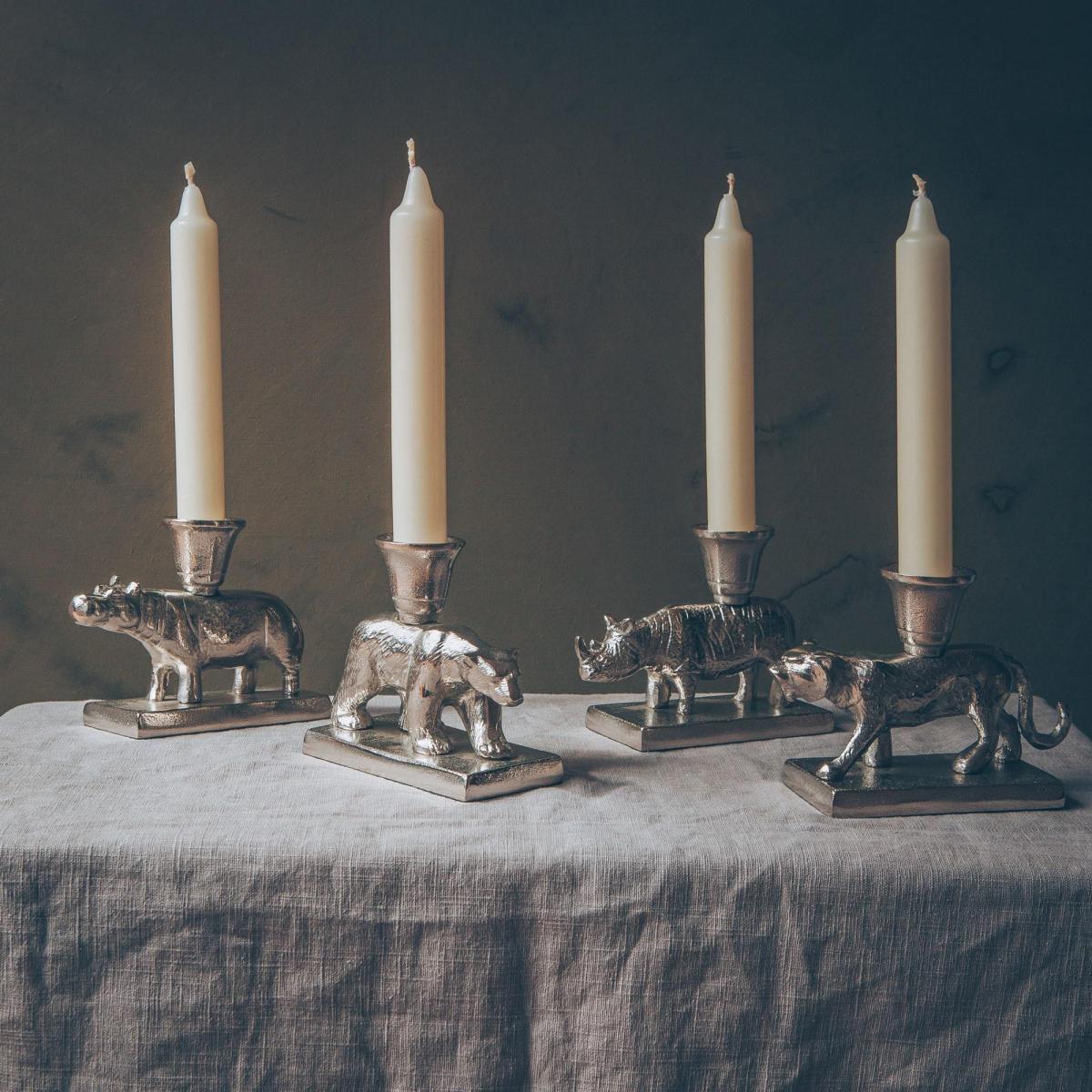 An eye-catching, ornamental collection of striking taper candle holders, in four exotic animal designs; bear, tiger, hippo or rhino. Perfect for an elegant table setting or illuminating dark corners with style. Hippo (EGW1005): H10 x W14 x D5. 5cm Rhino (EGW1006): H10 x W13 x D5. 5cm Tiger (EGW1007): H10 x W14. 5 x D5. 5cm Bear (EGW1008): H10 x W12. 5 x D5. 5cm Made from aluminium. Lead-free, silver nickel finish. Sold individually.
