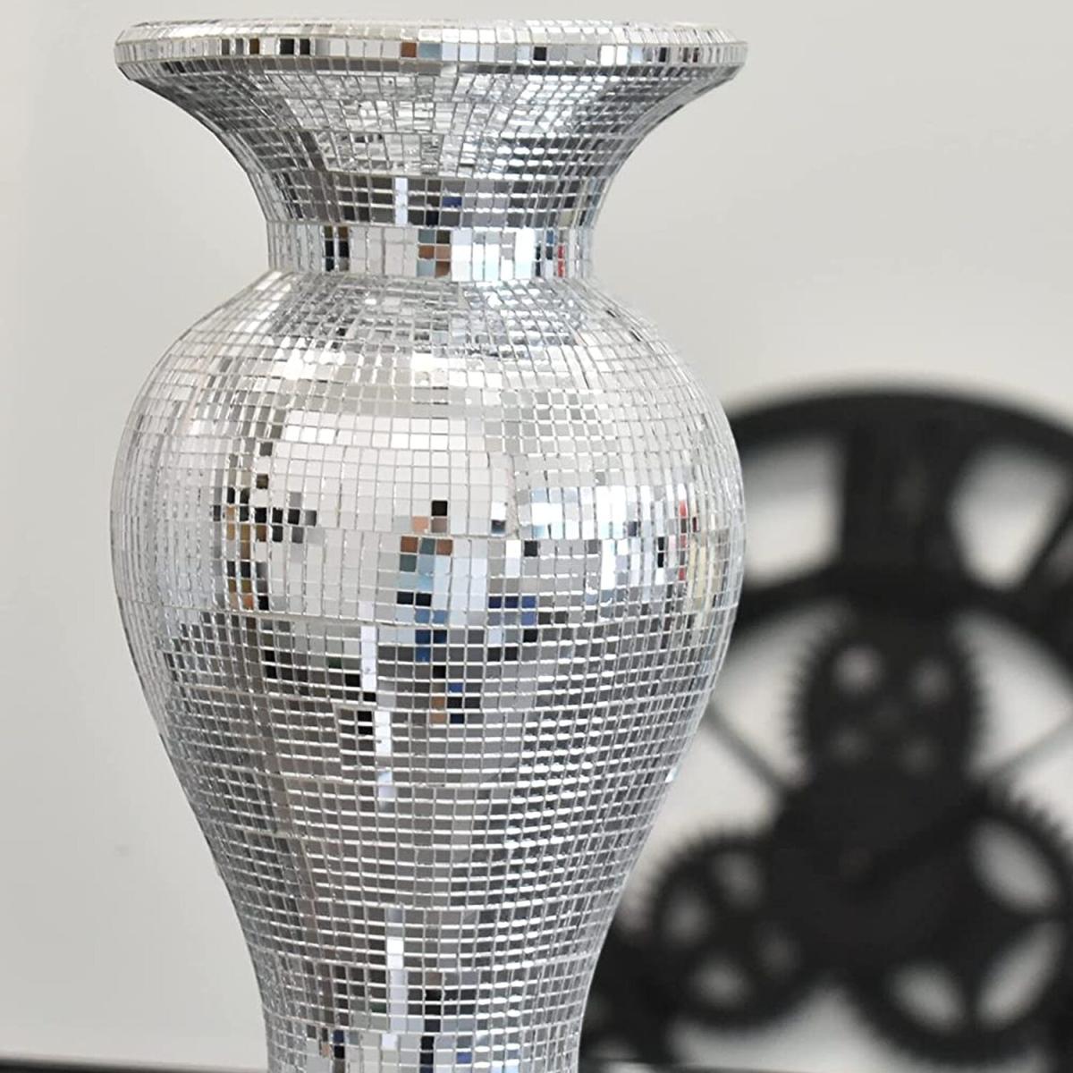 I love this mirrored pot vase because of its striking reflective surface and modern silhouette, making it a versatile piece for a variety of interiors. It works particularly well in contemporary or glam schemes, adding a touch of luxe and creating visual interest through its mirrored finish. For styling, try pairing it with a simple arrangement of greenery or tall blooms to enhance its scale without overwhelming, or leave it empty to serve as a decorative focal point. Its wide curve provides stability and allows for creative displays, making it a practical yetStatement option for both console tables and sideboards.