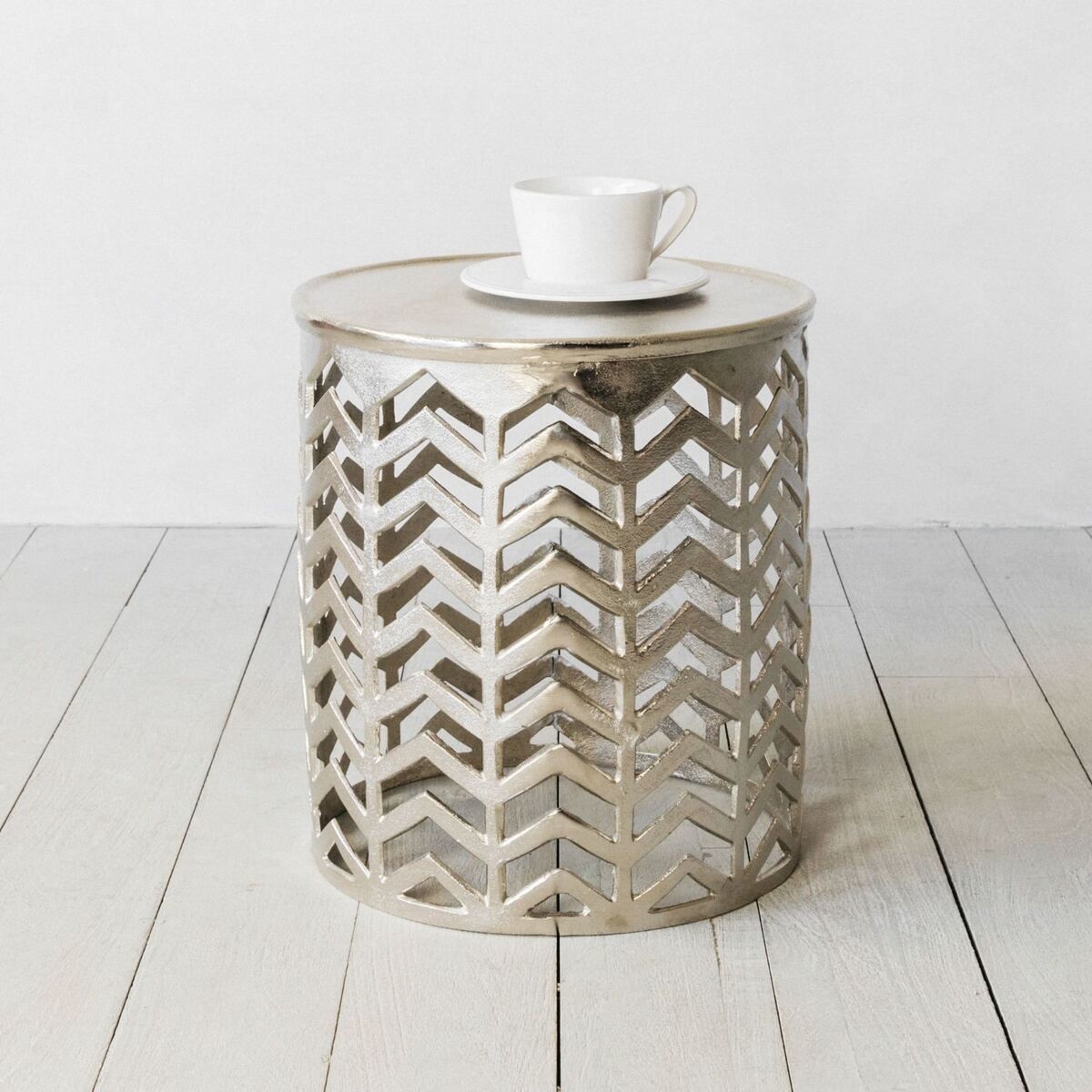 Add a touch of glamour to your interior with our chevron side table. Made from aluminium, this unique piece has a silver finish for added shine. Each one features cut-outs in a chevron pattern, adding interest and visual texture to a room. Position next to an armchair to support a table lamp, coaster, or vase of gorgeous blooms. Exclusive to G&G.