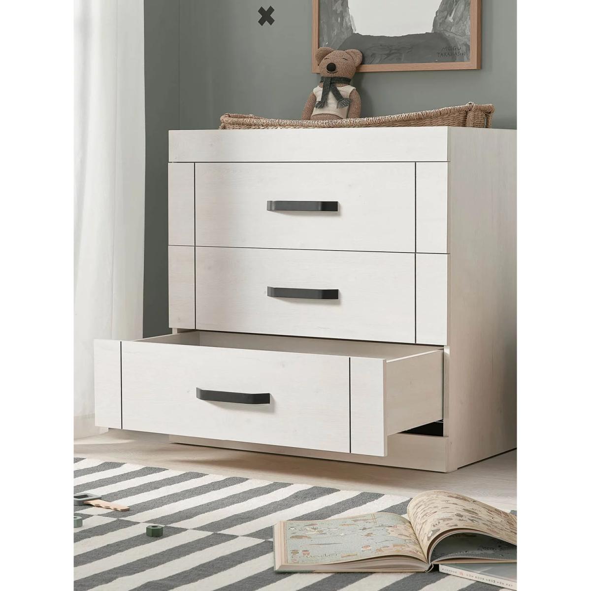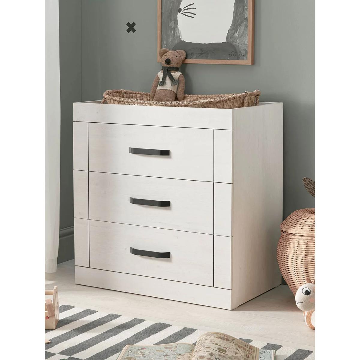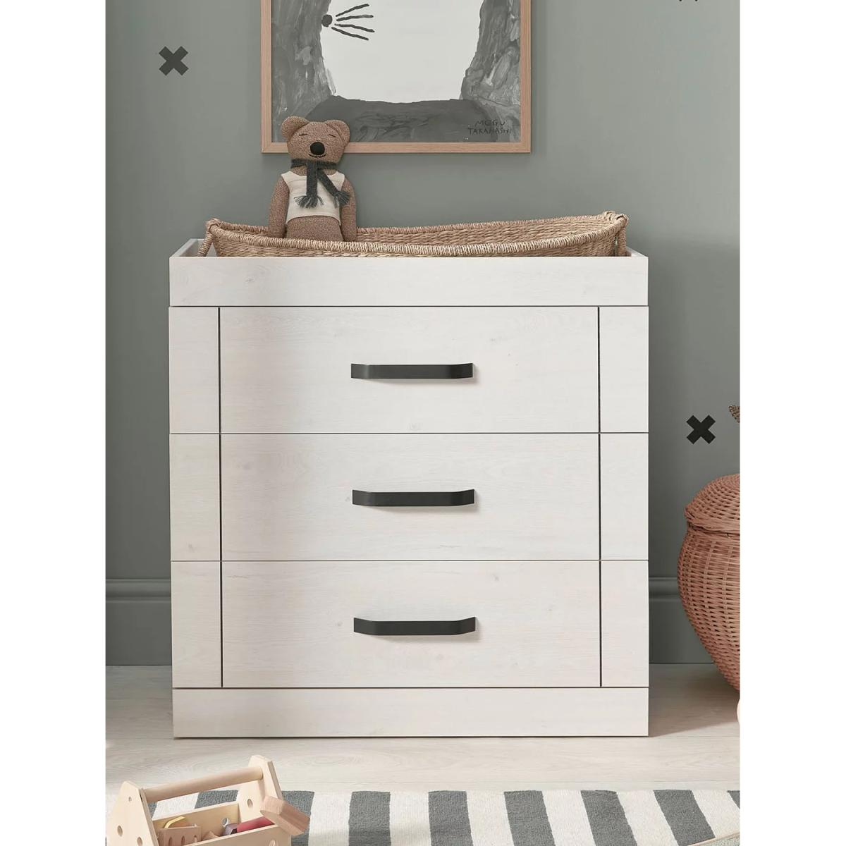 Calming and stylish, the Silver Cross Alnmouth nursery furniture collection has a washed oak finish for a modern seaside-inspired vibe. Calming and stylish with its washed oak finish and contemporary black handles, this dresser has a modern vibe to suit any home. It has plenty of storage, with an integrated changer top for nappy changes. The Alnmouth dresser has 3 deep, soft-close drawers with plenty of storage for keeping all of the baby's essentials neatly stored and the integrated changer top provides a handy spot for nappy changes.