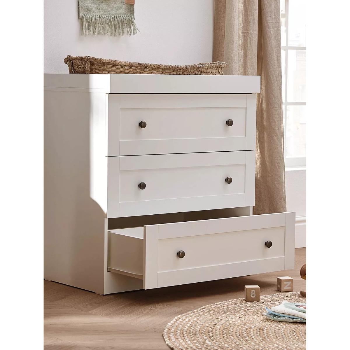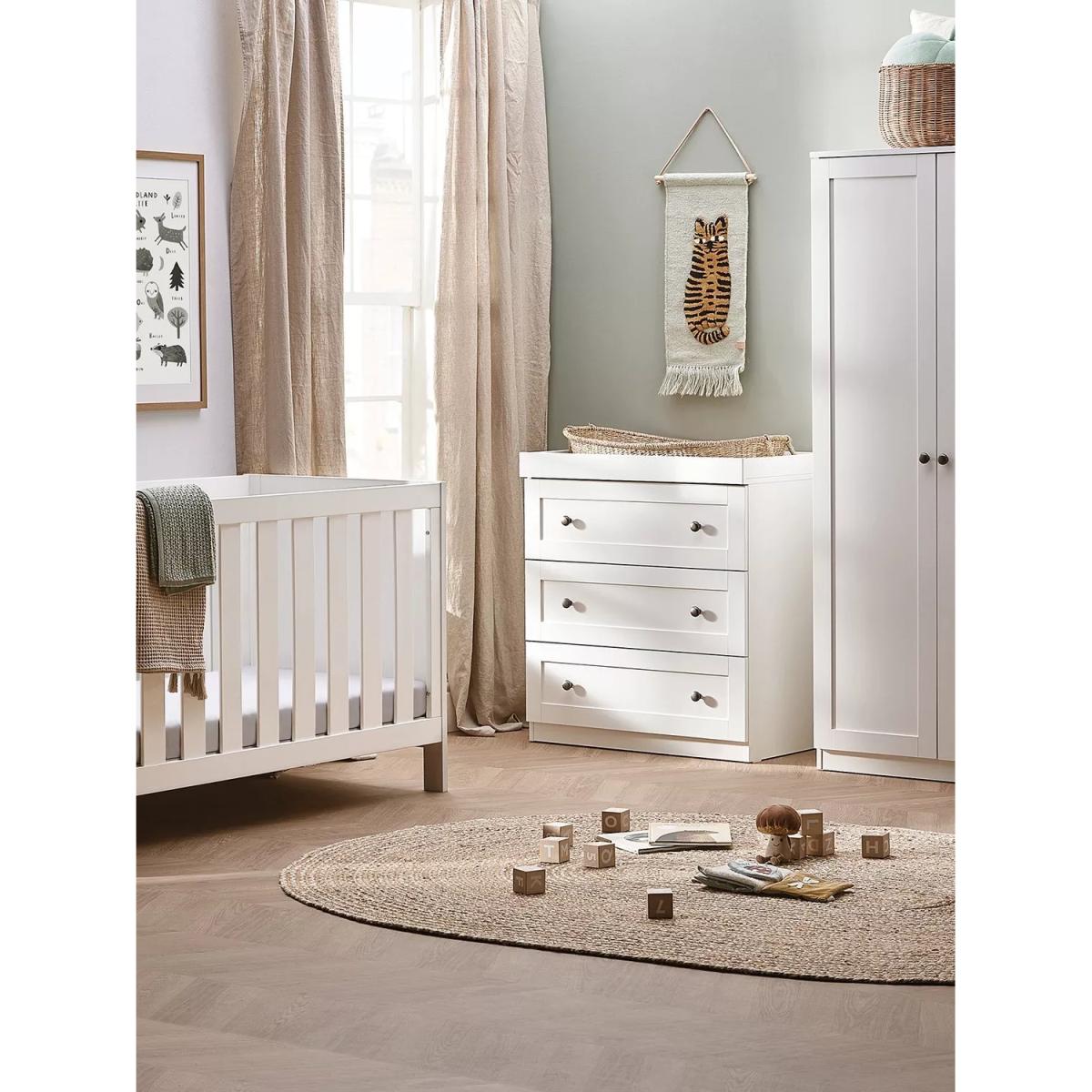 A stylish addition that fits seamlessly into any home, the Silver Cross Bromley nursery furniture collection is timeless and elegant. The set has all the essentials you need, with a cot to toddler bed and dresser. Providing the perfect canvas for creating your little one’s dream nursery, Bromley features a soft finish with contrasting cast pewter handles. Bromley nursery furniture is expertly crafted for long-lasting quality so you can enjoy it for years to come – whether it’s passed through your family or onto another. Cot to toddler bed: The Bromley cot bed will suit every stage of your little one’s growth from their first night at home up to their toddler years. With three mattress heights, the cot bed should be used in the highest setting for your newborn and lowered gradually as they start to roll, sit and stand. When the cot railings are no longer needed, they can be easily removed to leave behind toddler bed using the same base. Dresser: Keep things organised in Bromley’s spacious three-drawer dresser, with plenty of room for clothing and bedding. For nappy and outfit changes, attach the changer top to your dresser or, when no longer needed, use it as an arts and crafts tray or storage basket. Wardrobe: The Silver Cross Bromley wardrobe is the perfect spot to display your baby’s clothing, with two hanging rails and an overhead shelf providing plenty of space. As your baby grows, the lower rail can be easily removed for larger garments. Crafted for long-lasting quality From newborn to toddler (approx. 4 years) Cot bed converts easily to a toddler bed to grow with your child Compatible with all Silver Cross True. Fit™ mattresses or standard size 140cm x 70cm mattresses (sold separately) Full-size dresser with changer top and three deep drawers Full-size wardrobe with two hanging rails and overhead shelf