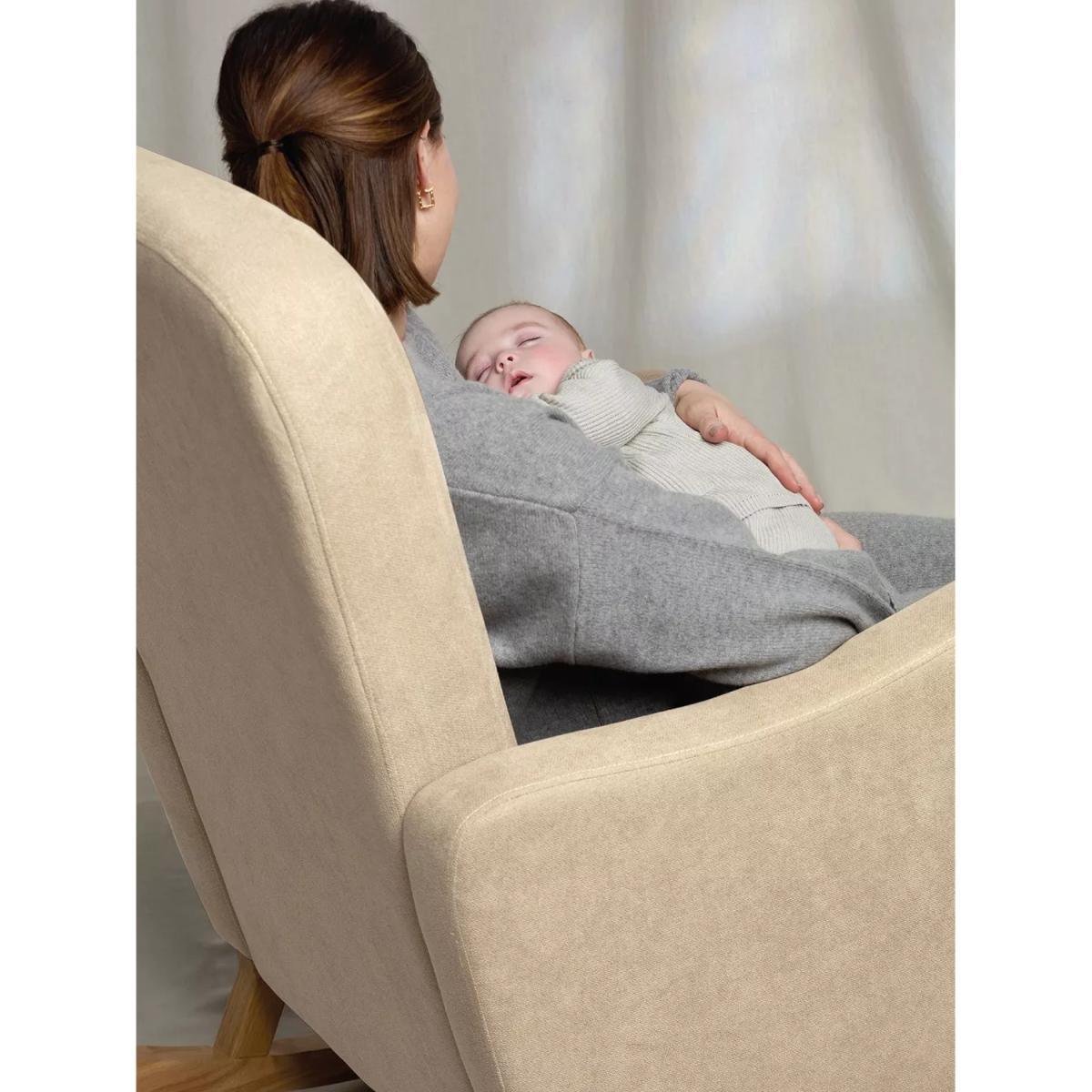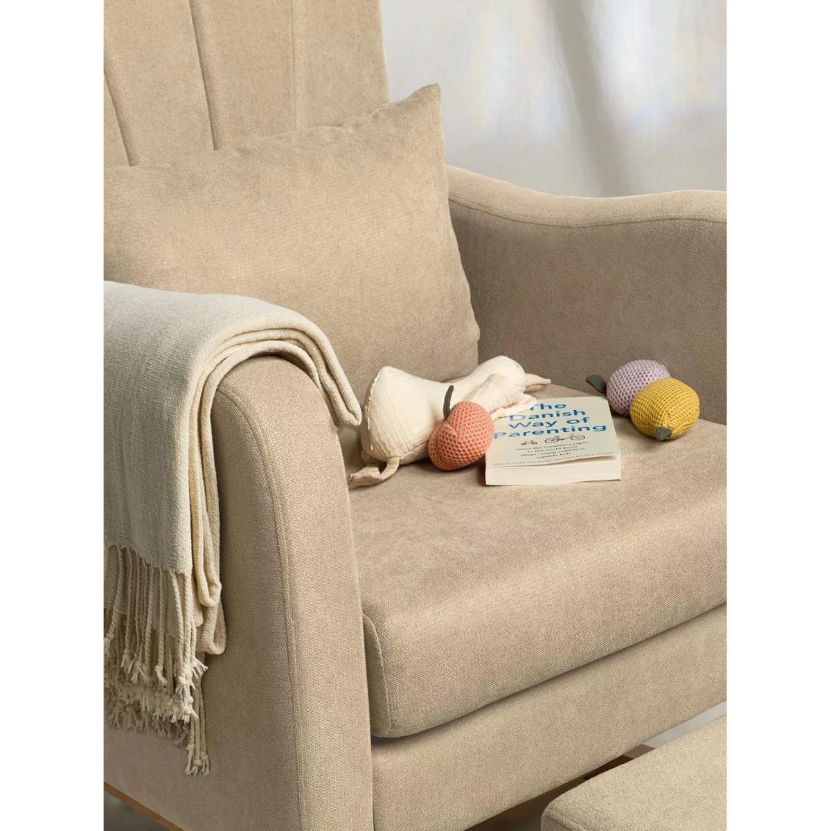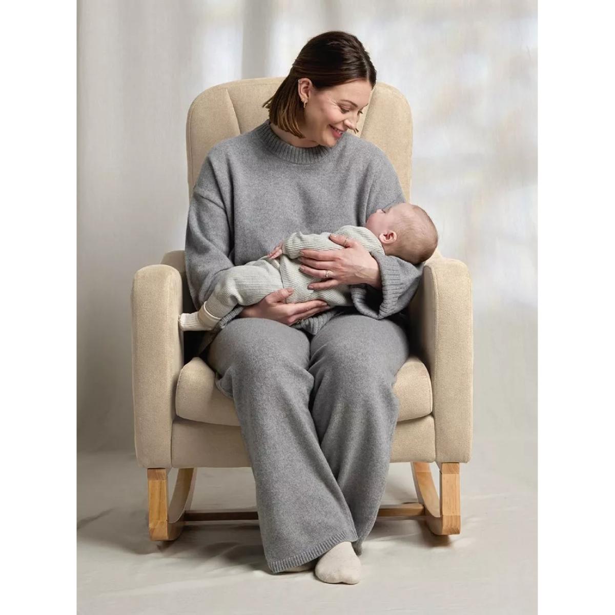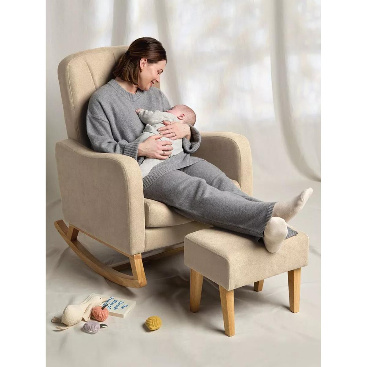 Cuddle, comfort, connect. Embrace those special moments in the Silver Cross Carmel nursing chair. Whether you’re feeding, snuggling or soothing your baby, the Carmel nursing chair is the most comfortable spot with its ergonomic seat, curved armrests, sleigh rocking legs and coordinating footstool. Ergonomic support - Carmel is intuitively designed to provide full body support, with an extended backrest, lumbar support cushion and curved armrests, so that you can find your optimum when nursing or cuddling your little one. After a long day it’s the perfect place to relax, with the coordinating, padded footstool providing added support for tired feet. Gentle rocking motion - With solid natural wood rocking legs and a sturdy frame, you can rock your baby soundly during those late nights and early mornings. Part of the furniture - Crafted with a sumptuous woven fabric in a timeless shade, complemented by natural wood accents, Carmel will elevate any nursery with its calming style. As your little one grows up, use Carmel around your home as a timeless piece of furniture for years to come.