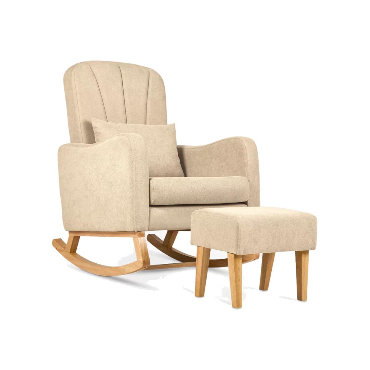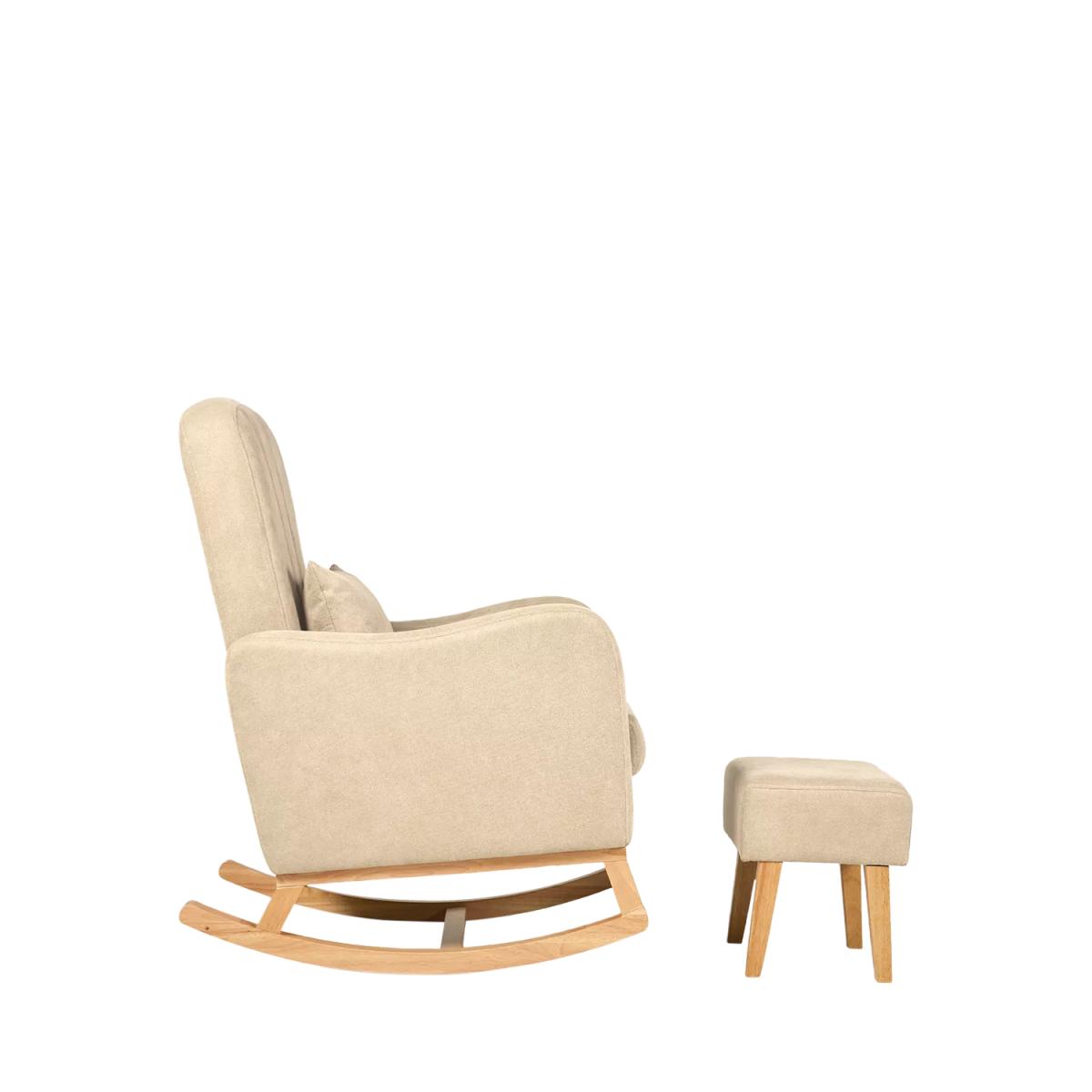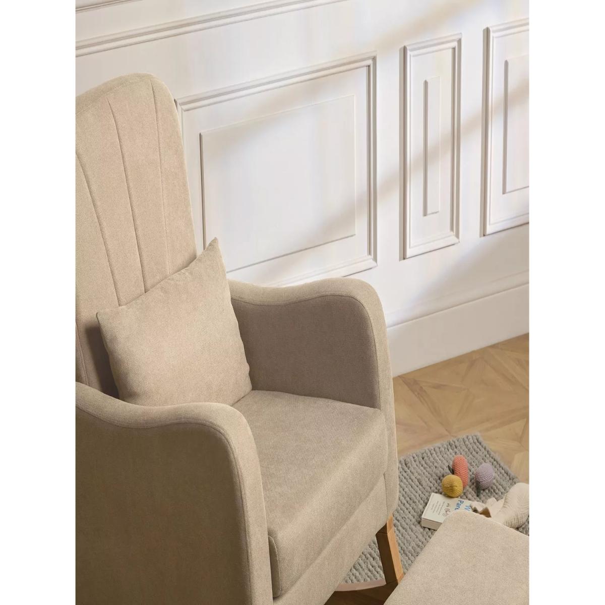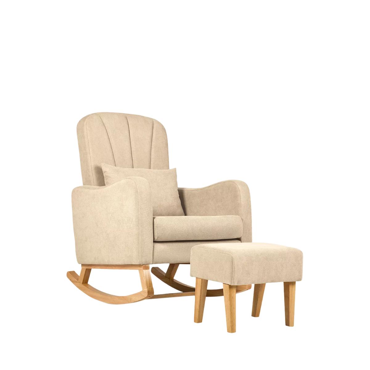 Cuddle, comfort, connect. Embrace those special moments in the Silver Cross Carmel nursing chair. Whether you’re feeding, snuggling or soothing your baby, the Carmel nursing chair is the most comfortable spot with its ergonomic seat, curved armrests, sleigh rocking legs and coordinating footstool. Ergonomic support - Carmel is intuitively designed to provide full body support, with an extended backrest, lumbar support cushion and curved armrests, so that you can find your optimum when nursing or cuddling your little one. After a long day it’s the perfect place to relax, with the coordinating, padded footstool providing added support for tired feet. Gentle rocking motion - With solid natural wood rocking legs and a sturdy frame, you can rock your baby soundly during those late nights and early mornings. Part of the furniture - Crafted with a sumptuous woven fabric in a timeless shade, complemented by natural wood accents, Carmel will elevate any nursery with its calming style. As your little one grows up, use Carmel around your home as a timeless piece of furniture for years to come.