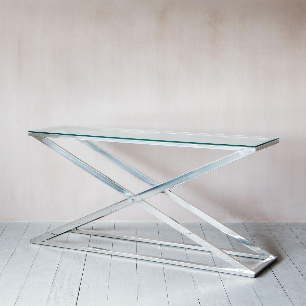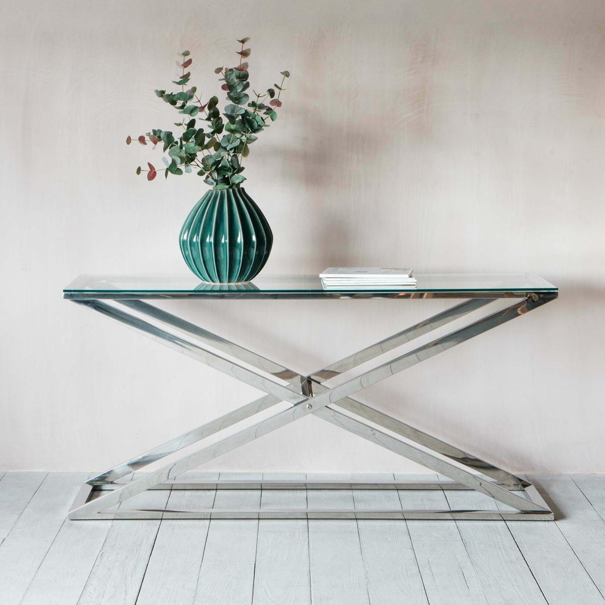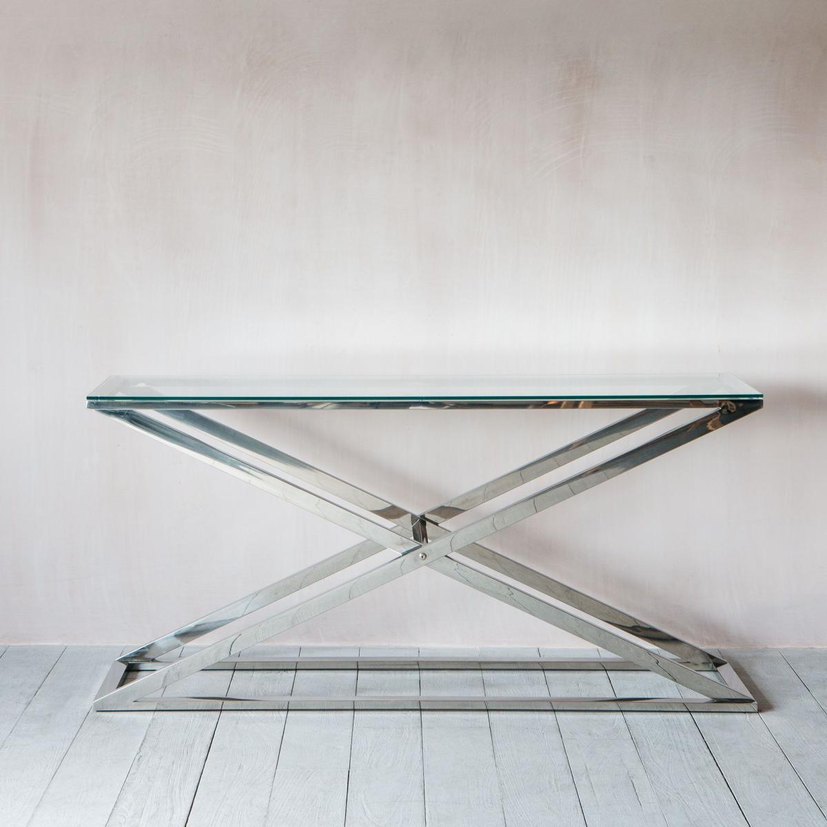 I love this silver cross console table for its sleek, modern silhouette that makes it a versatile statement piece. It works particularly well in contemporary or minimalist interiors, adding a touch of sophistication without feeling overpowering. Practical styling tips include using it as a welcoming entryway table with a decorative tray for keys and mail, or dressing it up with a vase of fresh greenery and a few carefully chosen decor accents. Its reflective surface and striking base create an elegant focal point, making it a great anchor in both small hallways and larger open-plan spaces.