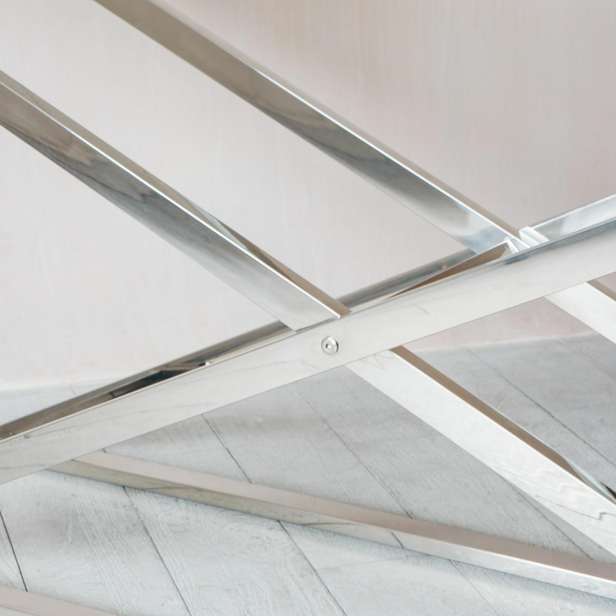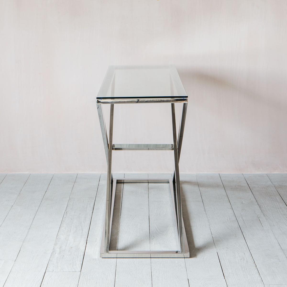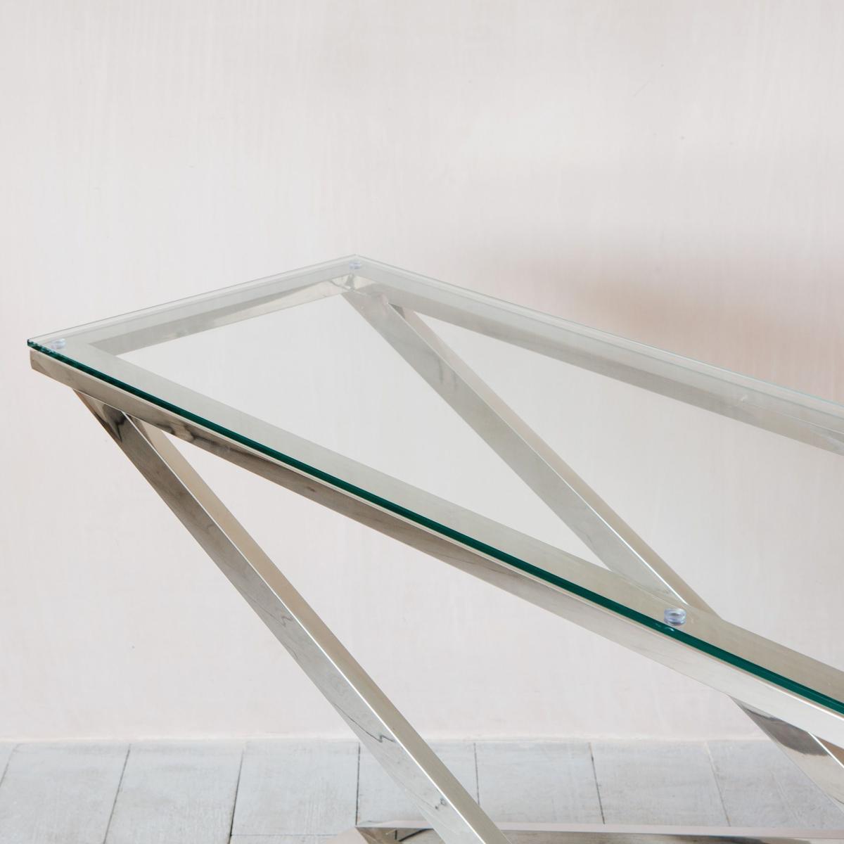 I love this silver cross console table for its sleek, modern silhouette that makes it a versatile statement piece. It works particularly well in contemporary or minimalist interiors, adding a touch of sophistication without feeling overpowering. Practical styling tips include using it as a welcoming entryway table with a decorative tray for keys and mail, or dressing it up with a vase of fresh greenery and a few carefully chosen decor accents. Its reflective surface and striking base create an elegant focal point, making it a great anchor in both small hallways and larger open-plan spaces.