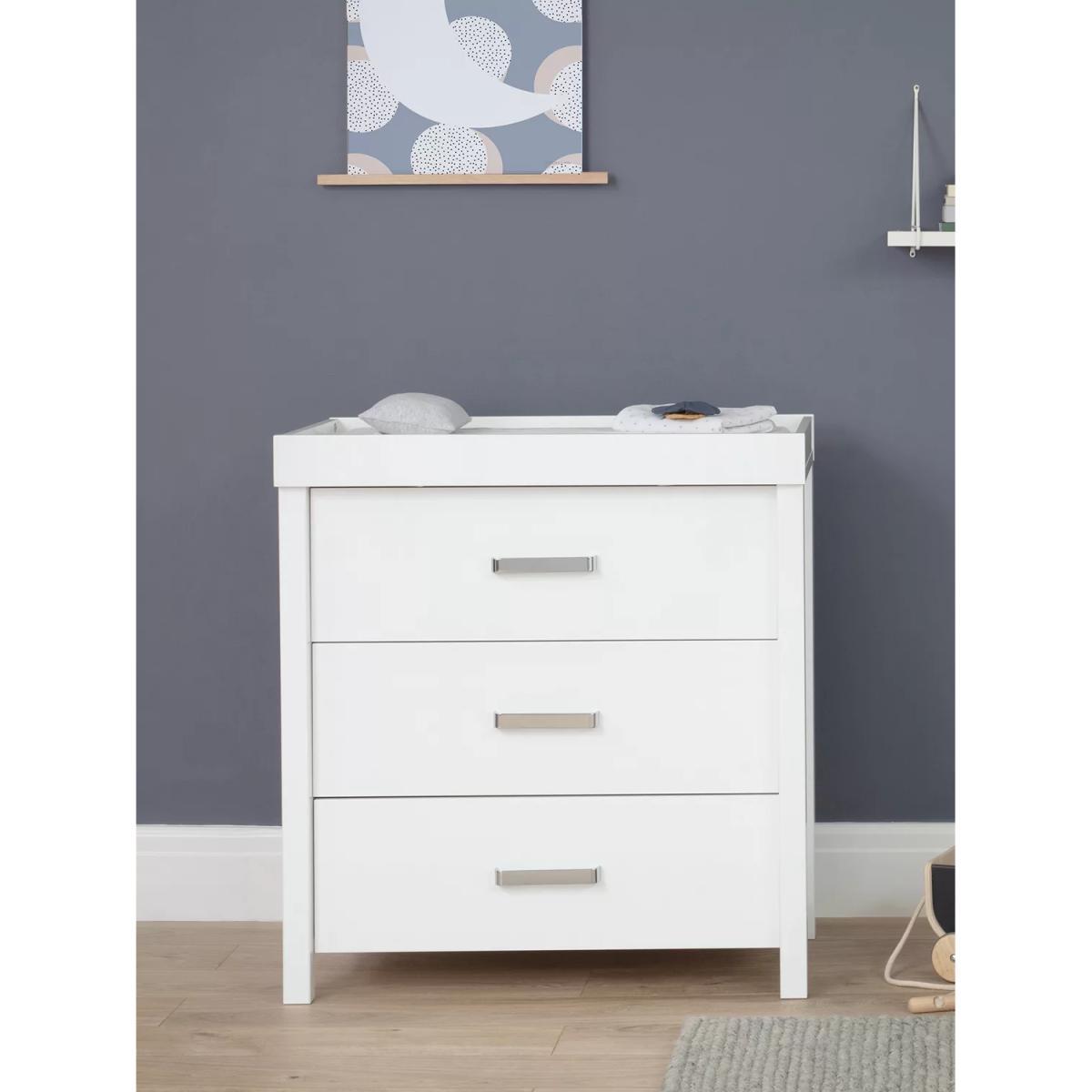 I love this white changer/dresser because it offers a sleek, modern look that complements a variety of nursery styles-from Scandi minimalism to more traditional interiors. The clean lines and neutral colour make it a versatile piece, easily fitting into both contemporary and classic spaces. Practical styling tips include pairing it with soft, neutral textiles for a calming atmosphere, or adding colourful accessories like cushions or artwork to bring personality to the space. It works well in nurseries that aim for a clutter-free, organised feel, and the three drawers provide ample storage for essentials, helping keep the room tidy. Overall, it’s a functional and stylish addition that balances practicality with aesthetic appeal.