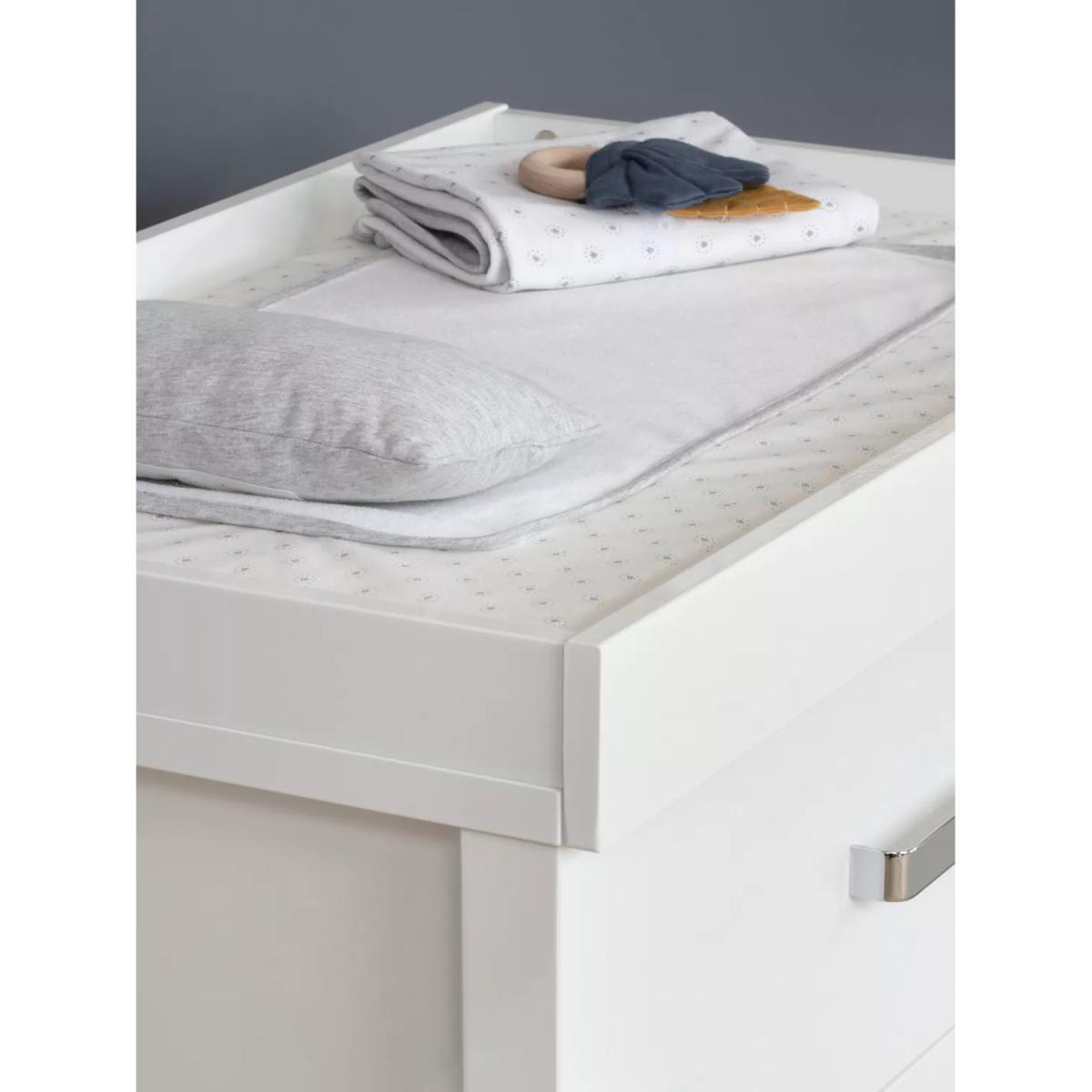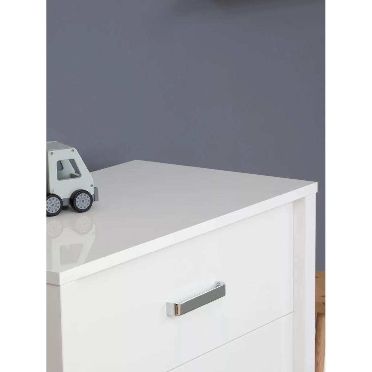 The Primrose Hill nursery set from Silver Cross is modern and contemporary with a high gloss finish to complement any interior style. The Primrose Hill Dresser has three generous drawers with stylish brushed satin chrome handles. The changer top provides a convenient space for nappy changes and can be removed as your little one grows, leaving a stylish set of drawers. Pair with the matching cotbed and wardrobe to complete your nursery.