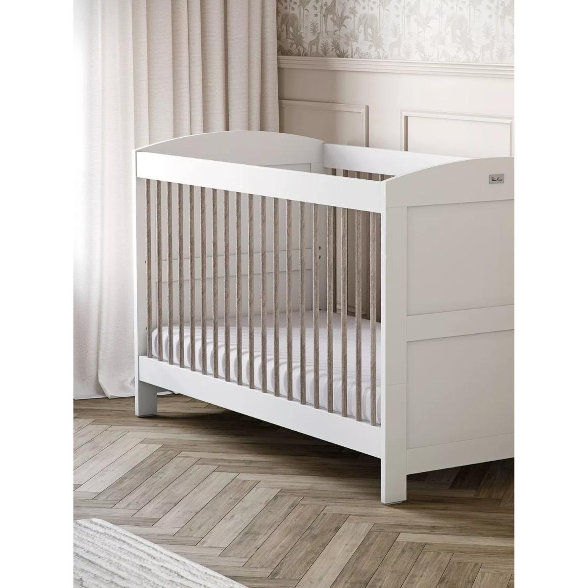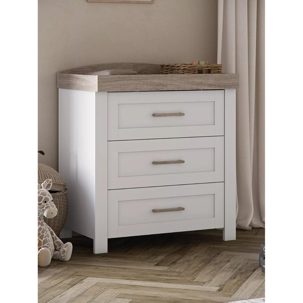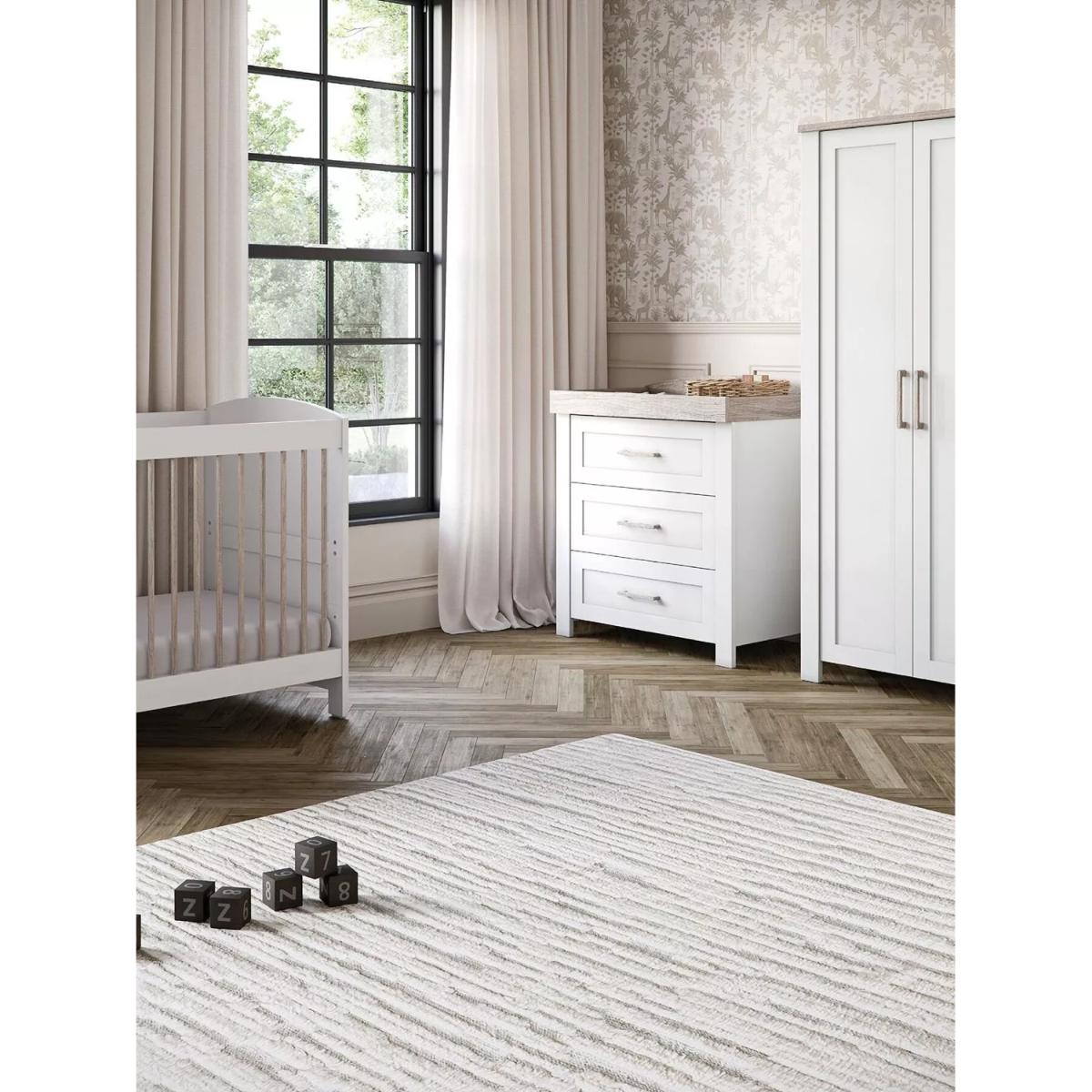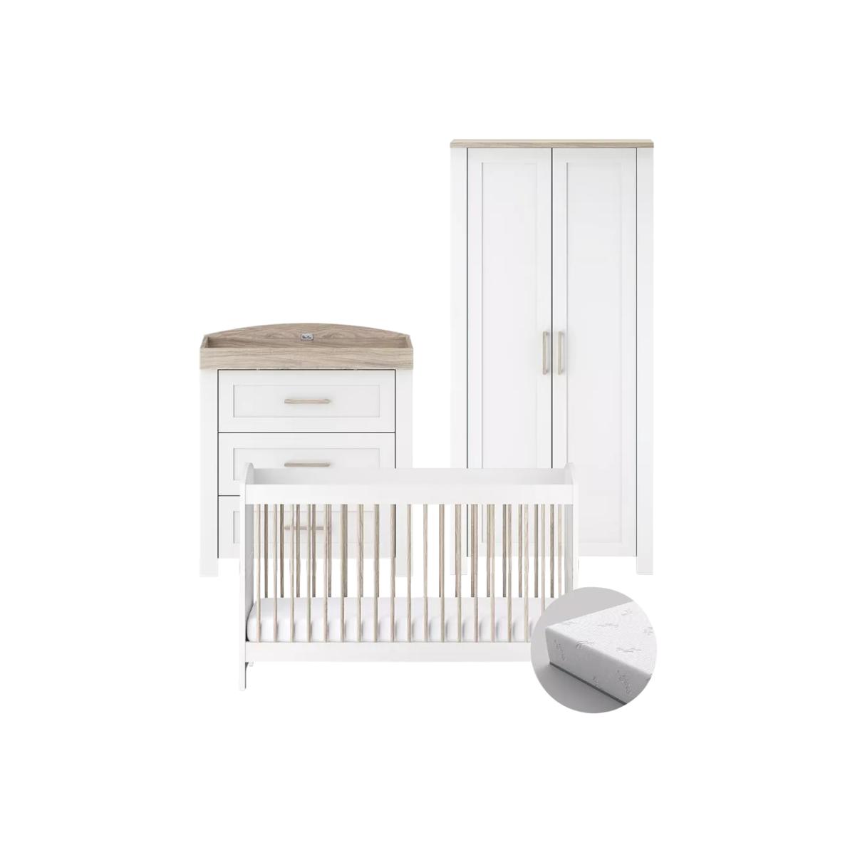 Create your dream nursery with the Silver Cross Valencia 4-piece nursery furniture set, designed to grow with your little one from newborn to toddler. Featuring a timeless white finish and natural ash accents, the Valencia set creates a calming, fresh canvas for your nursery. This versatile, two-tone collection includes a cot bed that easily converts to a toddler bed, a dresser with a removable changer top for added longevity, and a spacious wardrobe, all crafted for durability over the years. Plus, with the True. Fit™ Eco Fibre Cotbed Mattress, your little one will be safe and comfortable all night long. Cot to Toddler Bed The Valencia cotbed will suit every stage of your little one’s growth from their first night at home up to their toddler years. With three mattress heights, the cotbed should be used in the highest setting for your newborn and lowered gradually as they start to roll, sit and stand. When the cot railings are no longer needed, they can be easily removed to leave behind a toddler bed using the same base. TrueFit™ Eco Fibre Cotbed Mattress With an eco-fibre core to aid breathability and regulate temperature, and a super soft knitted lining, the True. Fit™ Eco Fibre Cotbed Mattress is the perfect choice for your little dreamer. The high-quality mattress also features Silver Cross’ True. Fit™ edge-to-edge corners for the most secure fit inside your cot, and a firm core for safe sleep from newborn to toddler. Dresser The Valencia dresser is the ultimate storage solution for your little one’s first bedroom. With three deep drawers, there’s plenty of space for keeping clothing and bedding organised. The removable changer top can be easily attached to the top of your dresser for convenient nappy changes and used over the years for additional storage space. Wardrobe With twin hanging rails and two shelves, there’s plenty of space to store your child’s clothing. As your baby grows, the lower rail and shelf can be easily removed so you can continue to use it throughout their childhood.