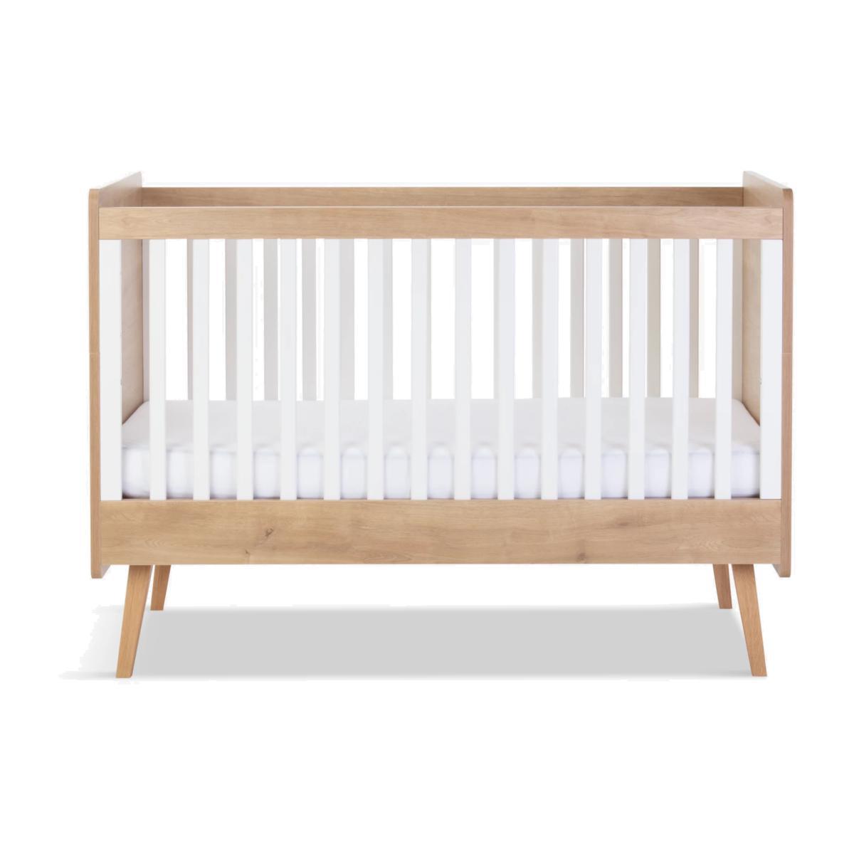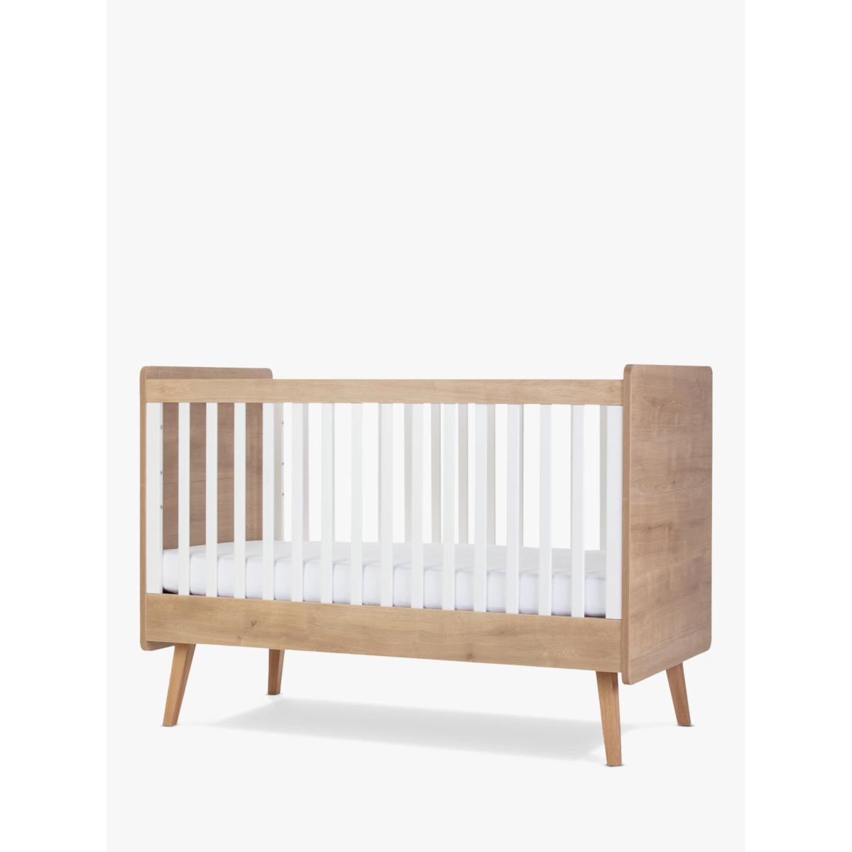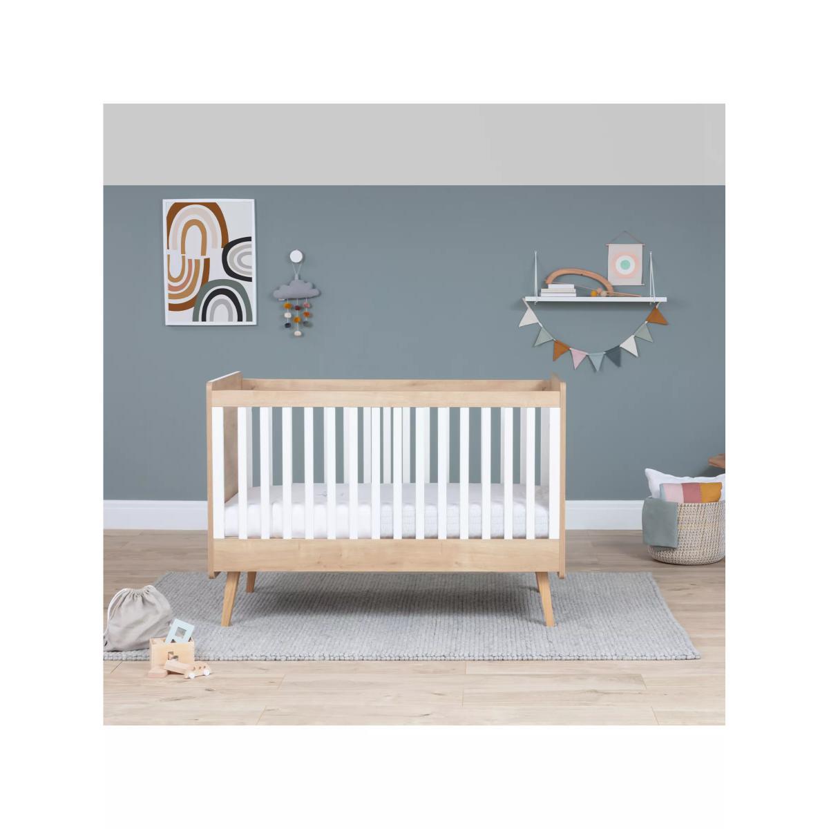 This stylish Westport cotbed from Silver Cross is a beautiful addition to your nursery, combining mid-century minimalist inspiration with a contemporary twist. The warm oak effect finish is complemented by statement white details, while the design is enhanced by soft curves and solid oak feet for a standout look. The Westport cot bed has three base height positions and then converts to a toddler bed to grow with your little one. Cotbed requires mattress size 140 x 70cm which is not included. The cotbed's mattress heights are as follows: Lowest position: 48cm Mid position: 63cm Highest position: 78cm