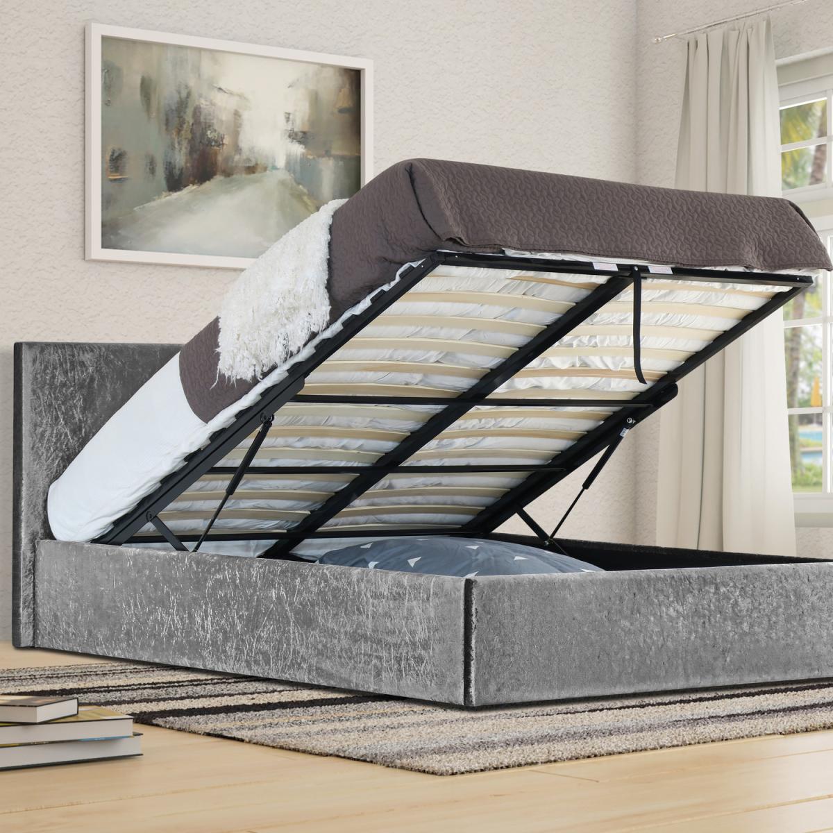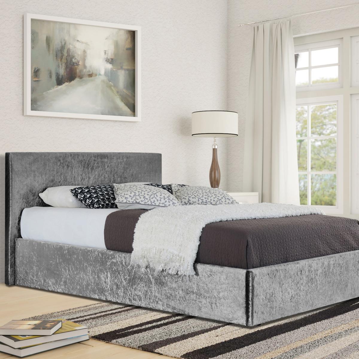 This crushed velvet upholstered ottoman bed frame, add real presence to any bedroom as well as an innovative solution to your storage needs. It features an upholstered headboard and foot end, with padded side rails. The headboard and foot end feature colour co-ordinated classic style. with a generous straight to floor storage depth of 26cm (approx.) and our wooden sprung slatted base, the luxury shimmer fabric, is available in a choice of colours, Ice, Silver, Truffle and chocolate.
