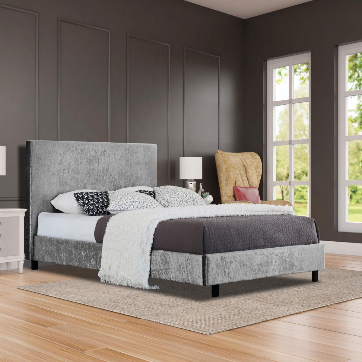 This modern bed frame is upholstered in a soft crushed velvet fabric and makes an elegant bedroom centrepiece with this stylish, minimalist design. It is further complemented by the high padded panelled headboard with stitching detail and low footboard with a sturdy metal frame and posture sprung slatted base.