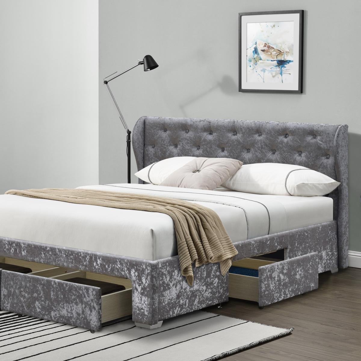 This stylish bed is beautifully upholstered in silver crushed velvet fabric. It features a stylish winged headboard. It is made from a solid wooden frame and has a sprung slatted base to give support to the mattress and give you a fully supportive and comfortable night's sleep. This bed comes with 4 handy storage drawers.