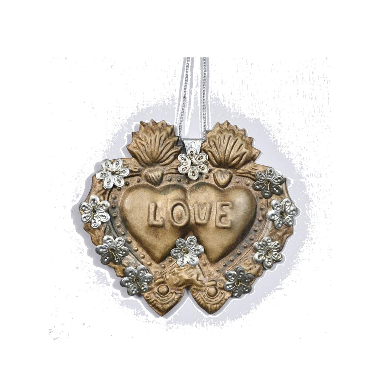Inspired by the enchanting 'sacred heart' depicted in religious artwork, this ex-voto is embossed with passionate "love" in centre. Traditionally hung on the walls of churches, homes and shops, ex-votos are used as an offering or vow to bring luck and happiness. Hang this stunning heart individually, or mix with more pieces from our collection of Milagros and ex-votos for a dazzling display! This ex-voto has antique gold finish with silver flowers to enhance the beauty. Size : 13X1X12cm Comes with string so it's ready to hang and admire!