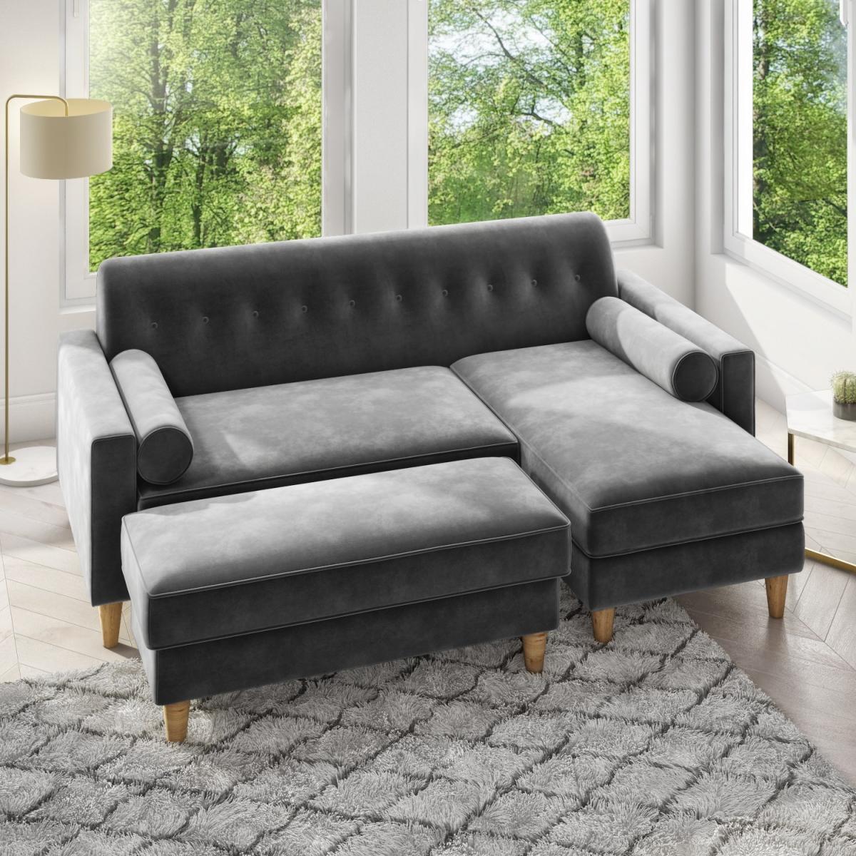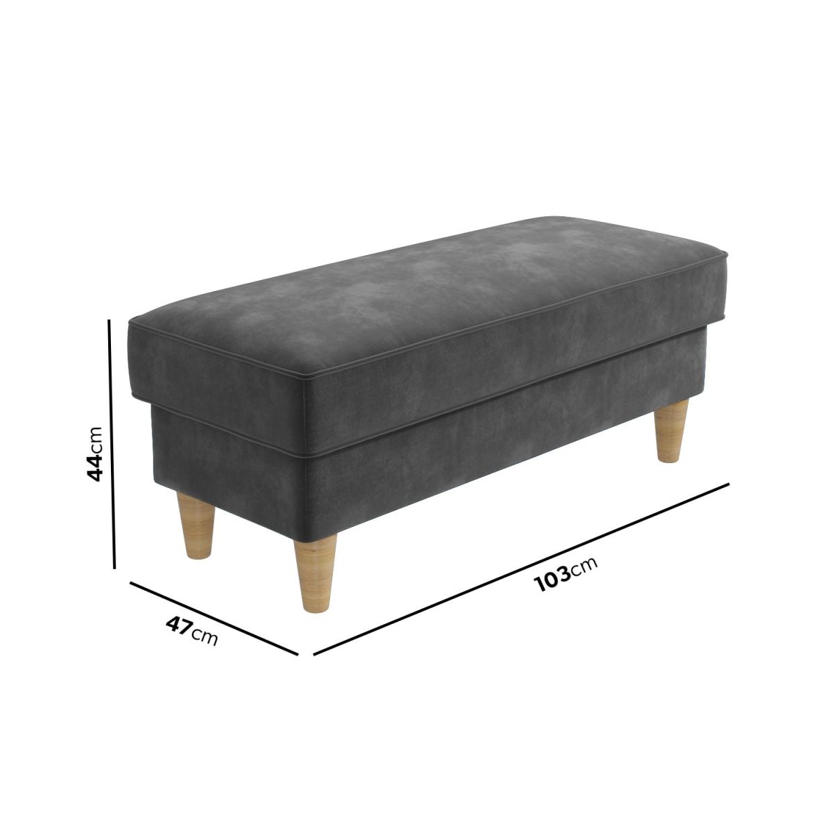 Features we love Luxurious velvet footstool with light wooden legs. Offers additional seating for those unexpected guests. Use to display decorative trays or accessories. On trend silver-grey velvet upholstery Complete the look with the matching Idris sofa. All about me. Add a touch of luxury to your home with the Idris velvet footstool. Use as a footstool a bench to offer some extra seating for your guests or create a stunning centrepiece in your living room with a stack of books and a candle on a decorative tray. Upholstered in a super stylish silver-grey velvet this piece will never go out of fashion and is also the perfect match for our Idris velvet corner sofa. Just attach the light wooden legs and you’re ready to relax in style with your footstool. Need to know. Dimensions. H44 x W103 x D47 cm Packaging dimensions. H36 x W105 x D49 cm Colour. Silver-grey Finish. Velvet upholstery and light wooden legs Material. Velvet and light wood Assembly required. Yes