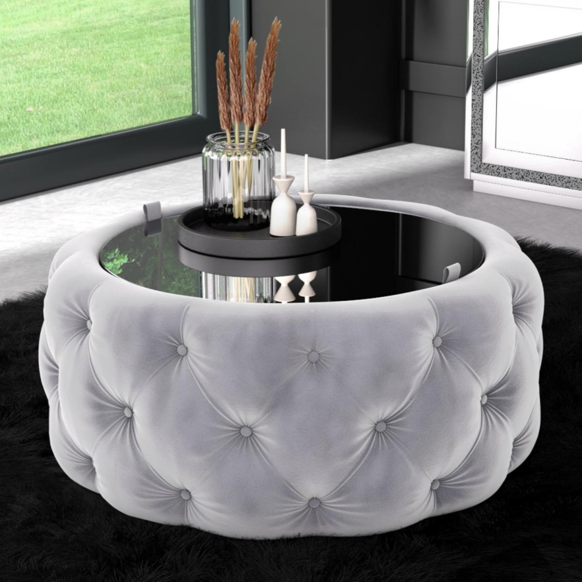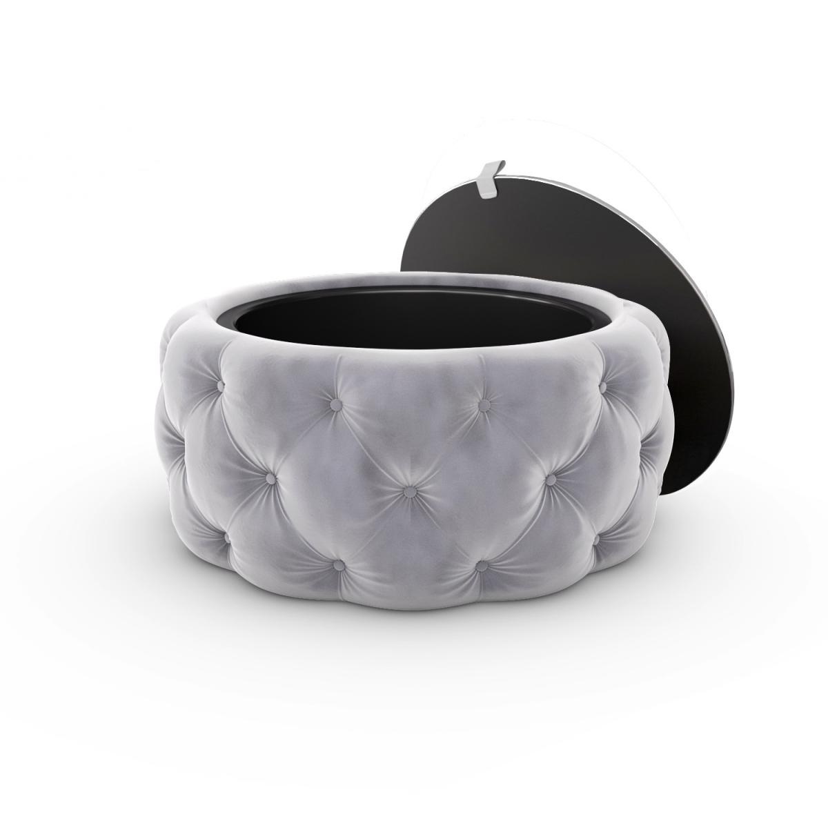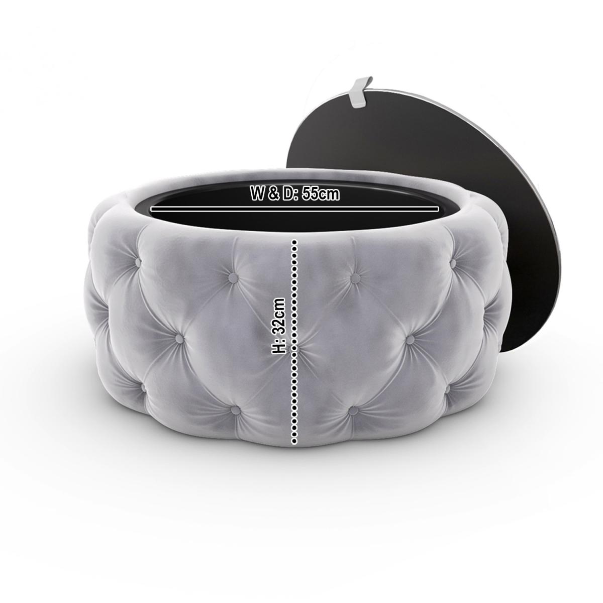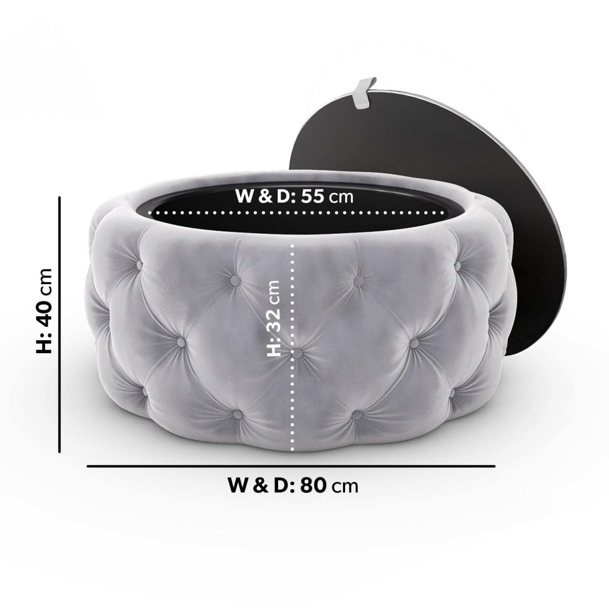 Features we love Beautifully upholstered in plush grey velvet Deep buttoned detailing adds a touch of luxury Mirrored glass top lifts to reveal ample storage space Perfect for storing all your living essentials. Feature piece suitable for any room in your home. Also available in other colours. Need to know. Dimensions. H40 x W80x D80 cm Interior dimensions. H32 x W55 x D55 cm Shape. Round Colour. Grey Finish. Velvet upholstery and tempered glass top Material. Eucalyptus and plywood frame and velvet polyester fabric Weight. 20kg Assembly required. No..