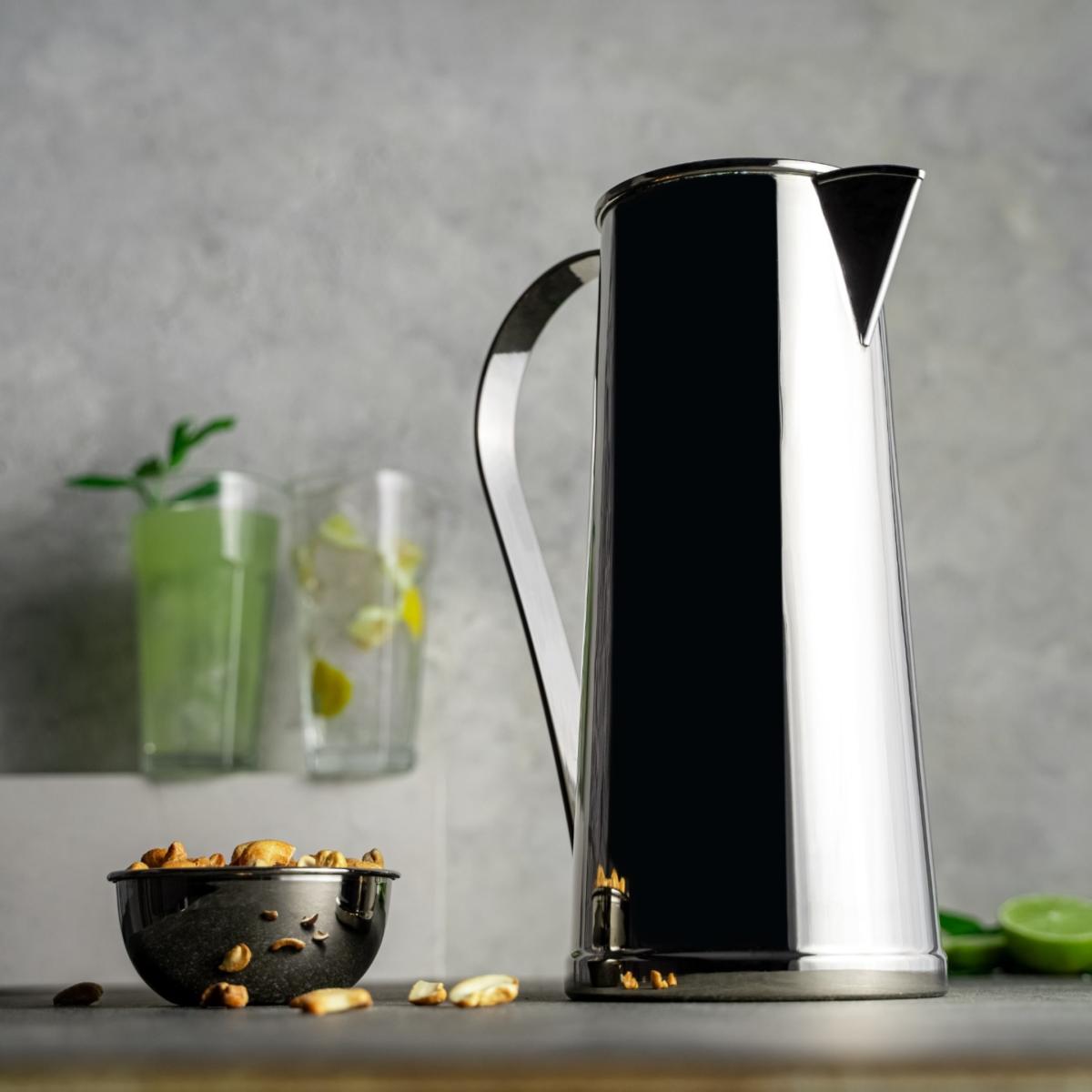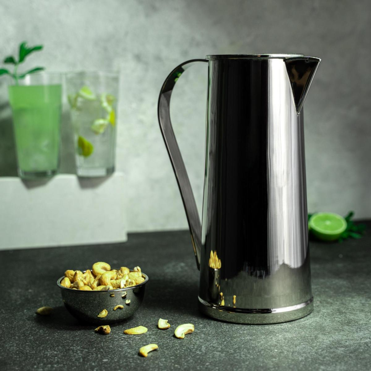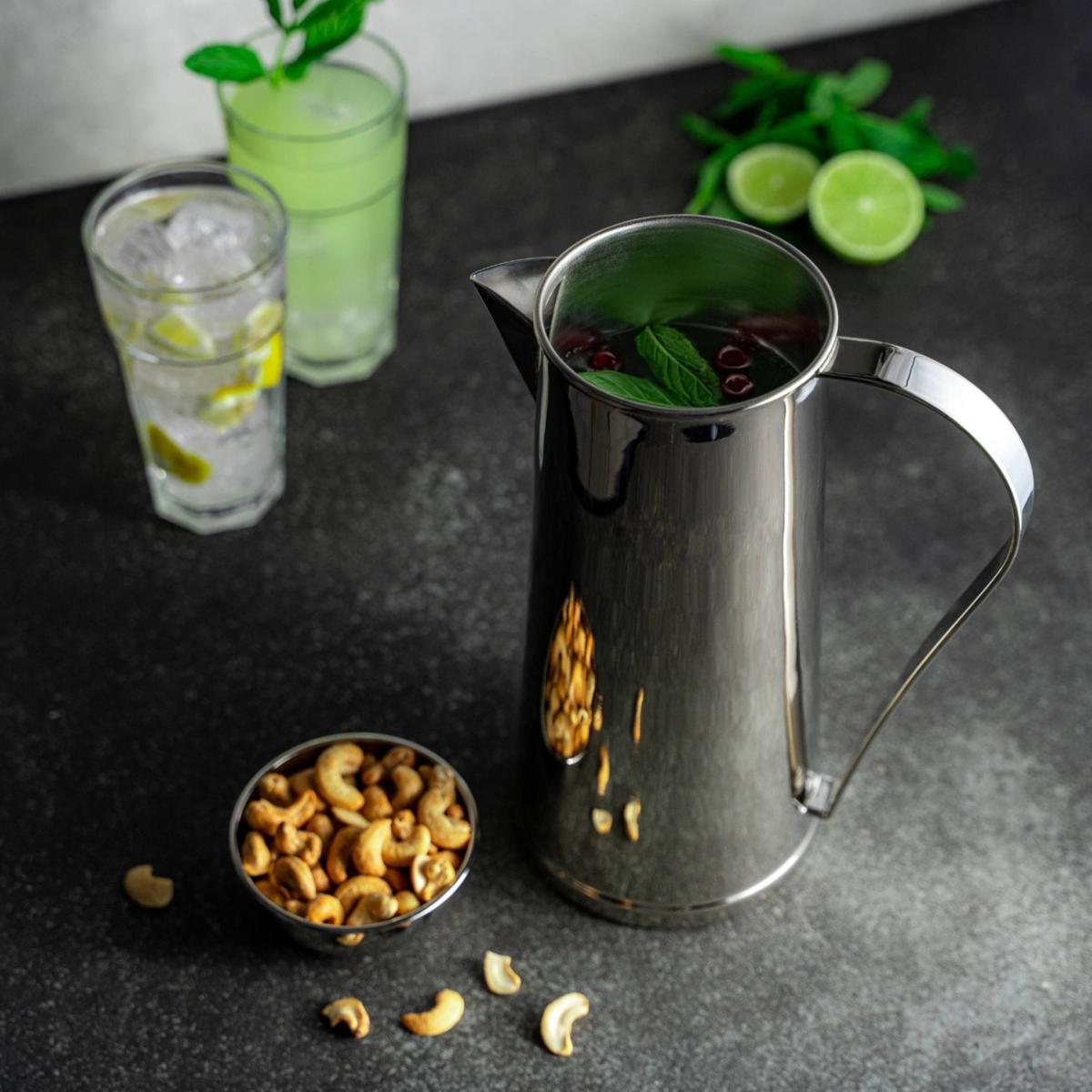 Combining elegance and functionality, this chrome-plated pure copper pitcher is designed to bring a touch of sophistication to your table. Its smooth, reflective surface complements both modern and traditional decor effortlessly. The ergonomic handle and precision spout ensure a seamless pouring experience. Perfect for serving water, fresh juices, or elegant cocktails, this handcrafted pitcher showcases the timeless beauty of traditional copper craftsmanship with a contemporary twist. A piece that supports both a stylish and healthy lifestyle, it is ideal for special occasions or everyday use.