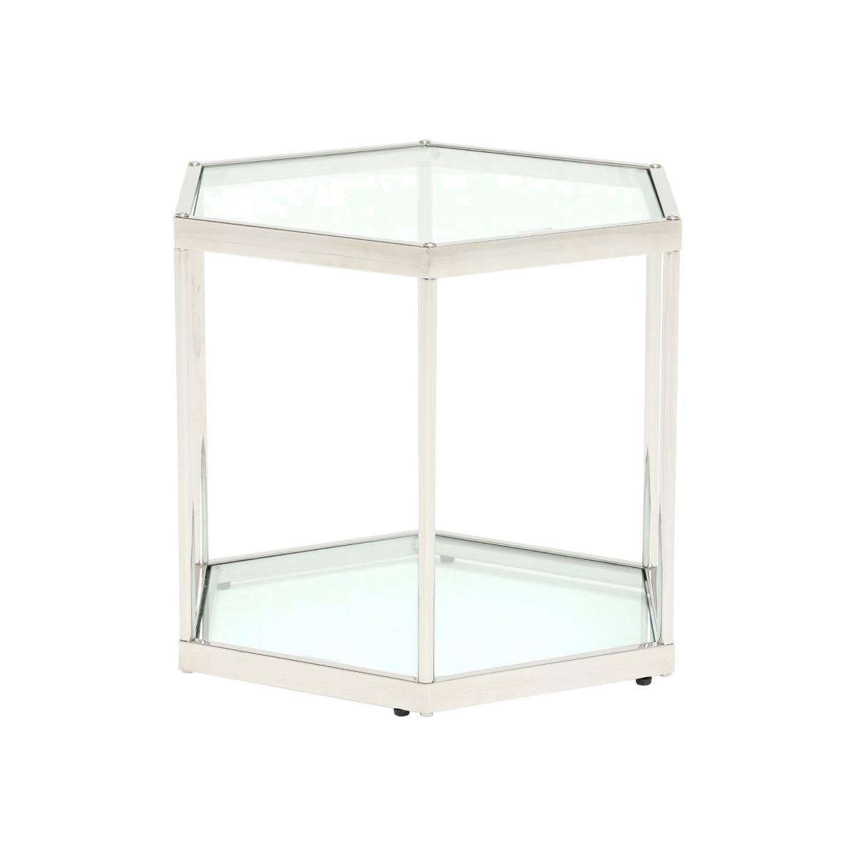 I really like the silver hexagon side table for its clean, geometric shape that adds a touch of modernity to any space. It's versatile enough to work well in contemporary interiors, especially those with a minimalist or industrial vibe. You can style it as a functional coffee table in a lounge or as a side table next to a sofa or armchair. Practical tips include pairing it with monochrome tones or metallic accents to enhance its sleek look, and it works nicely with both glass and fabric surfaces on nearby furniture for a layered, textured feel. Its small footprint makes it ideal for corner spots or as an unobtrusive yet stylish bedside option.