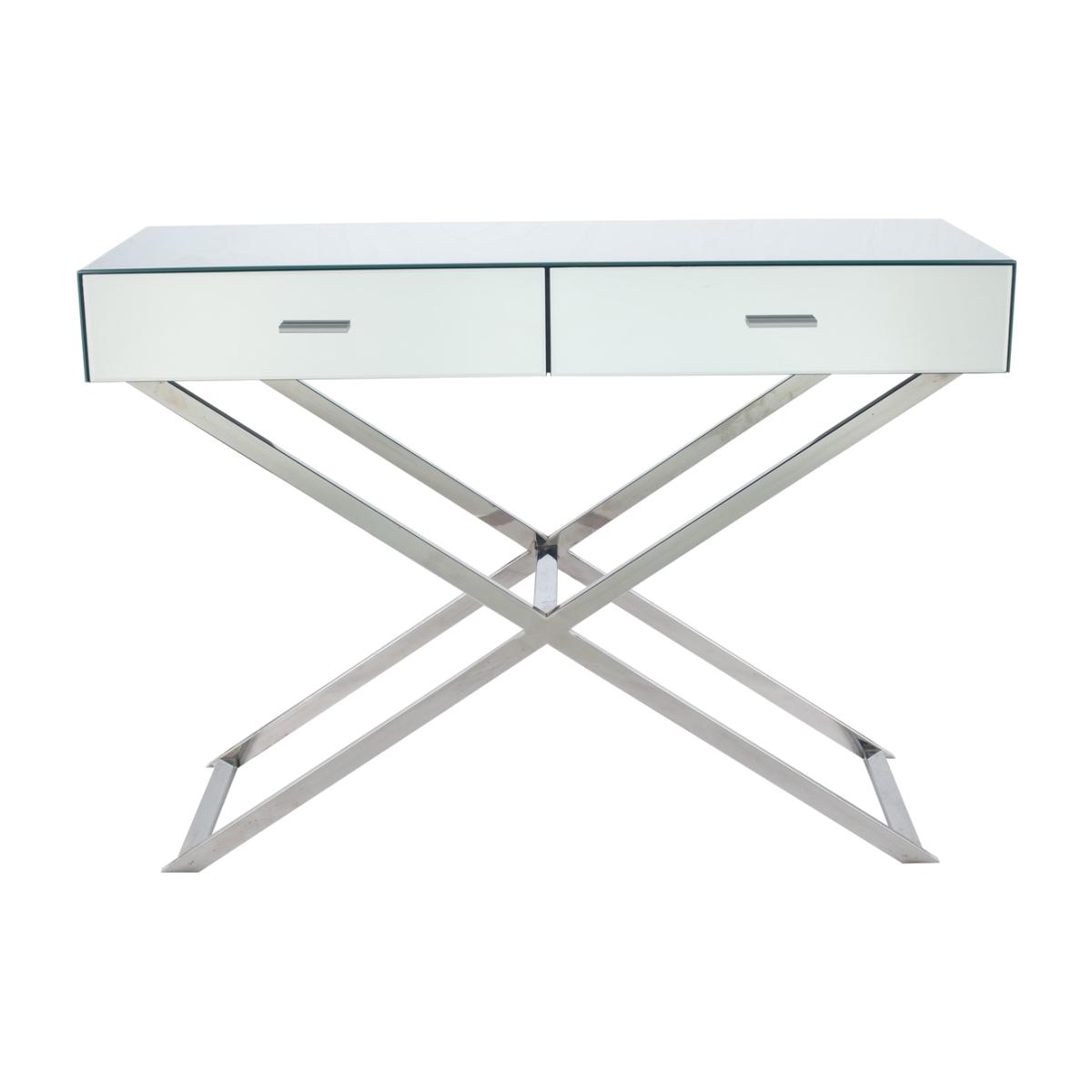 Features we love. Beautiful mirrored glass console table Contemporary design; it'll suit many home interiors and add an elegant touch. The combination of materials makes it highly durable its sure to last the test of time. Matching pieces are available in the Lily collection. Fully assembled and ready to use as you get it home All about me. Simplistic in design and elegantly presented this Lily mirrored glass square console table has beautiful slim line designed legs with mirrored glass top and plenty of storage space with the two spacious drawers. Need to know. Dimensions. W110 x D39.5 x H80 cm Colour. Silver Finish. Glass Material. Iron and; glass Assembly required. No.