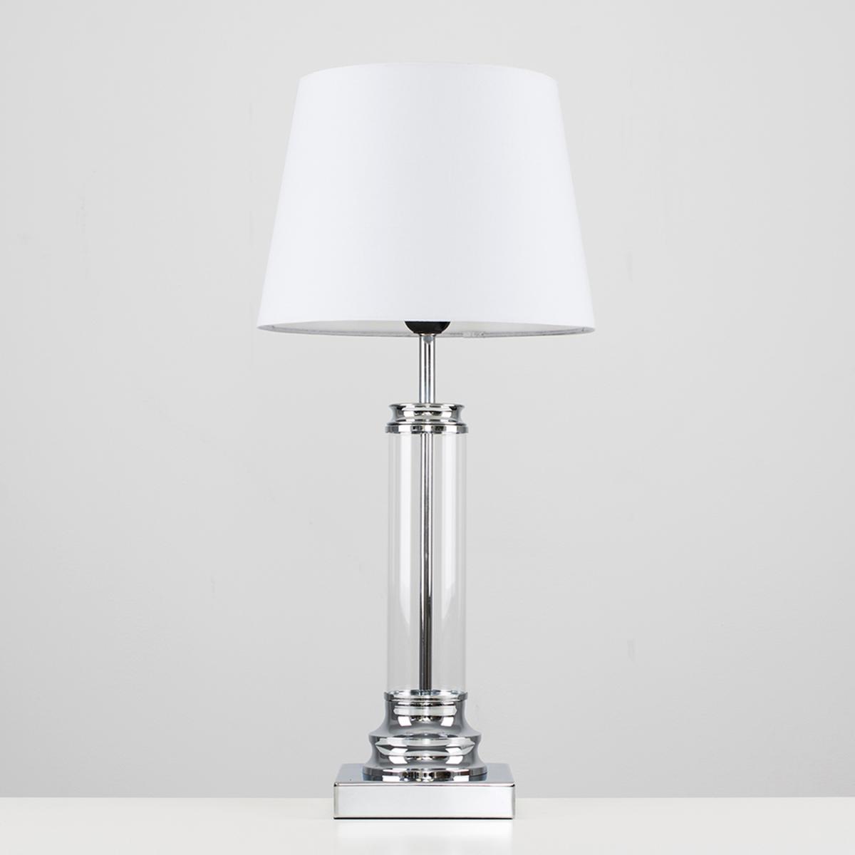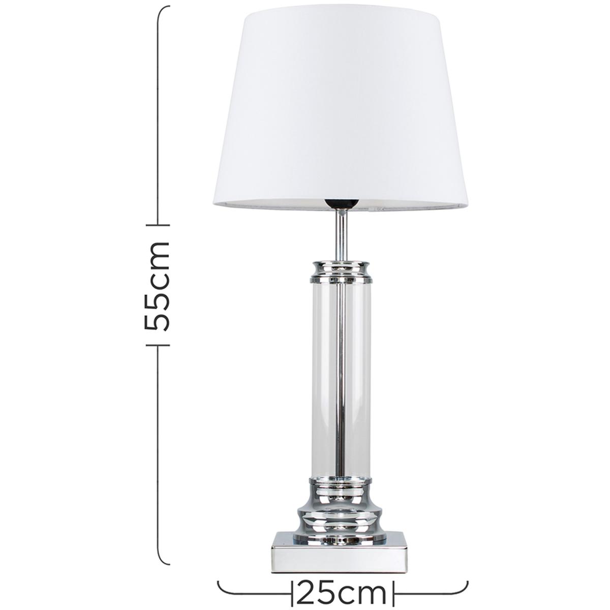 Modern column stem touch table lamp in a clear glass finish complete with a white polycotton tapered light shade. The light can be set to 4 stages, off, a low level light for mood lighting, a medium level light for general lighting and a high level light which is the brightest setting to create an intense pool of light. This contemporary light is a great way to update any living area to create a relaxing ambient atmosphere. Ideal for lounges, bedrooms, hallways and other living areas. Please Note This lamp requires dimmable bulbs. Not suitable for standard LED or energy saving bulbs.